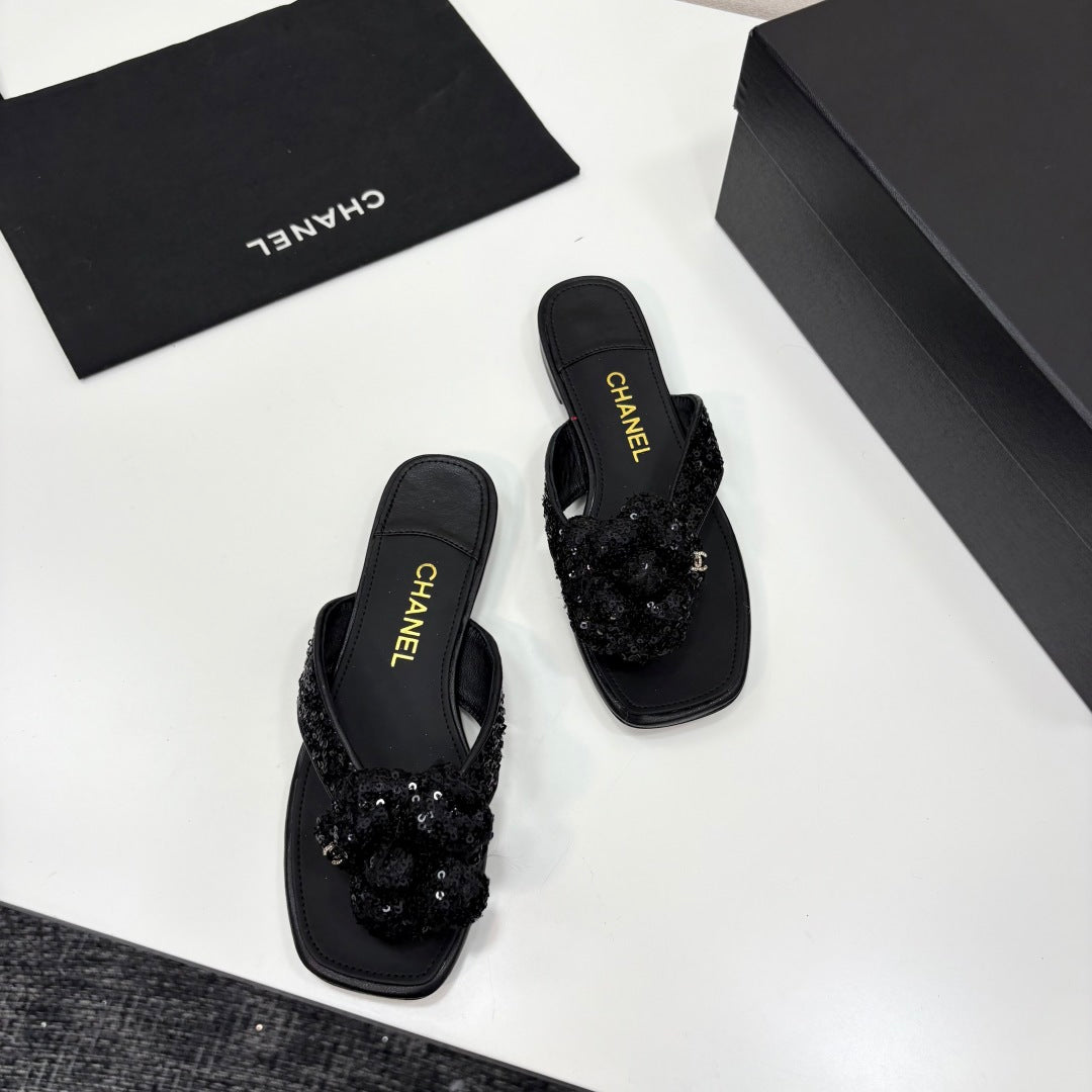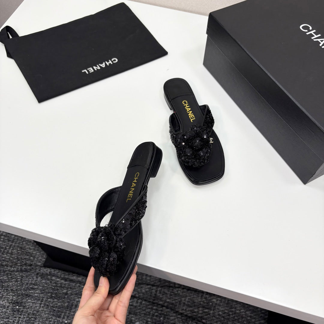 CC 25 Camellia Thong Sandals Black Coarse Glitter Fabric And Sheepskin 368835
