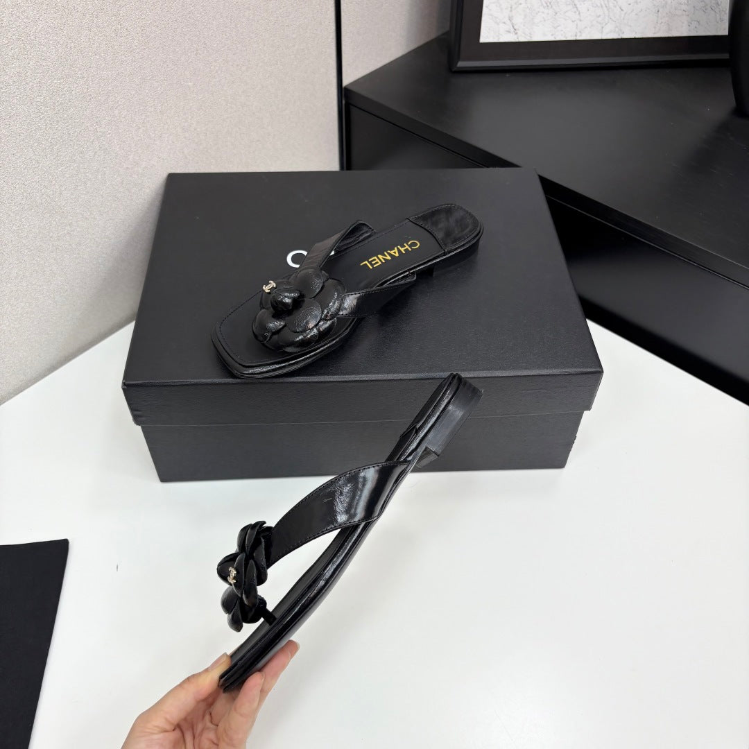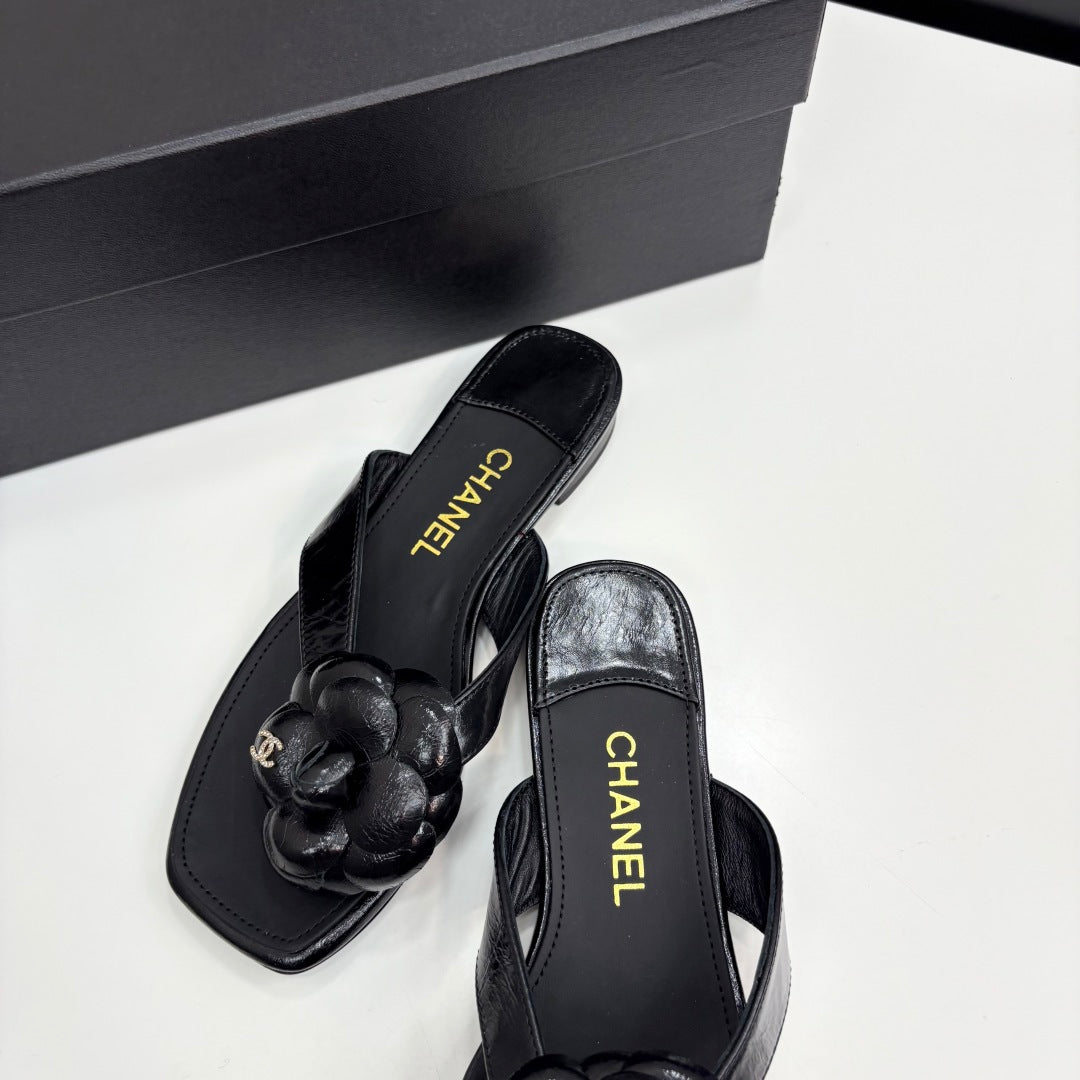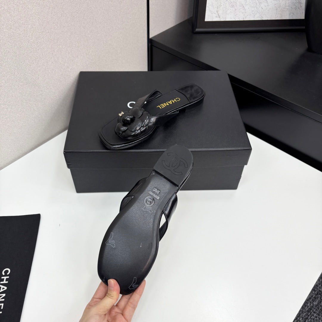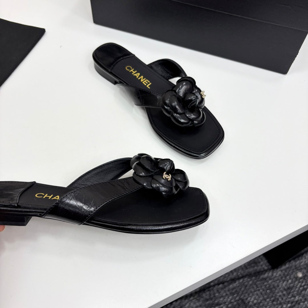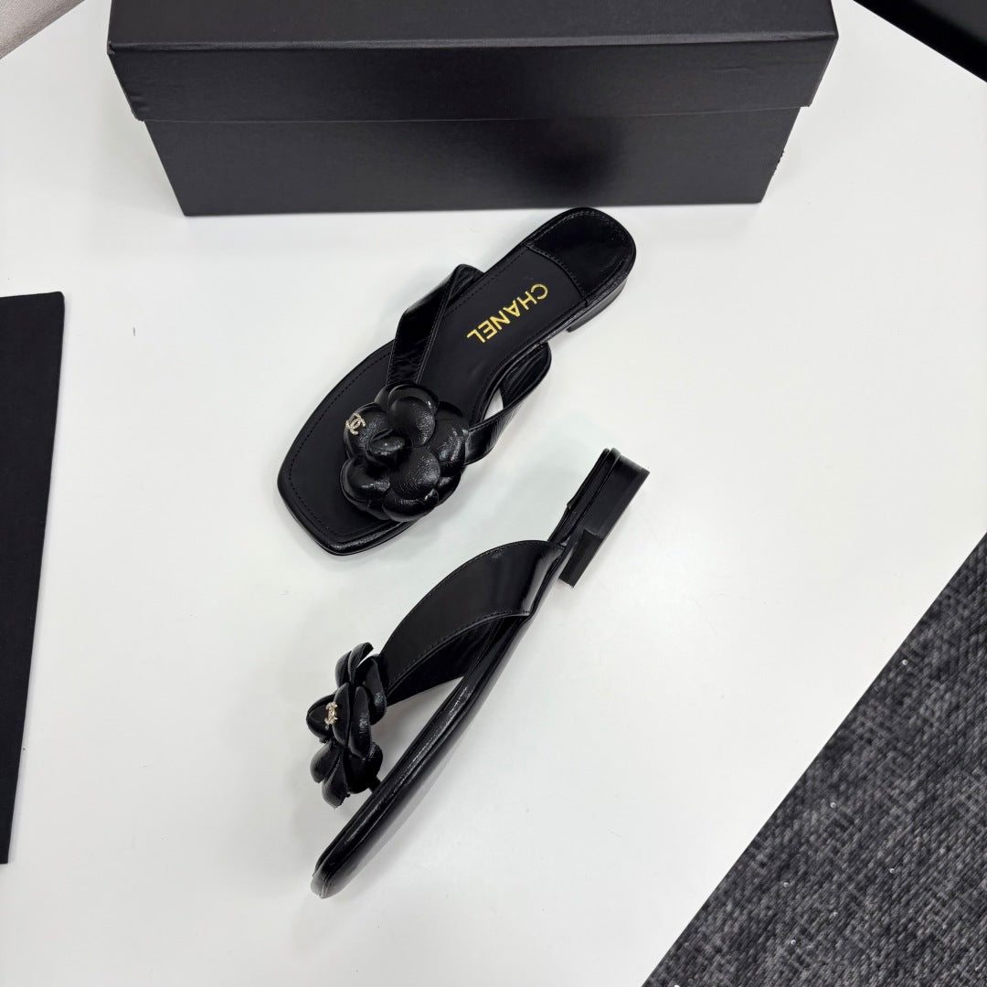 CC 25 Camellia Thong Sandals Black Sheepskin 368839