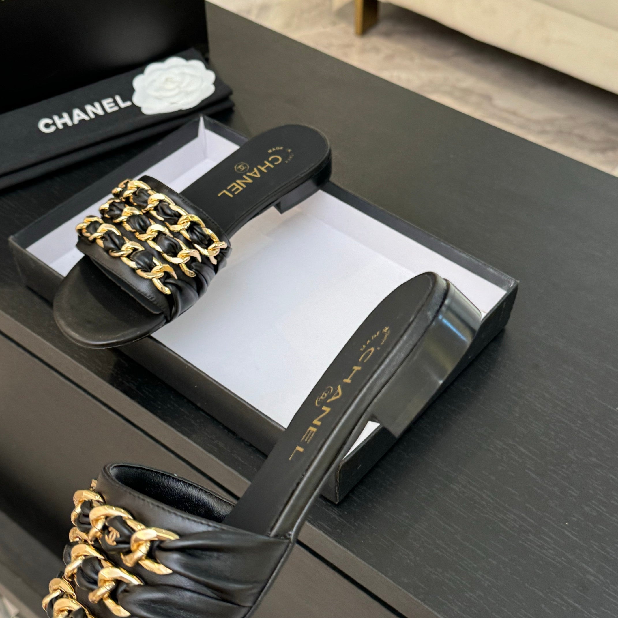 CC 25B Flat Mule Sandals Black Sheepskin With Chain 373814