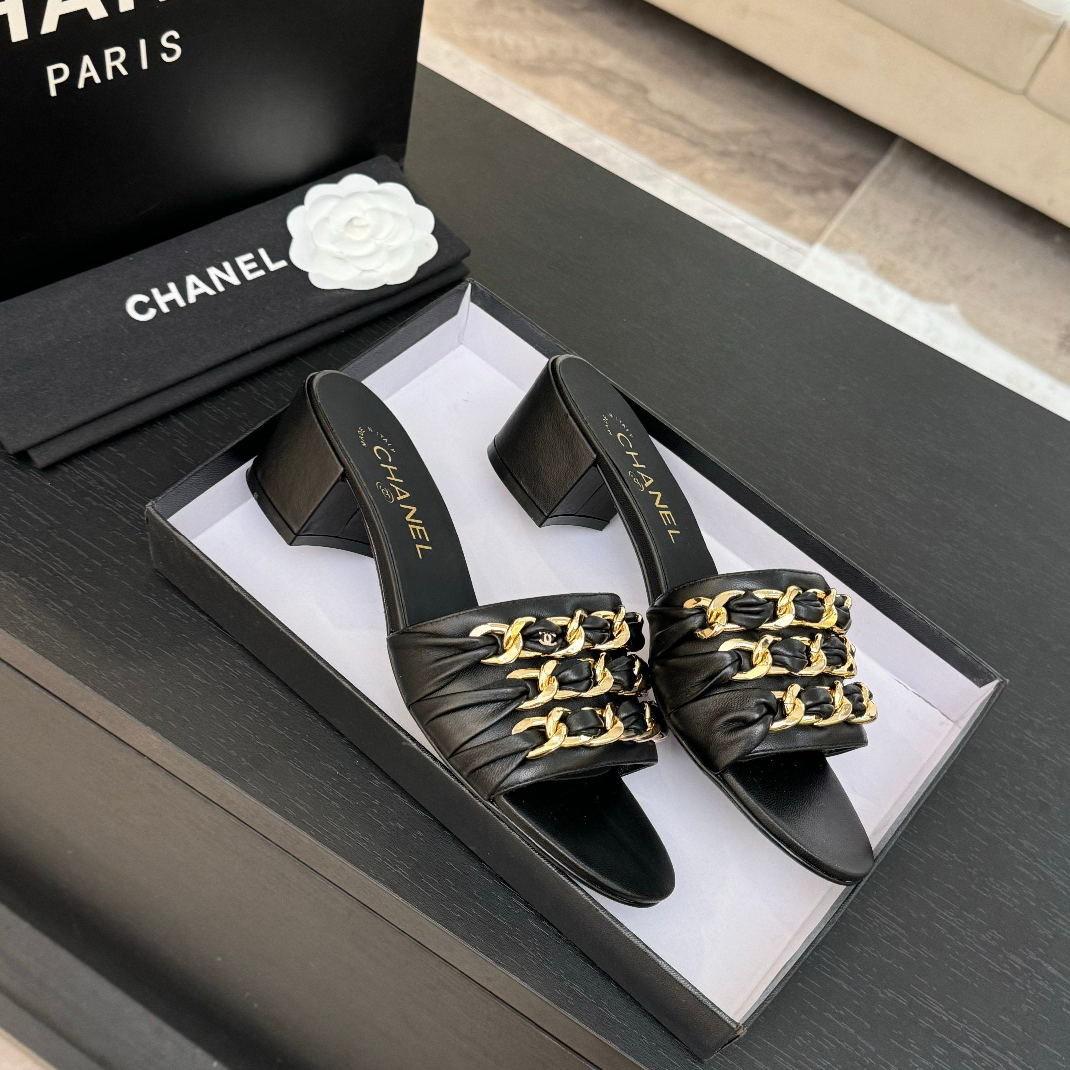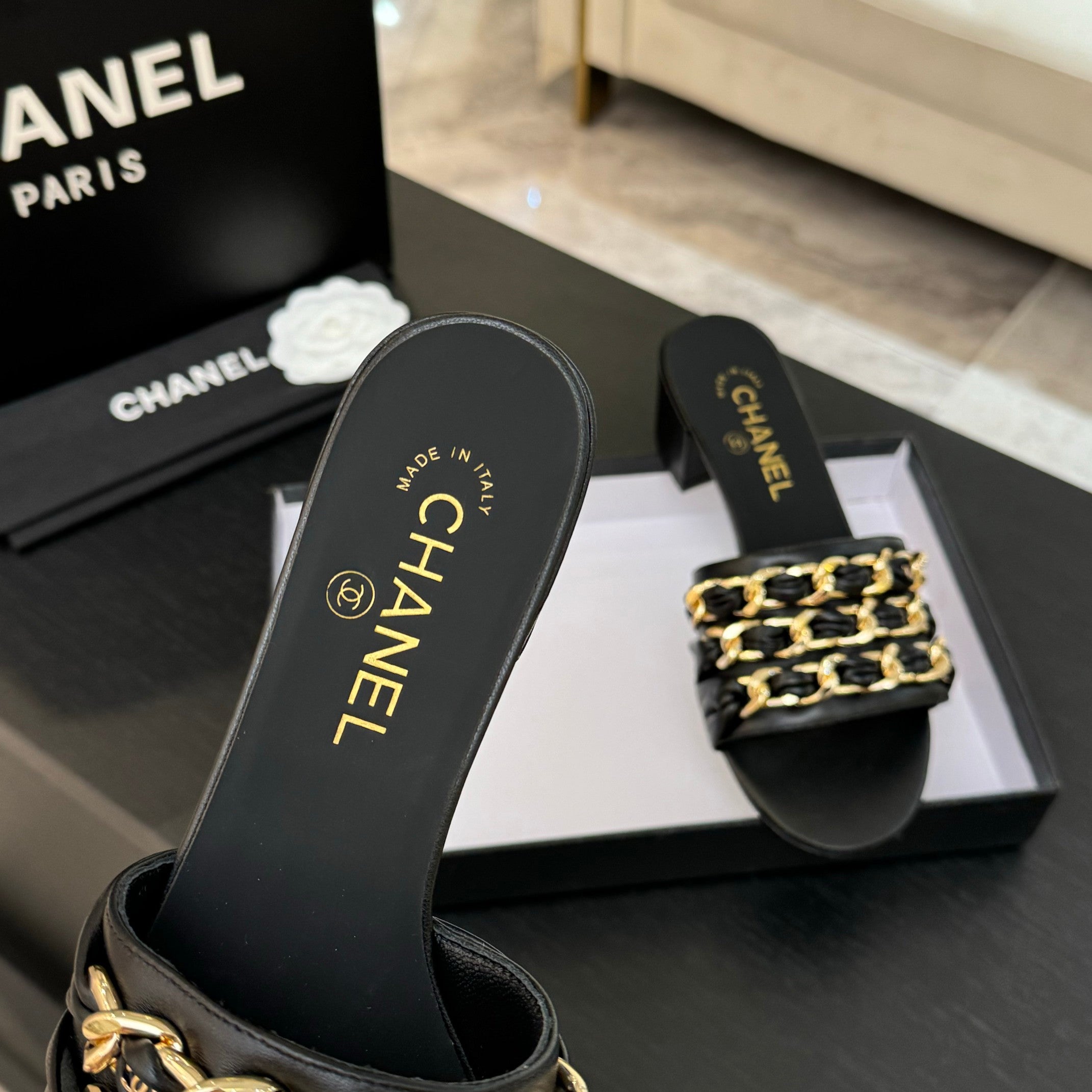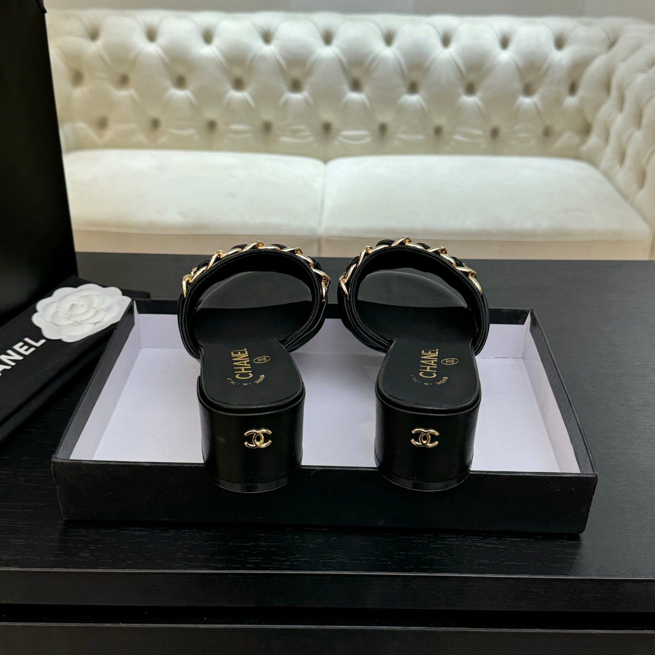 CC 25B Heel Mule Sandals 50mm Black Sheepskin With Chain 373819