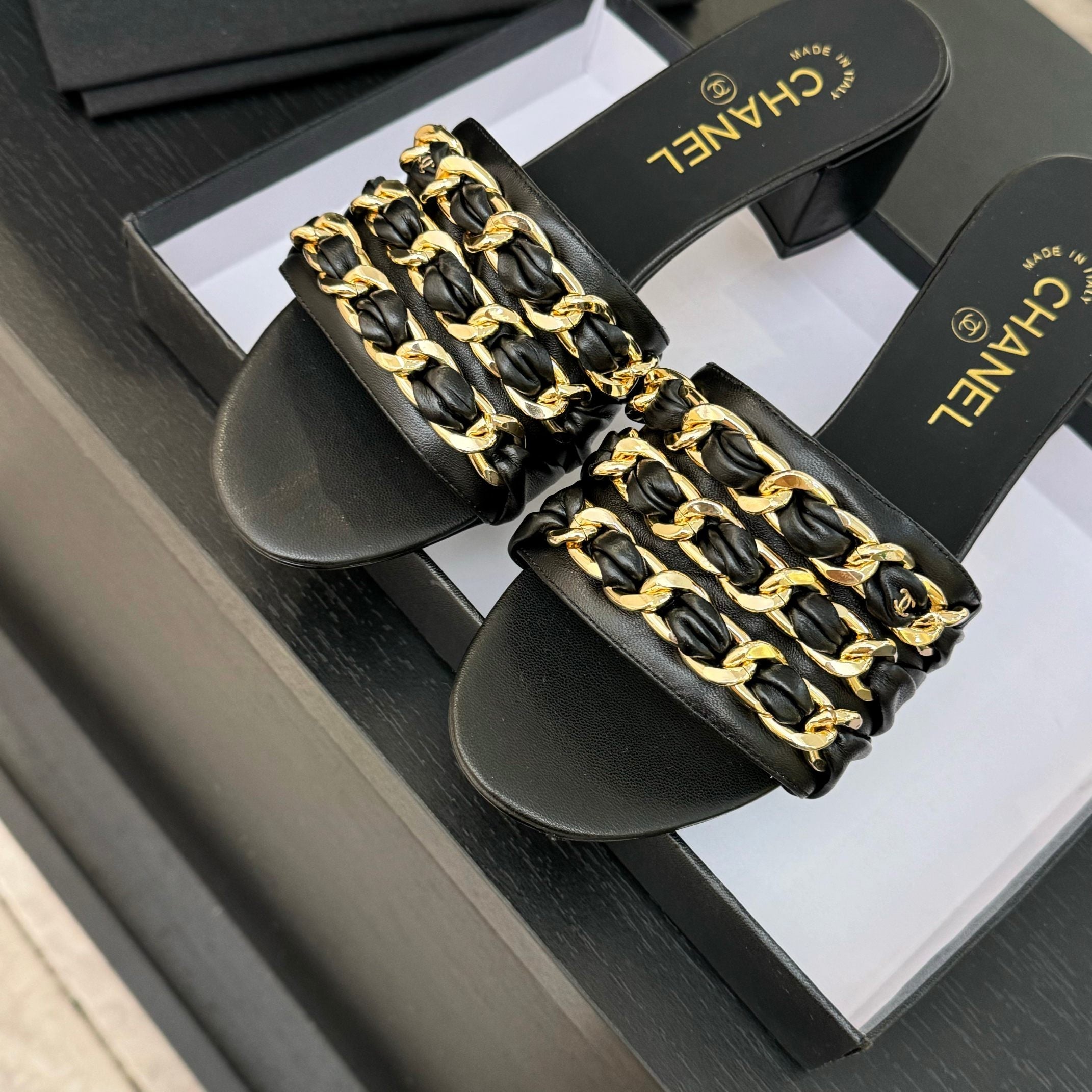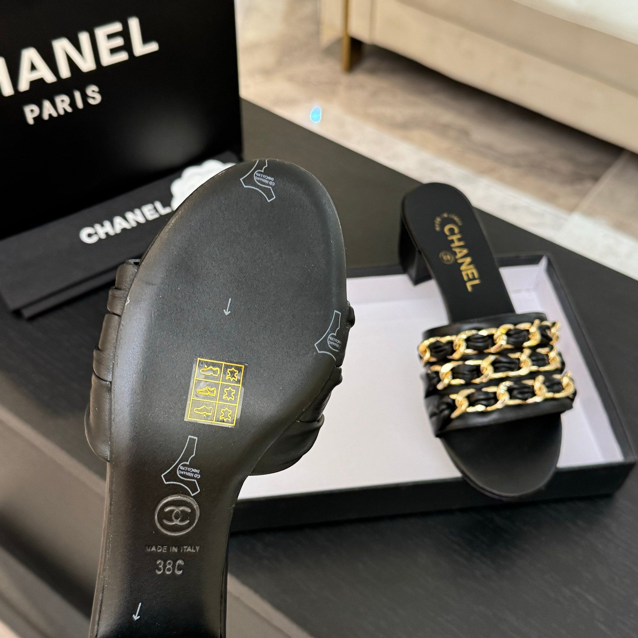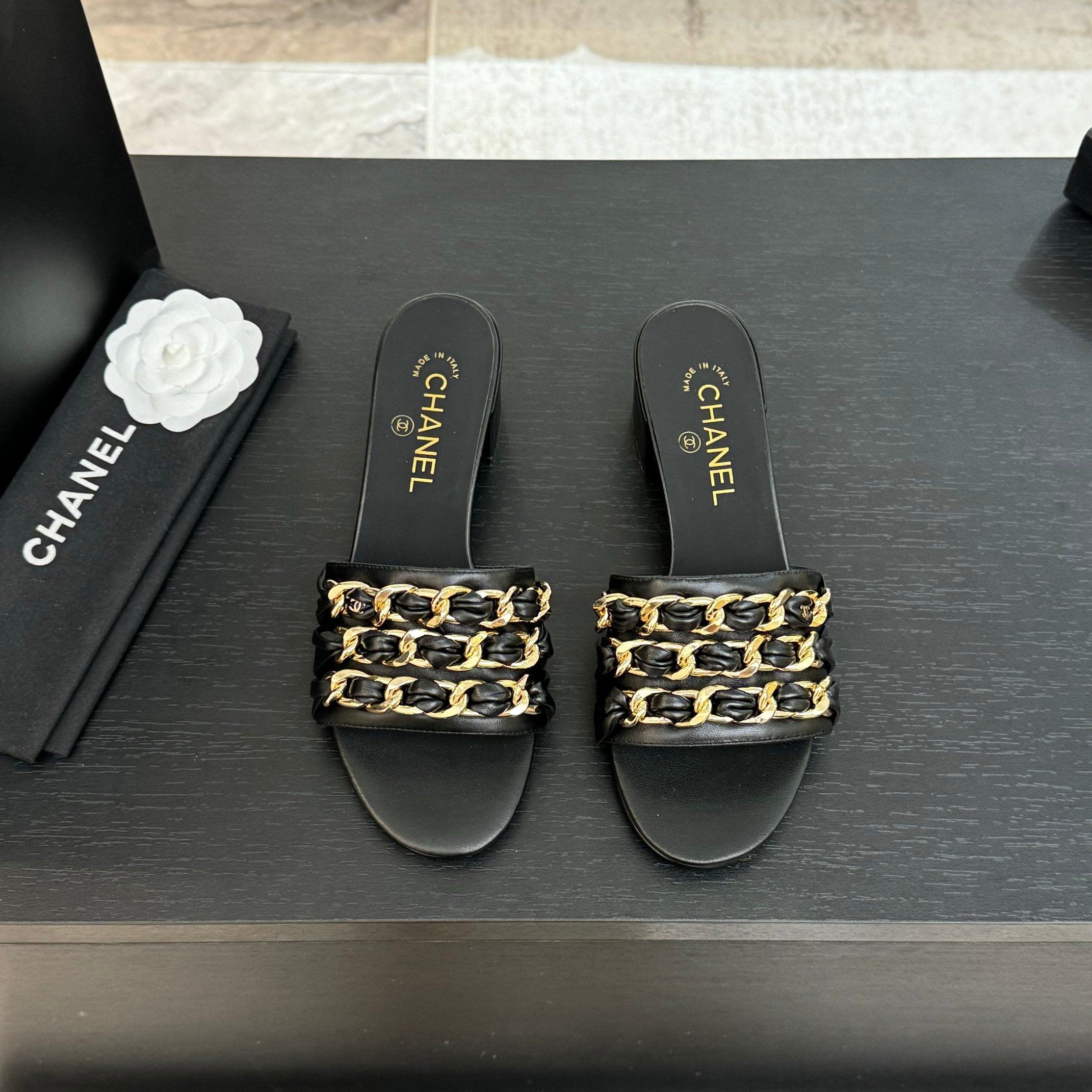CC 25B Heel Mule Sandals 50mm Black Sheepskin With Chain 373819