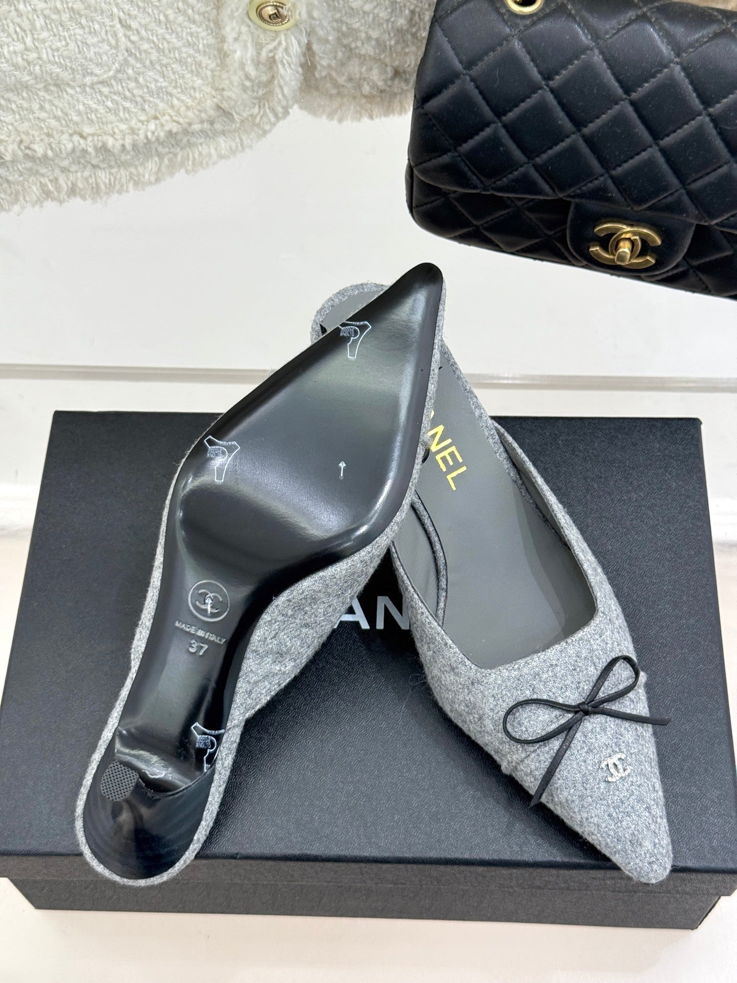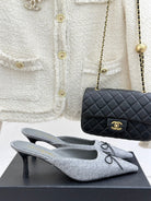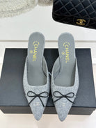 CC 25C Bowknot Pointed High Heel Half Slippers 60mm Grey Linen 265661