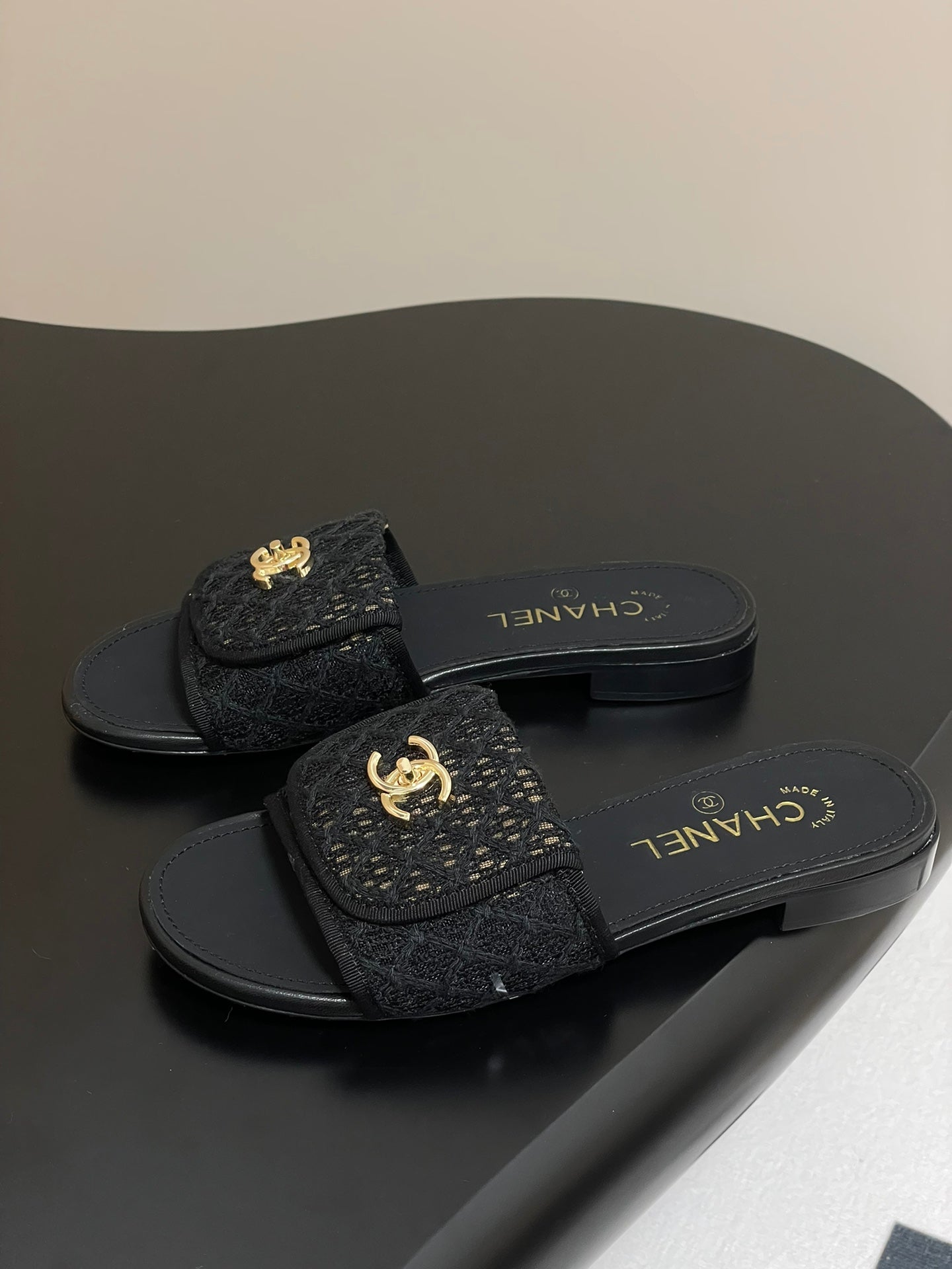 CC 25S Buckle Bag Mule Black Lace Fabric and Sheepskin 247589