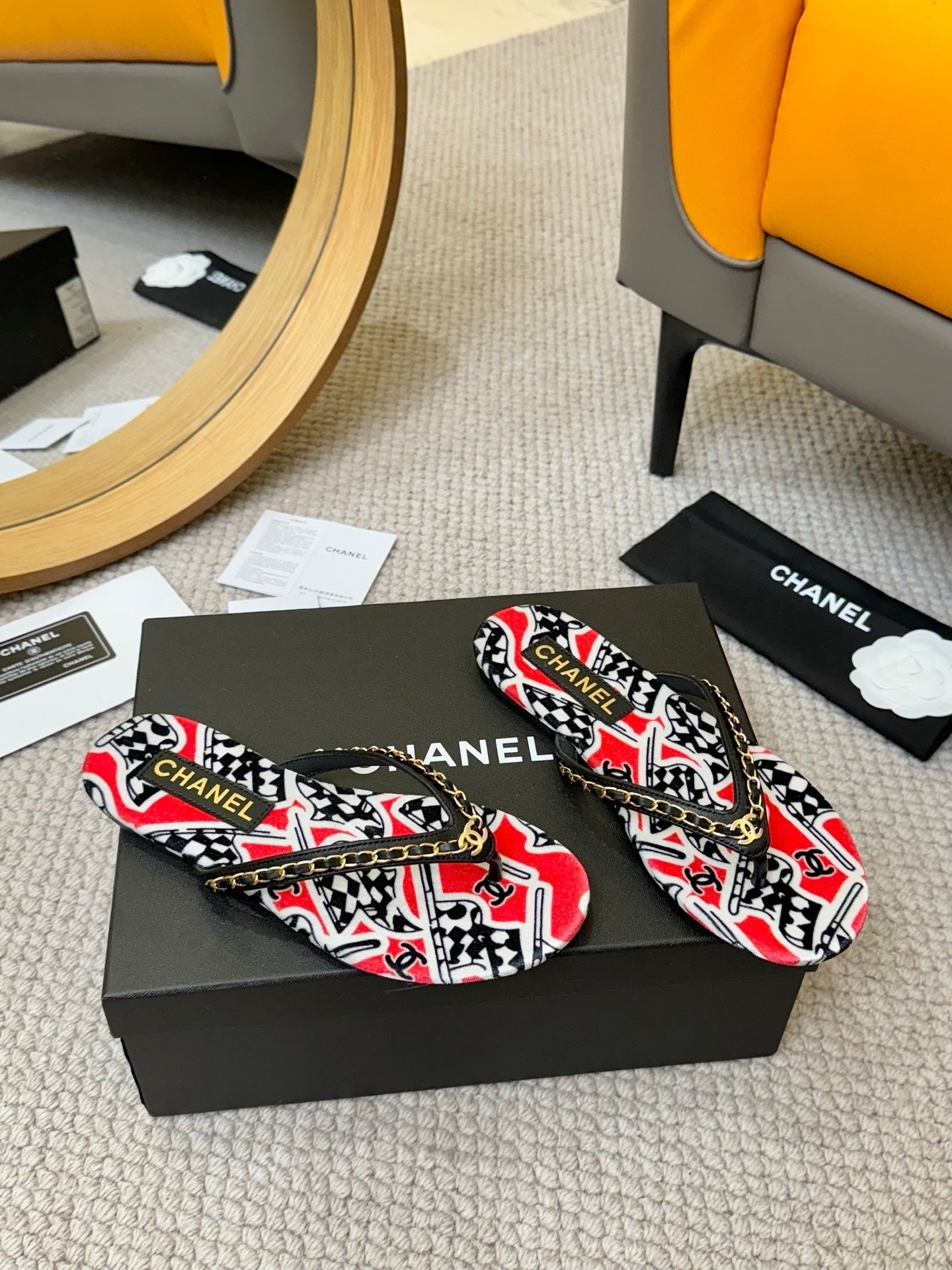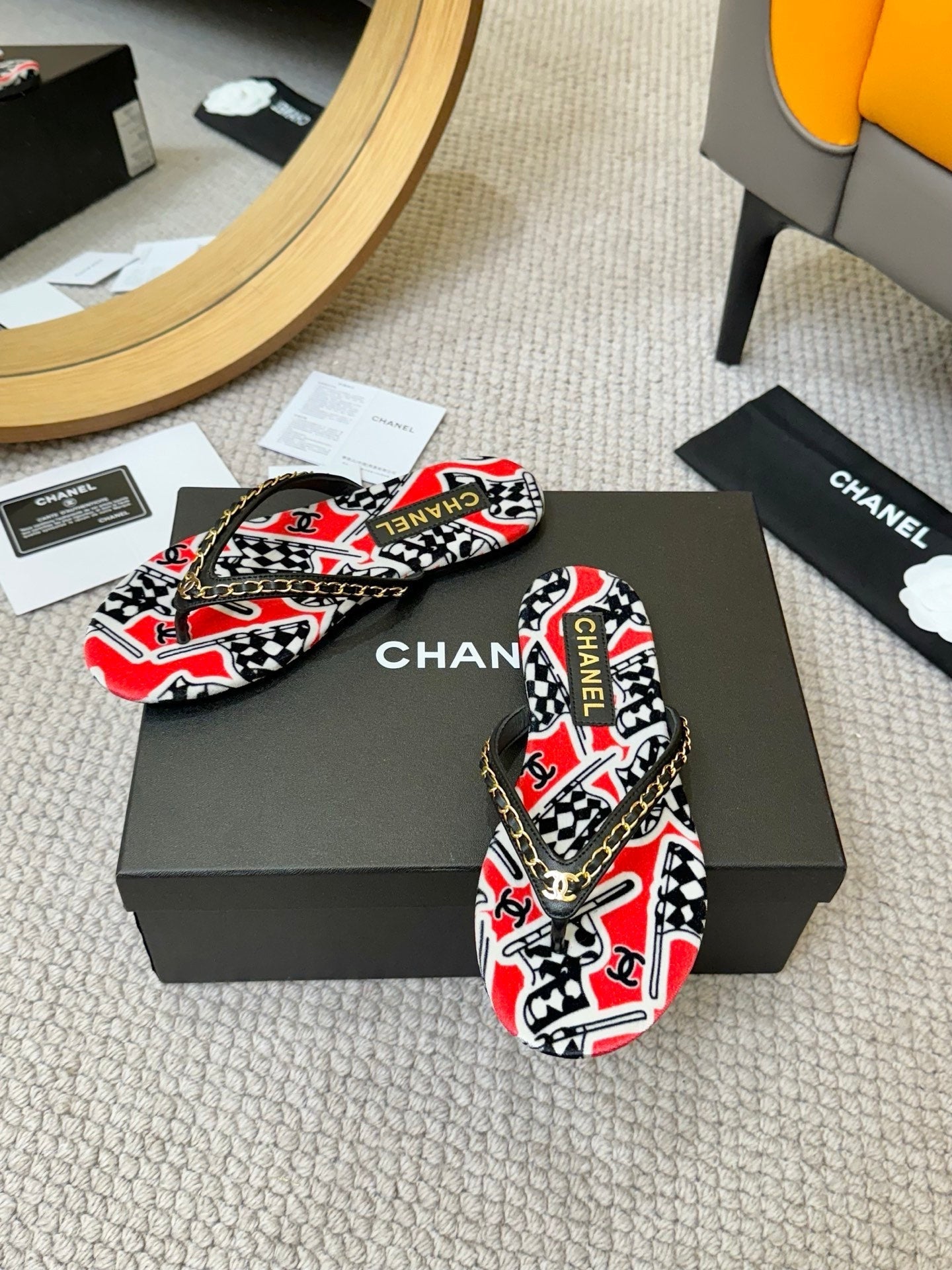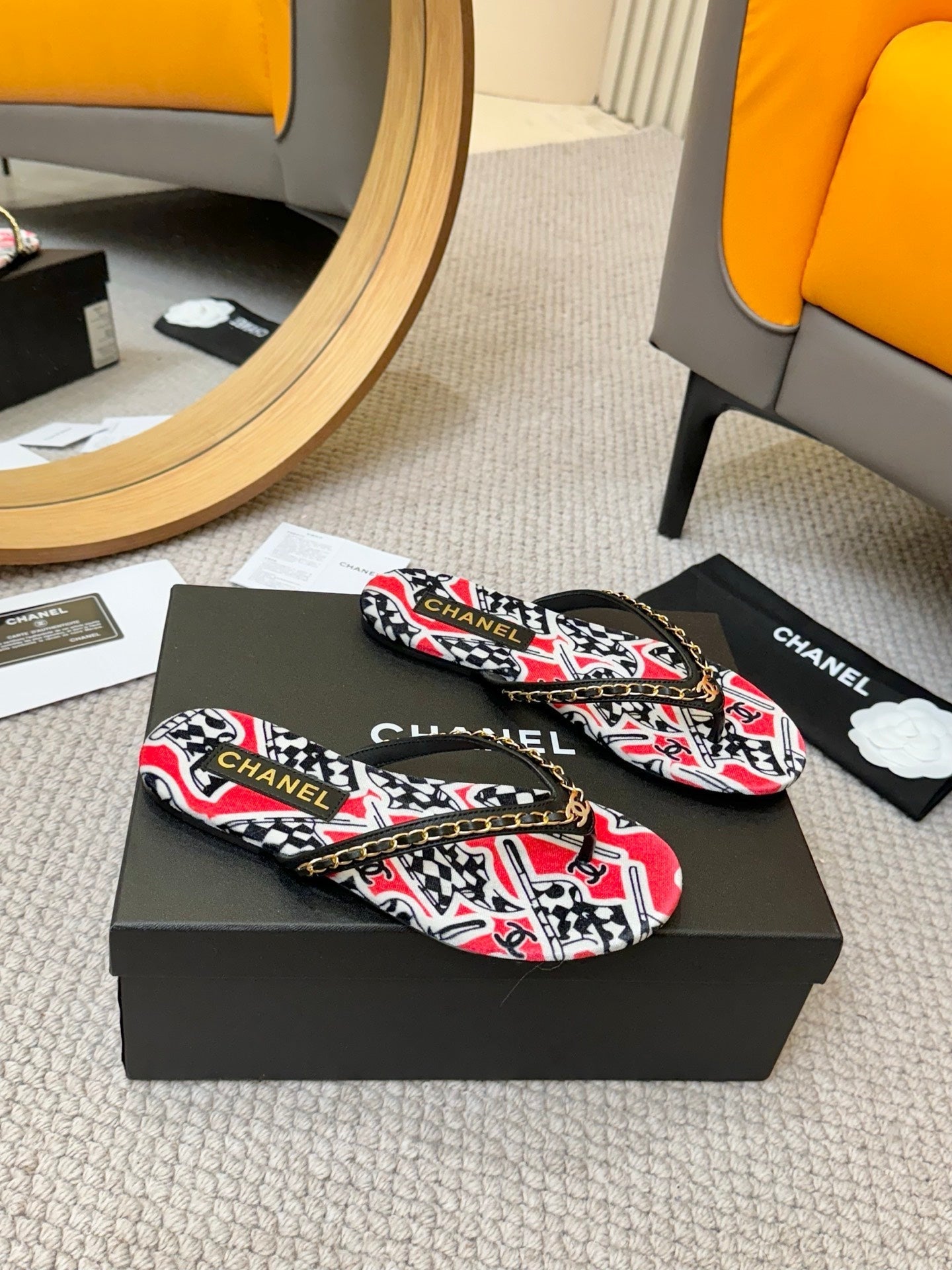 CC Chain Strap Thong Slippers Red Cloth Sheepskin Velvet 305868