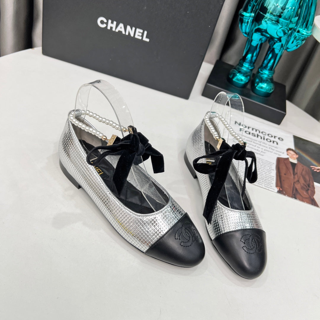 CC Mary Jane White Black Studded With Pearls Lambskin And Cowhide