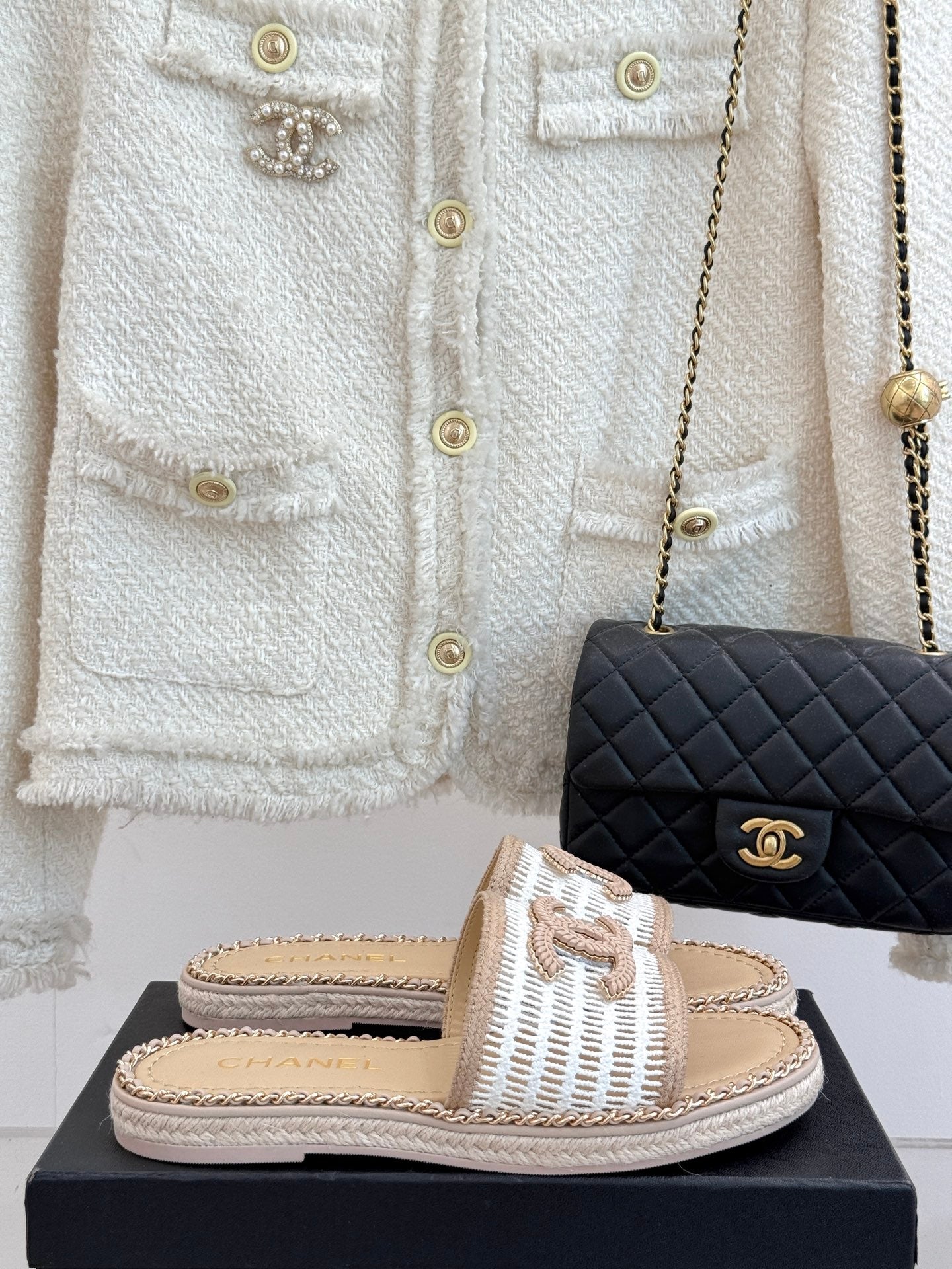CC Mesh Hollow Chain Double C Thick-Soled Slippers 20mm Beige White 265644