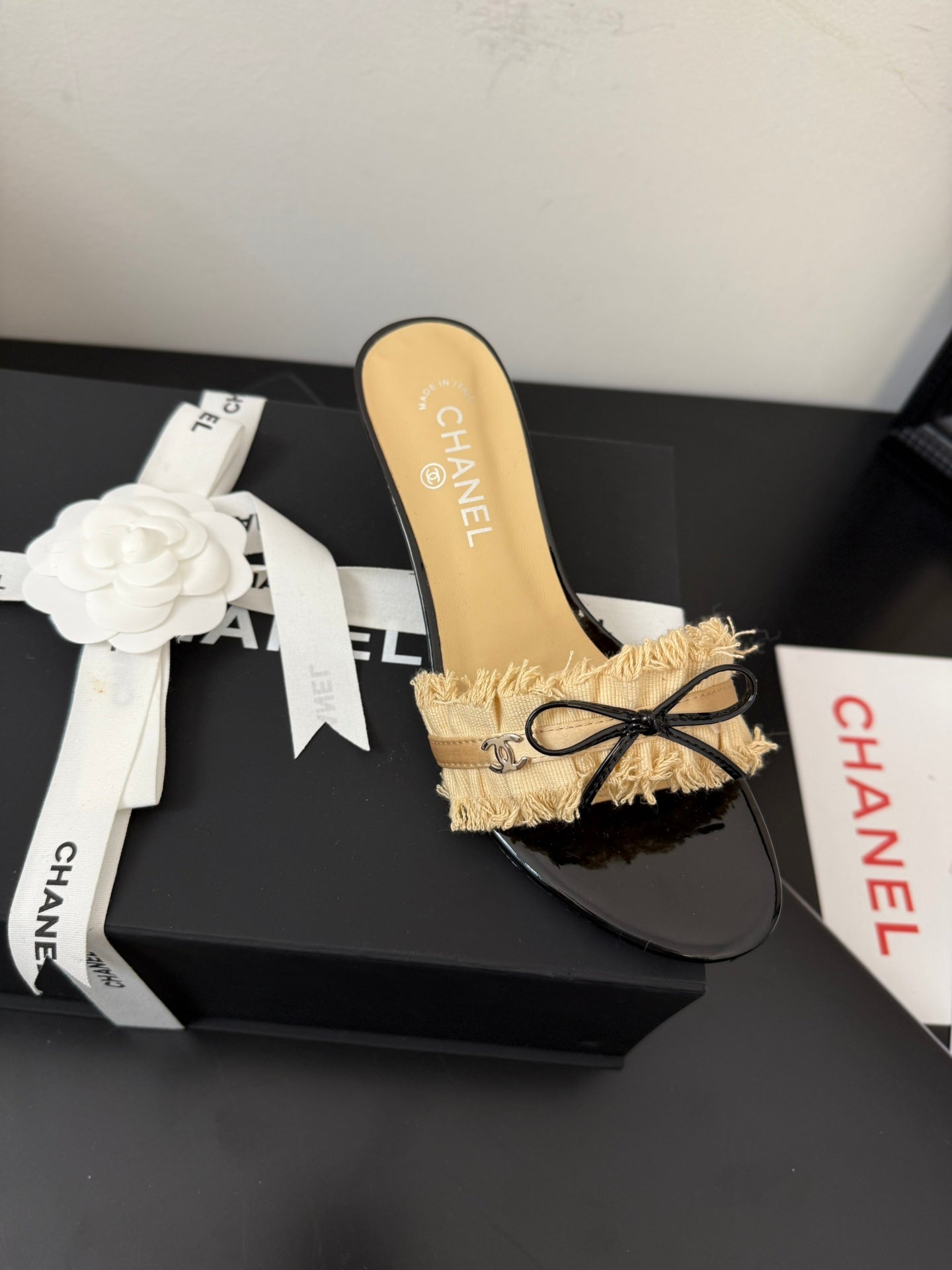 cc25 slide sandal 65mm ruffle bow heels black grosgrain gold canvas 233583