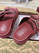 SANDALS IN NAVY RED SUEDE EMBOSSED LOGO SILVER HARDWARE