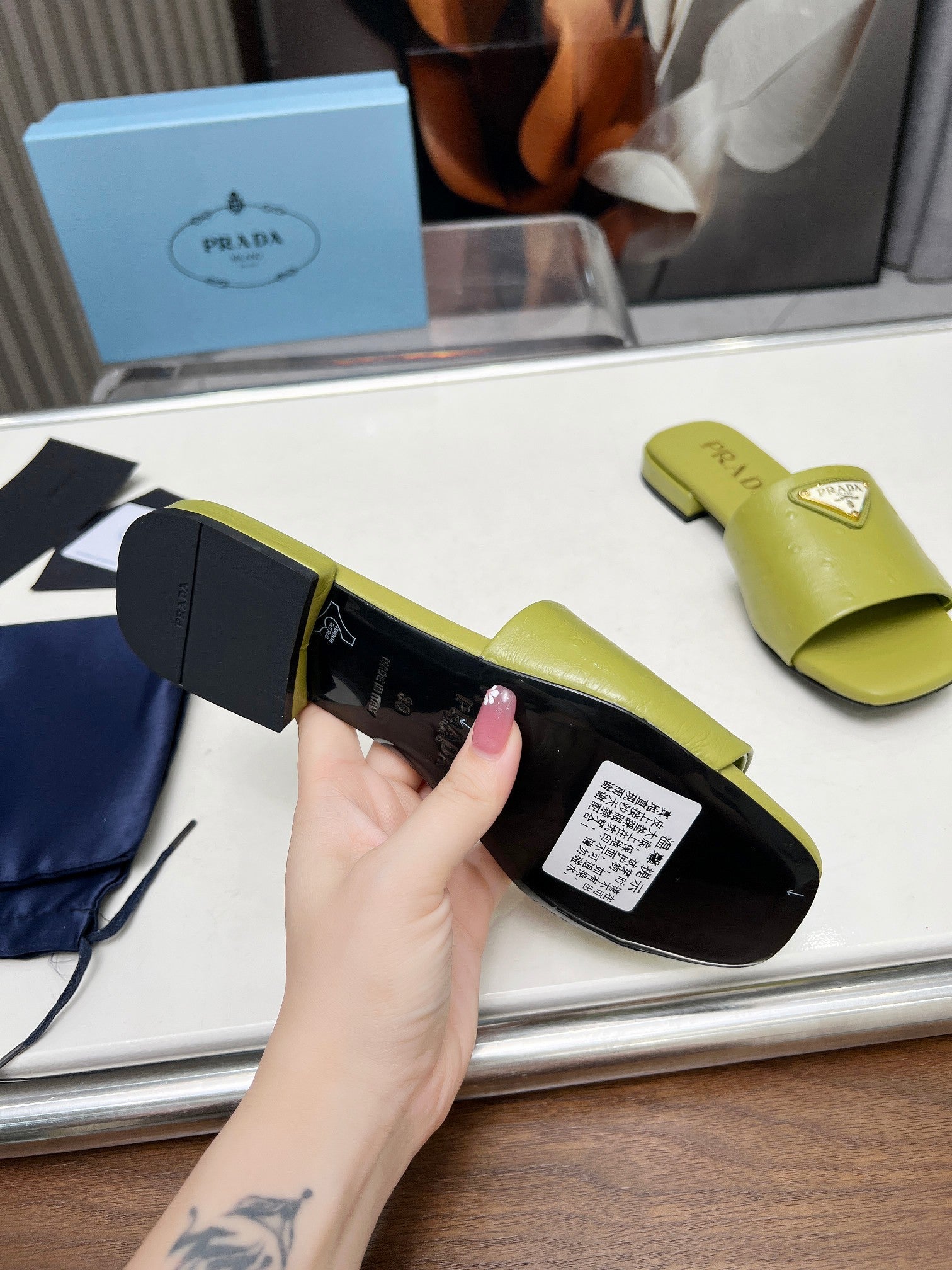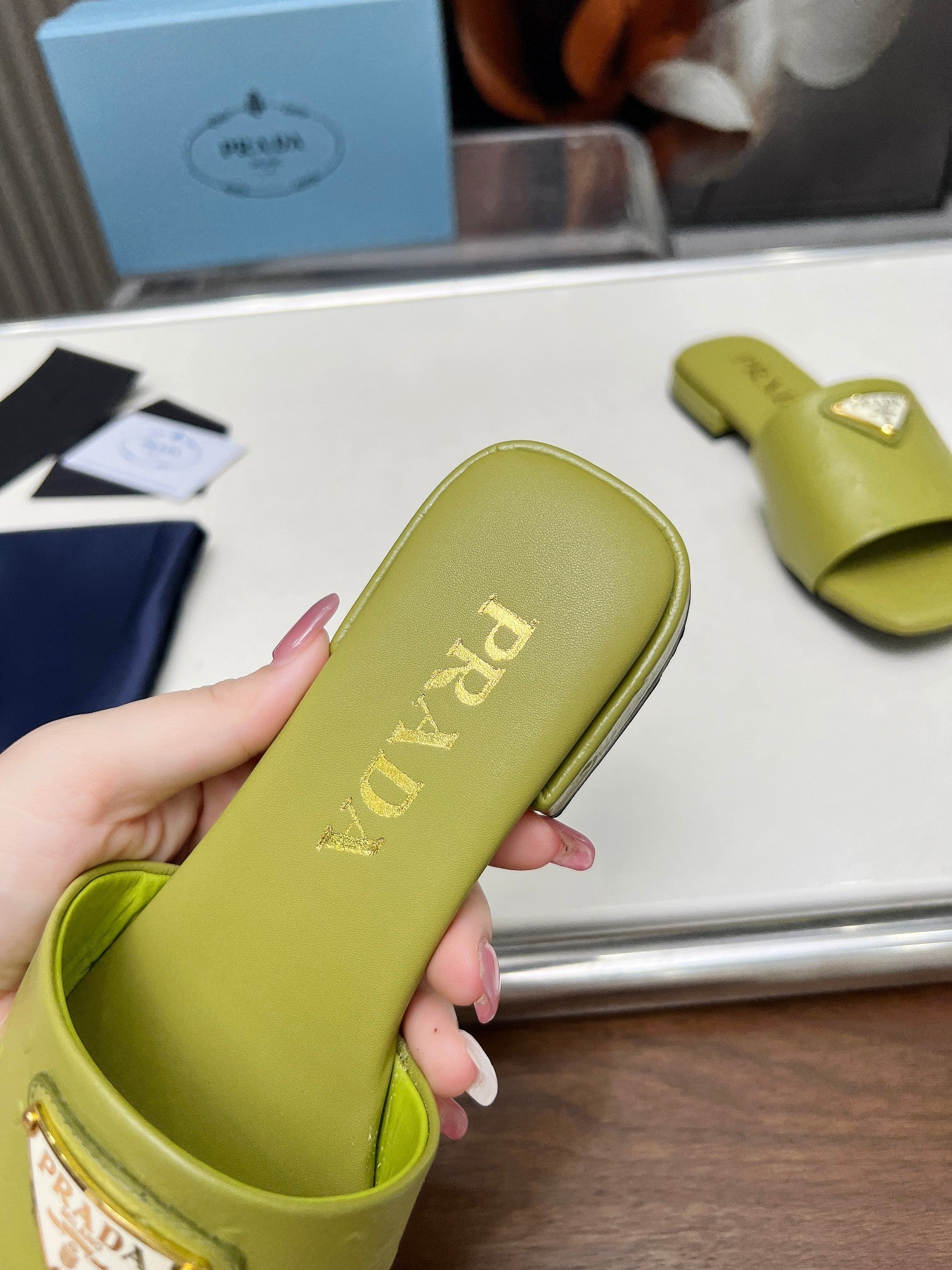 PRA SAFFIANO PATENT SLIDES OSTRICH MOTIF PEAR CALFSKIN