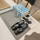 PRA SQUARE TOE MULES BLACK CALFSKIN WITH CHAIN