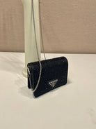 MINI FLAP BAG 11 IN BLACK DUCHESSE FABRIC ATTACHED FULL CRYSTALS SILVER CHAIN