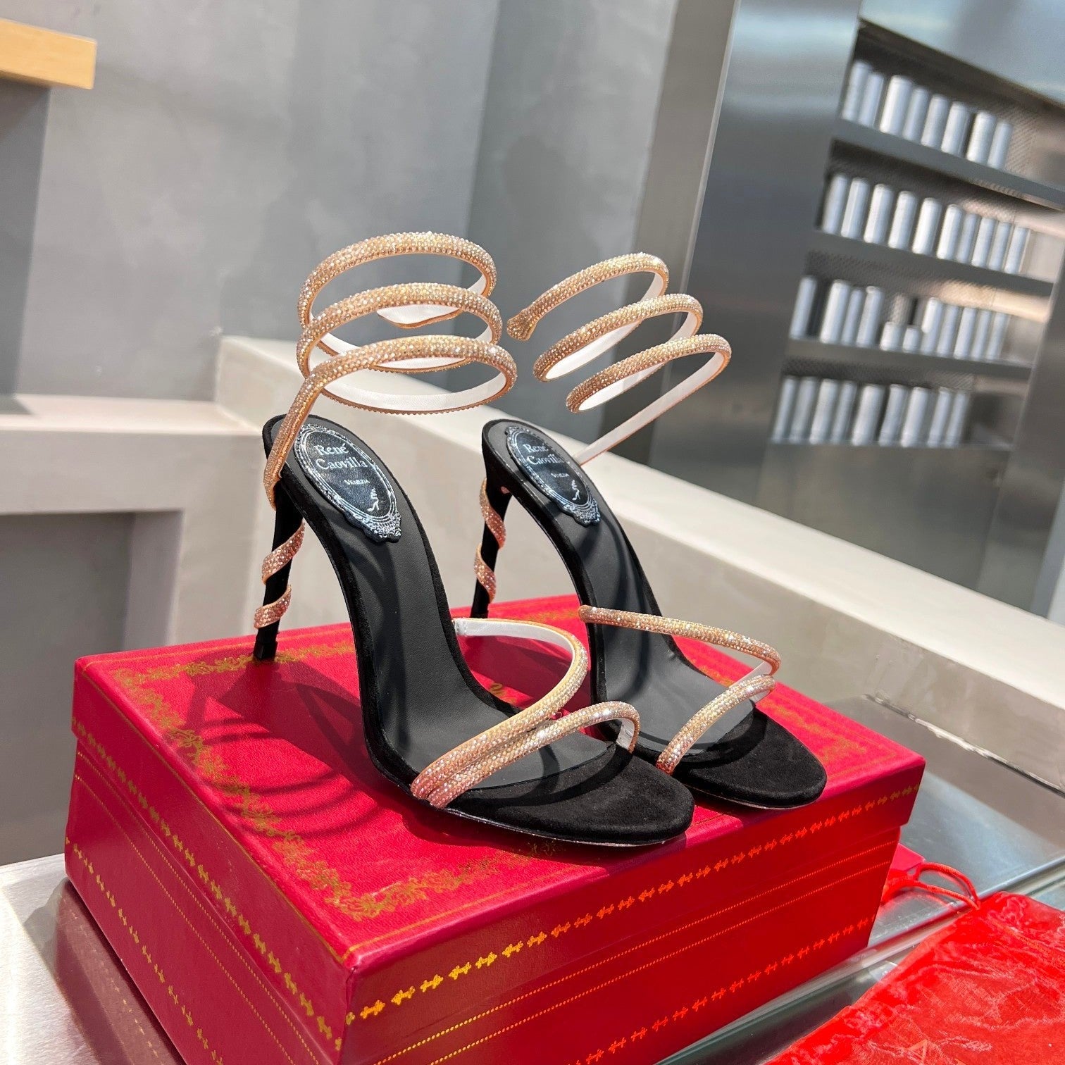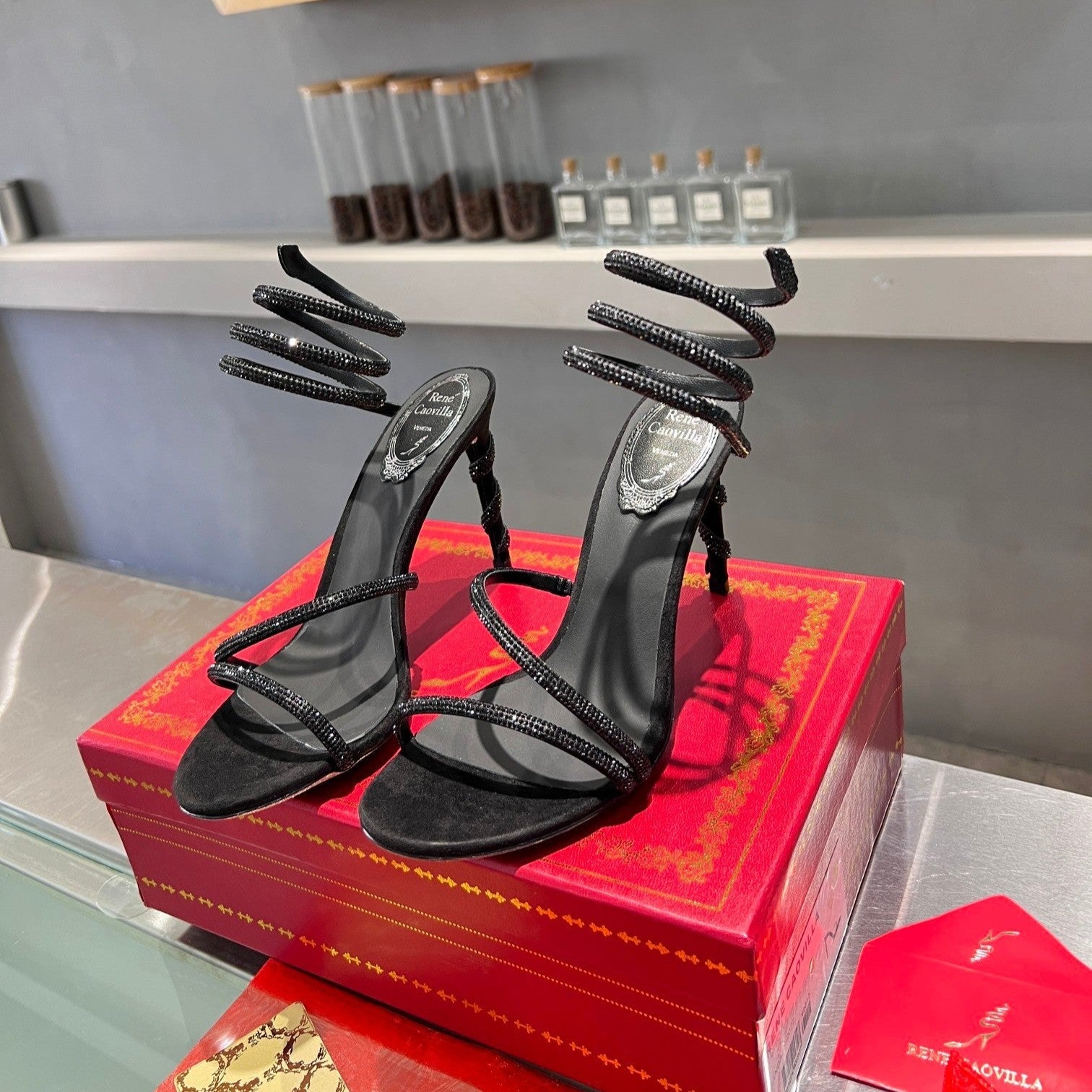 RC 25C Flower-Studded Diamond High-Heeled Sandals Black Sheepskin 174909
