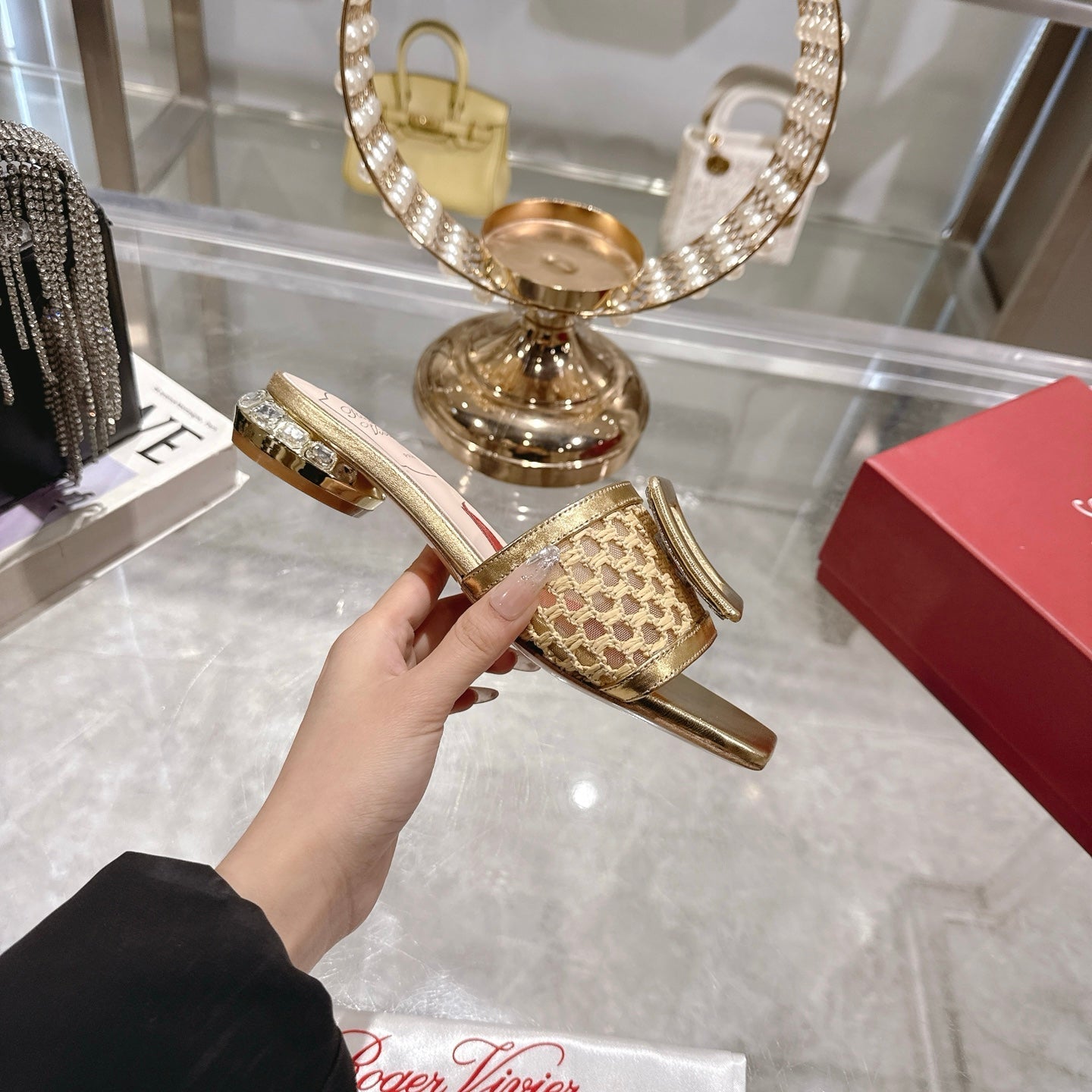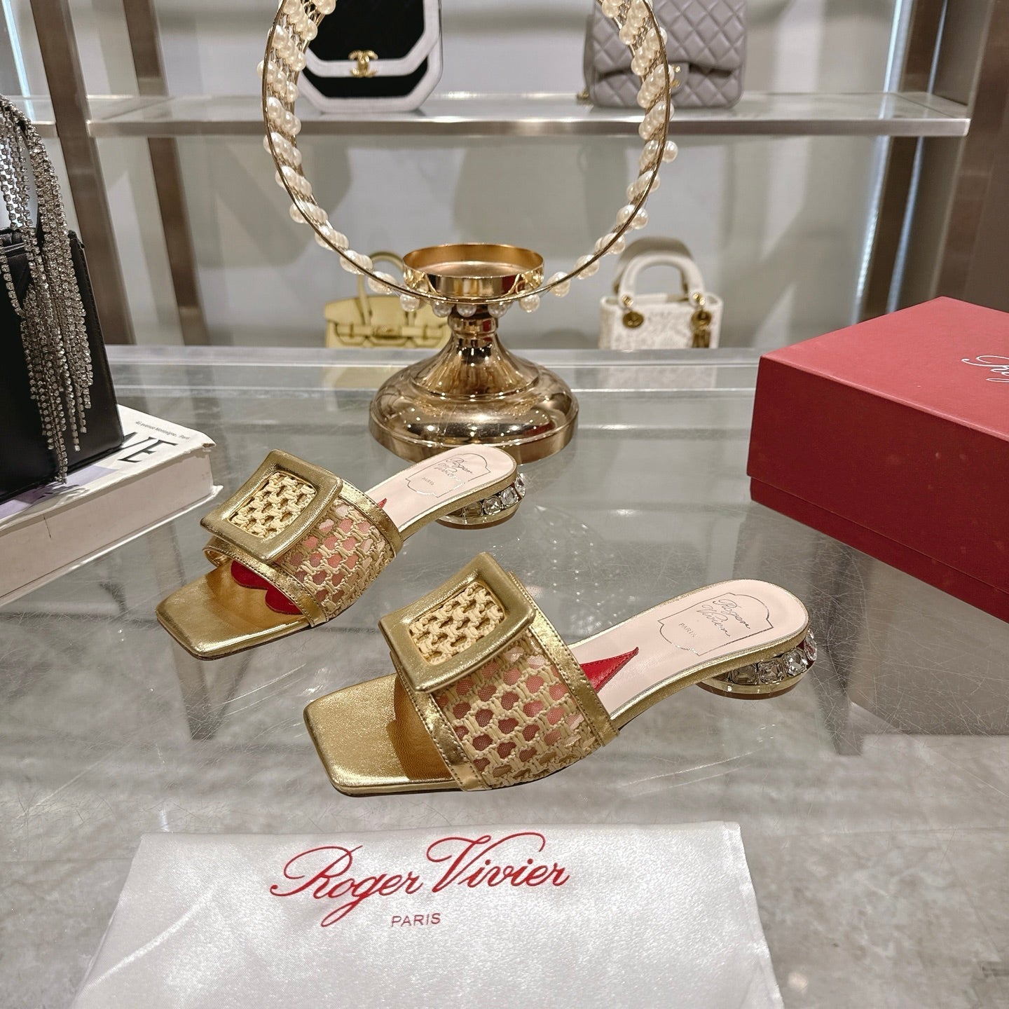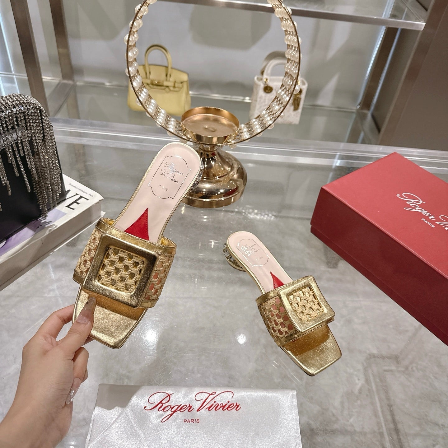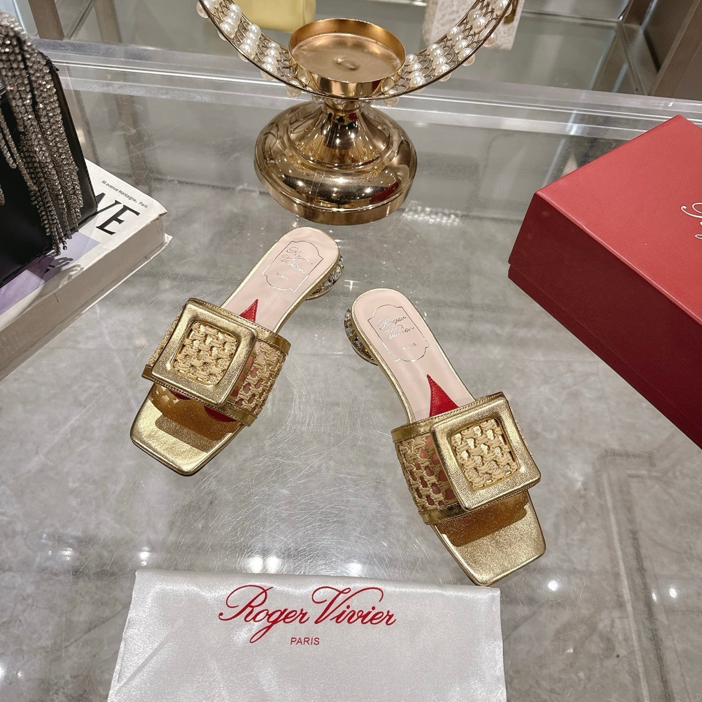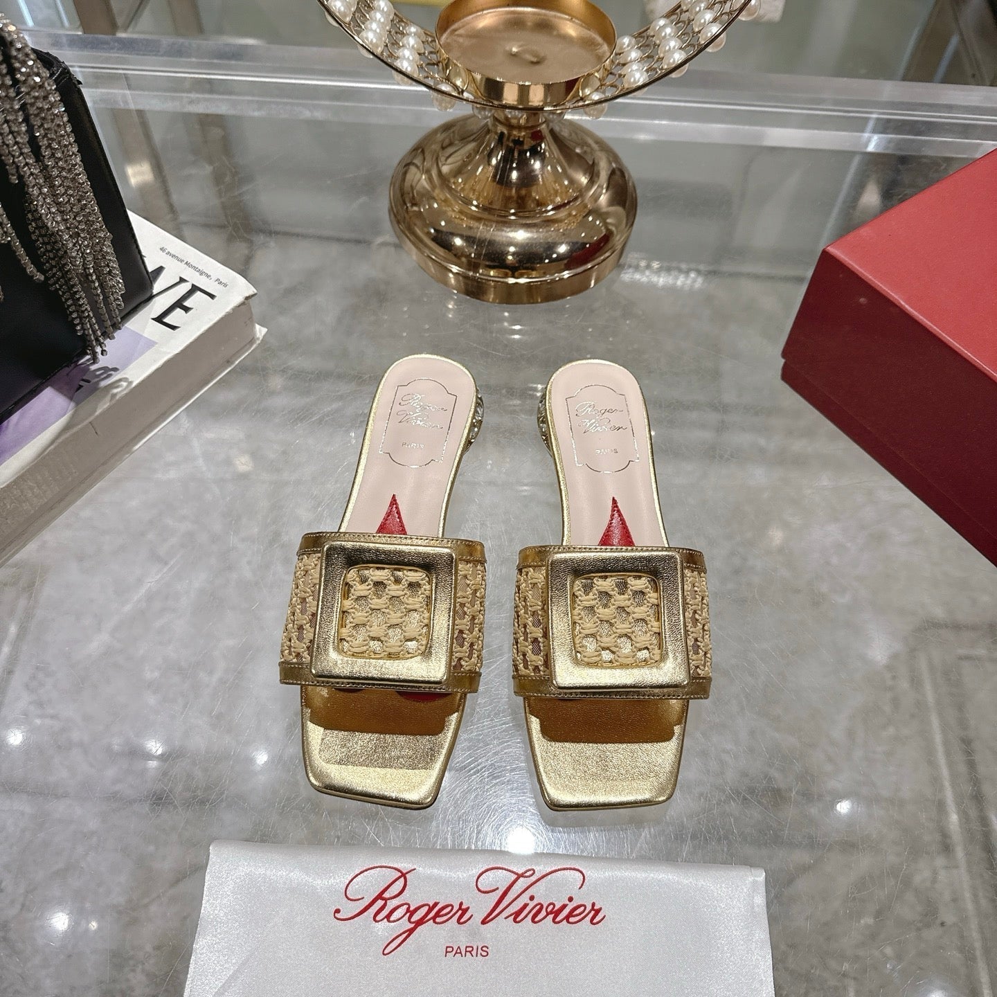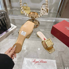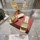 Viv 25 Hollow Square Buckle Slippers Gold Weaving Leather 263001