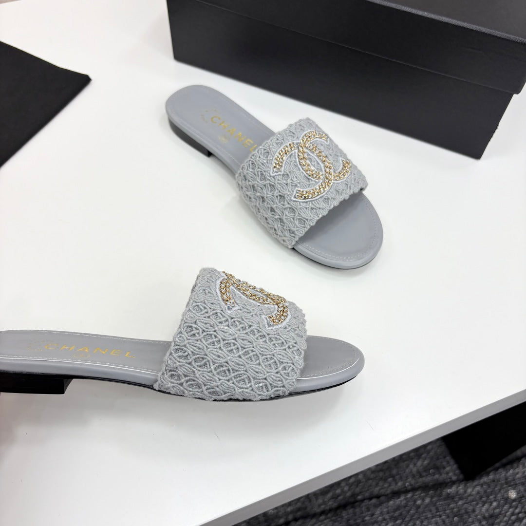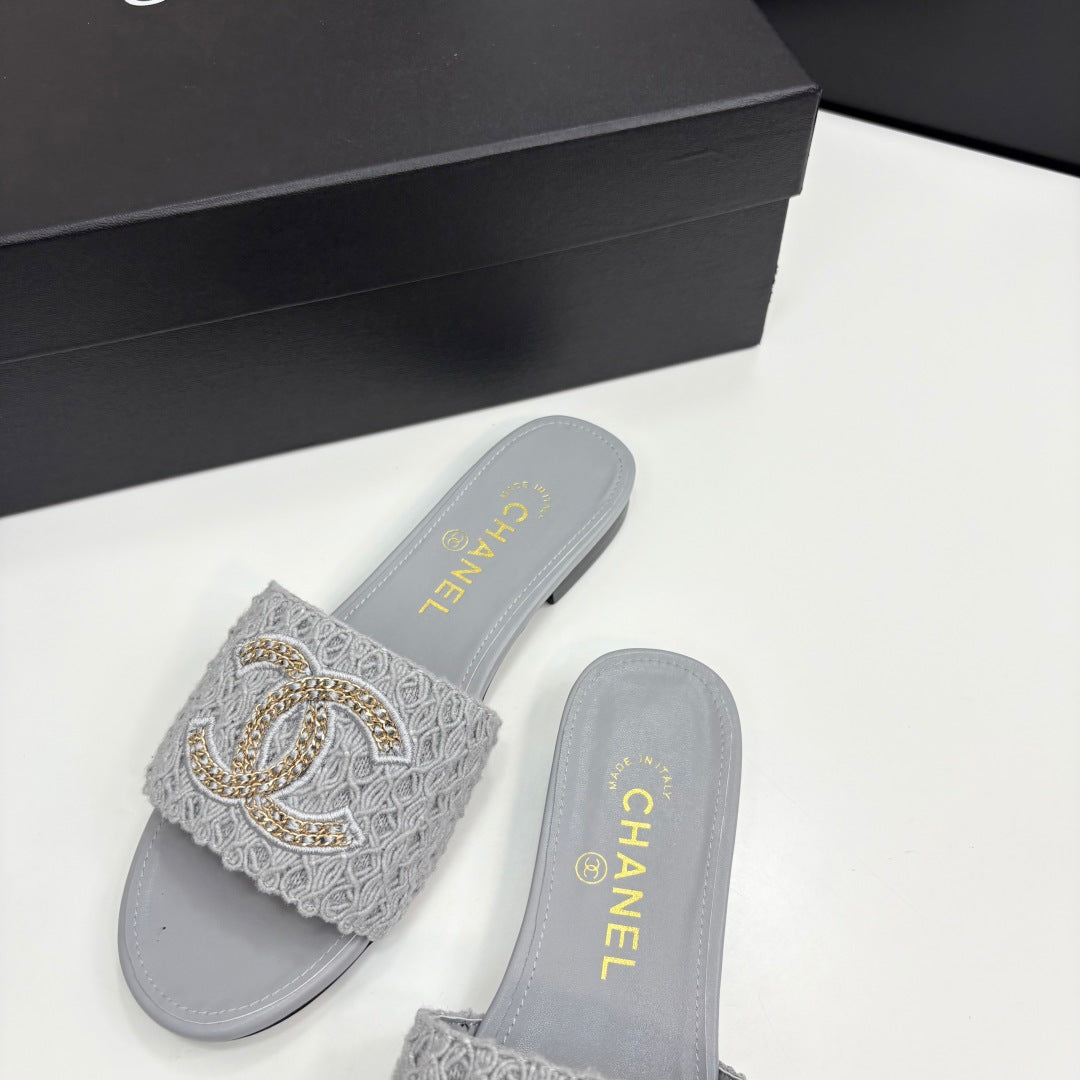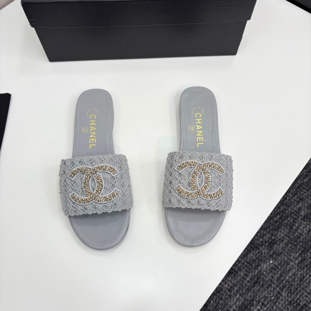 CC 25 Doubble Chain Embroidered Slippers Grey Fabric And Sheepskin 352494