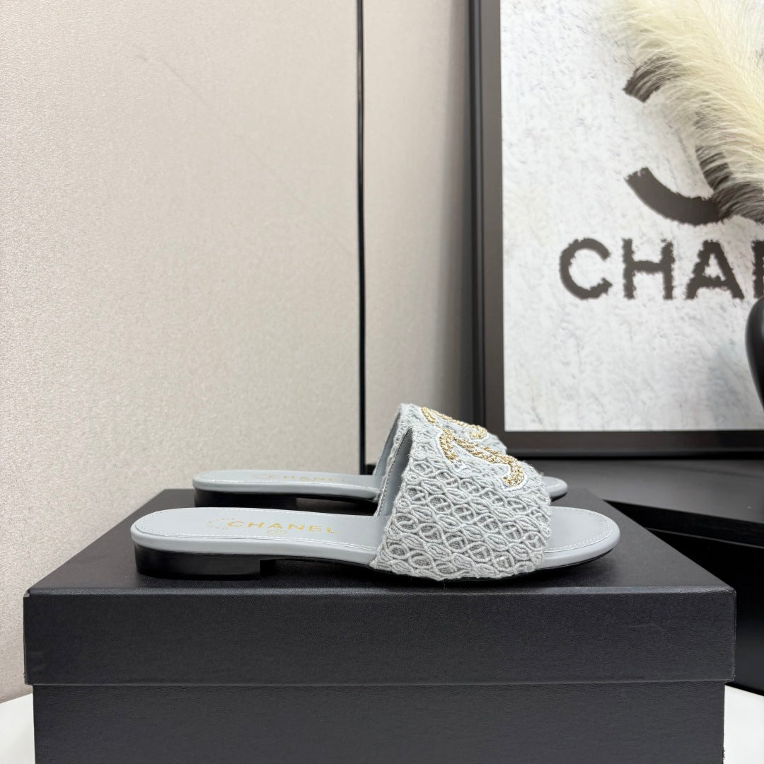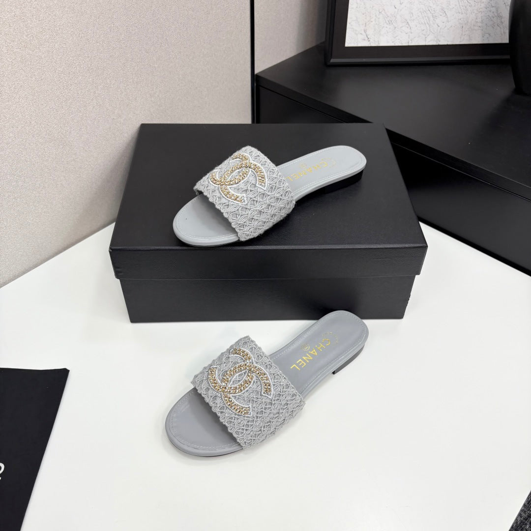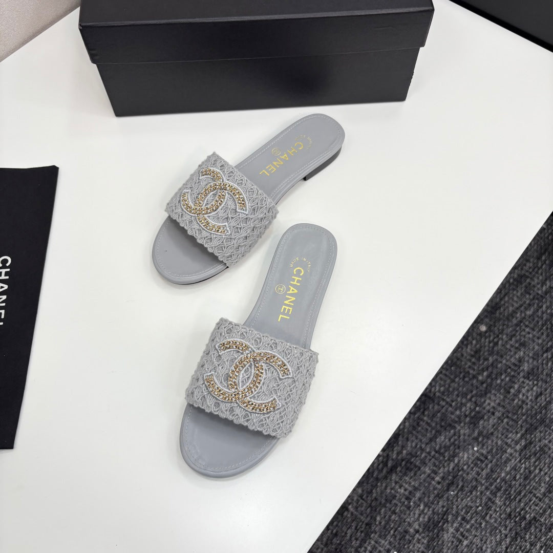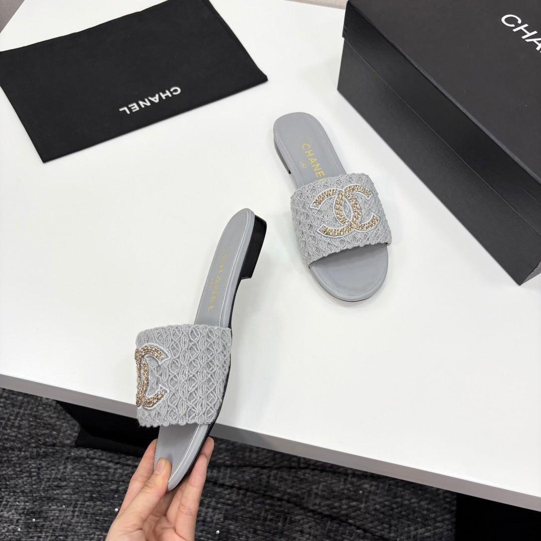 CC 25 Doubble Chain Embroidered Slippers Grey Fabric And Sheepskin 352494