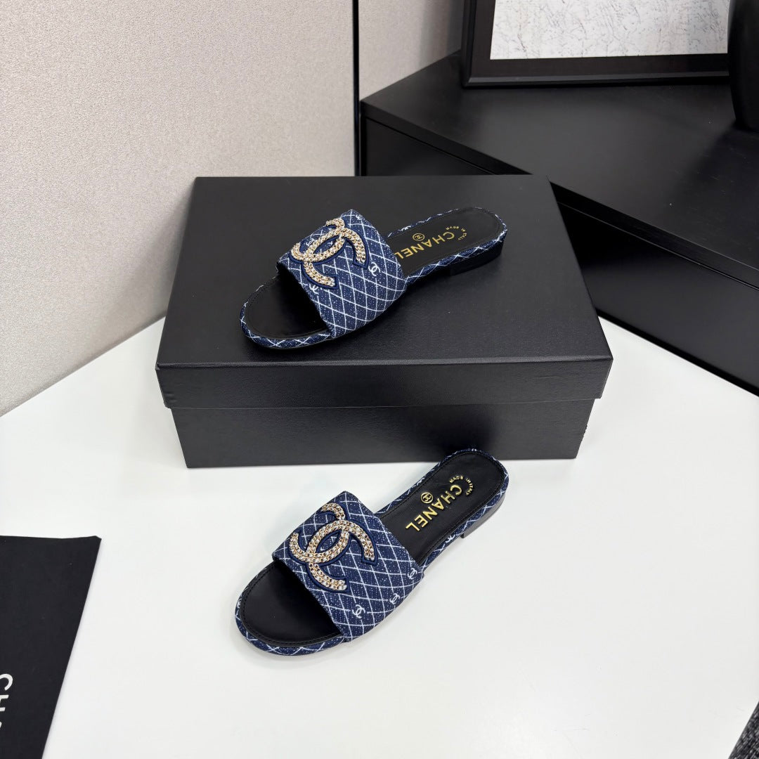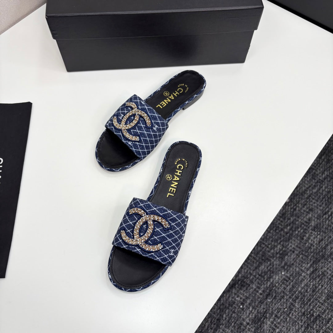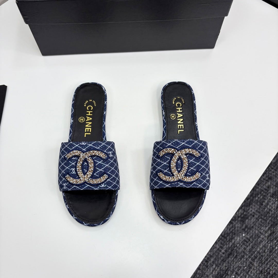 CC 25 Doubble Chain Embroidered Slippers Navy Blue Fabric 352496