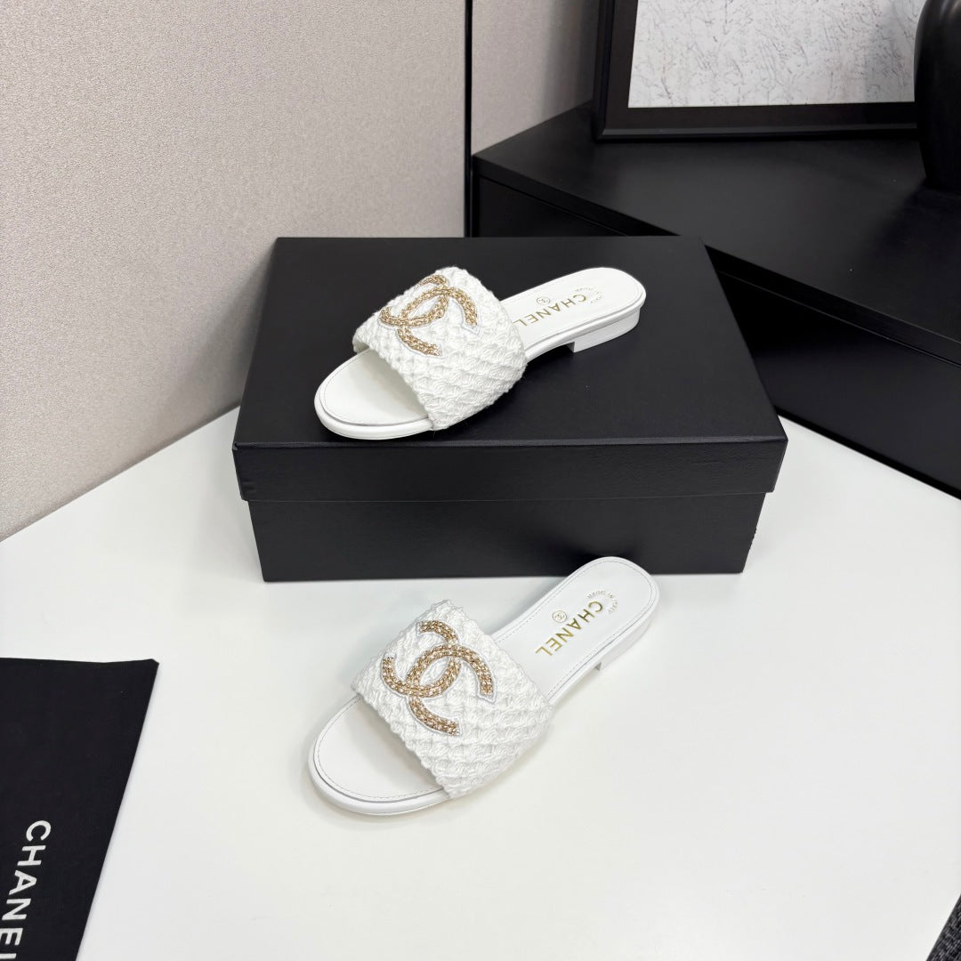 CC 25 Doubble Chain Embroidered Slippers White Fabric And Sheepskin 352492