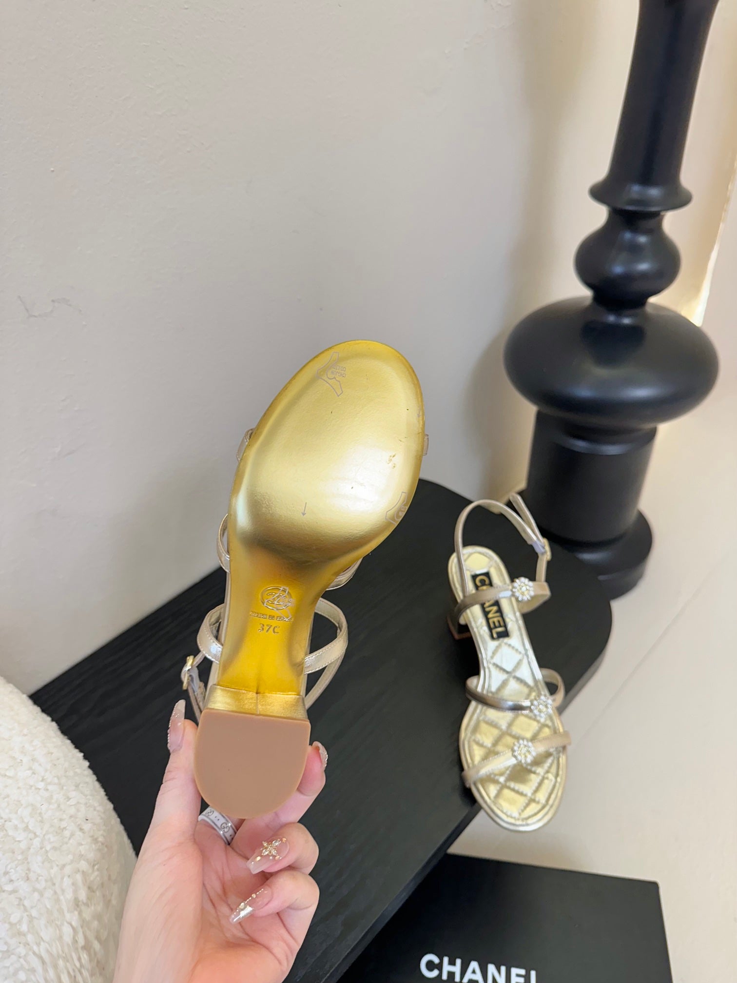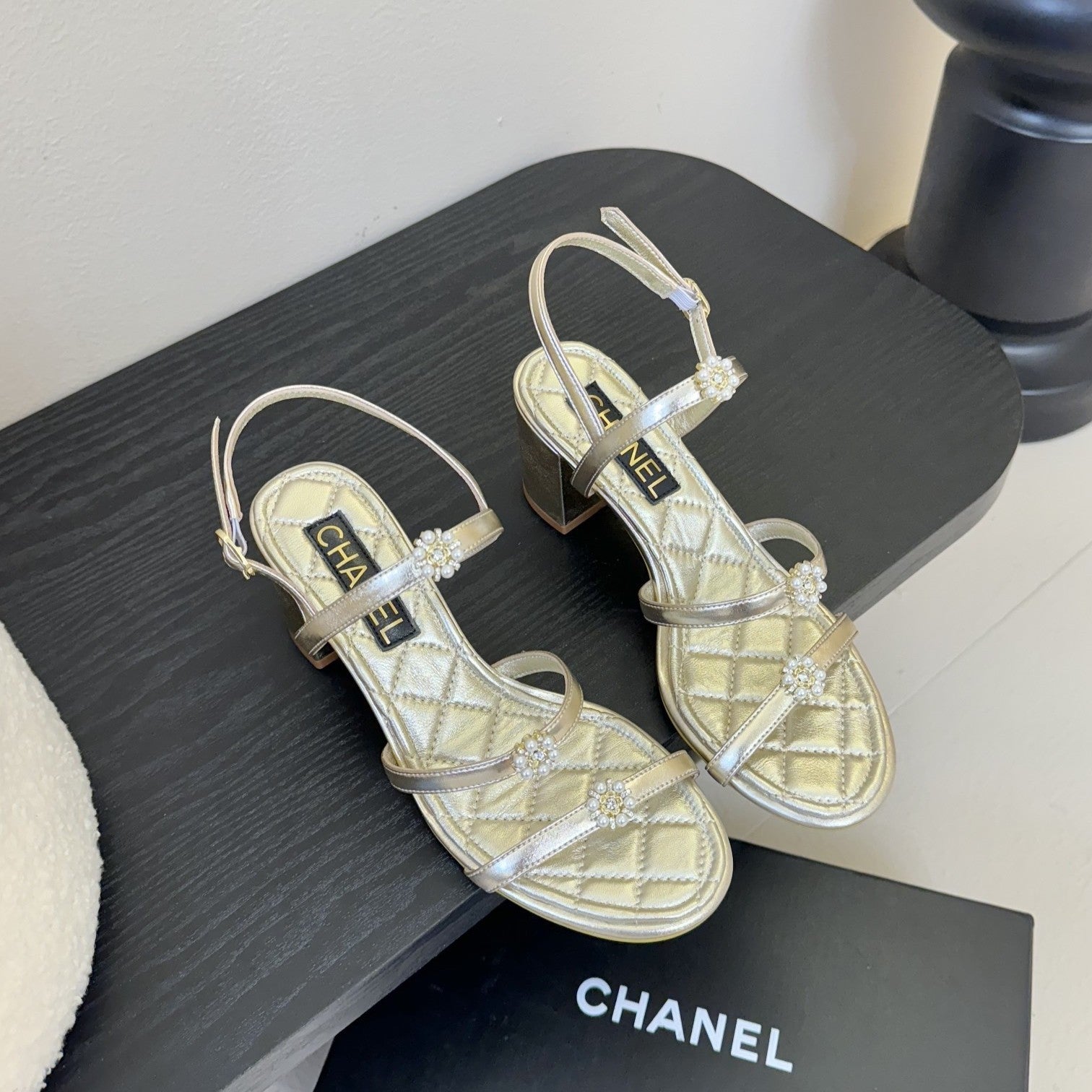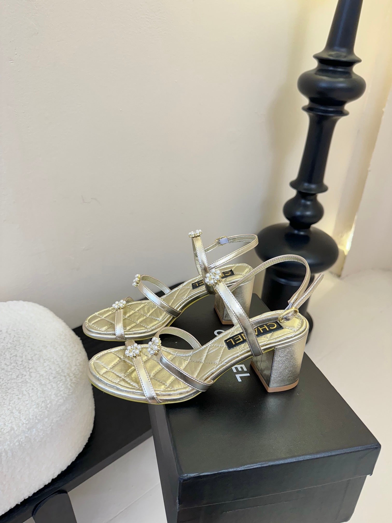 CC 25SS 3 Flowers Heel Sandals 60mm Gold Metallic Sheepskin 351433