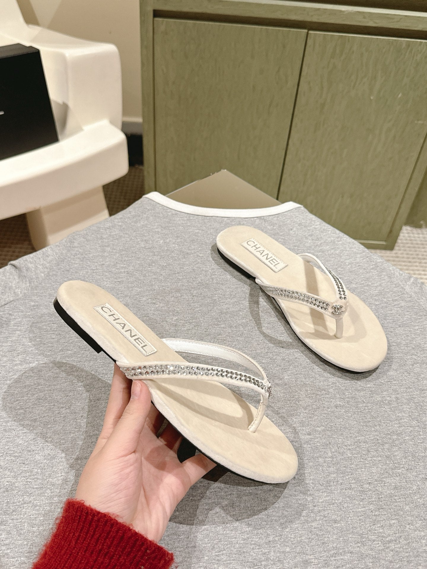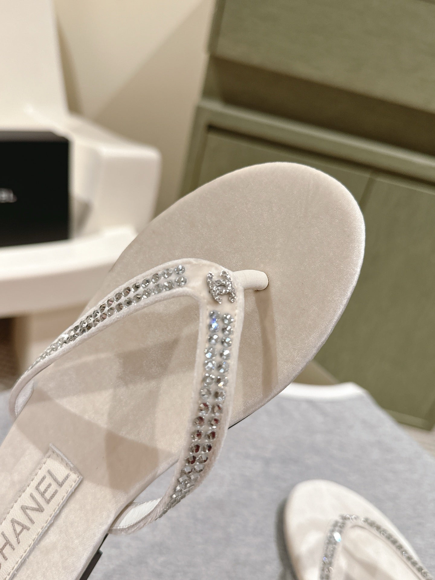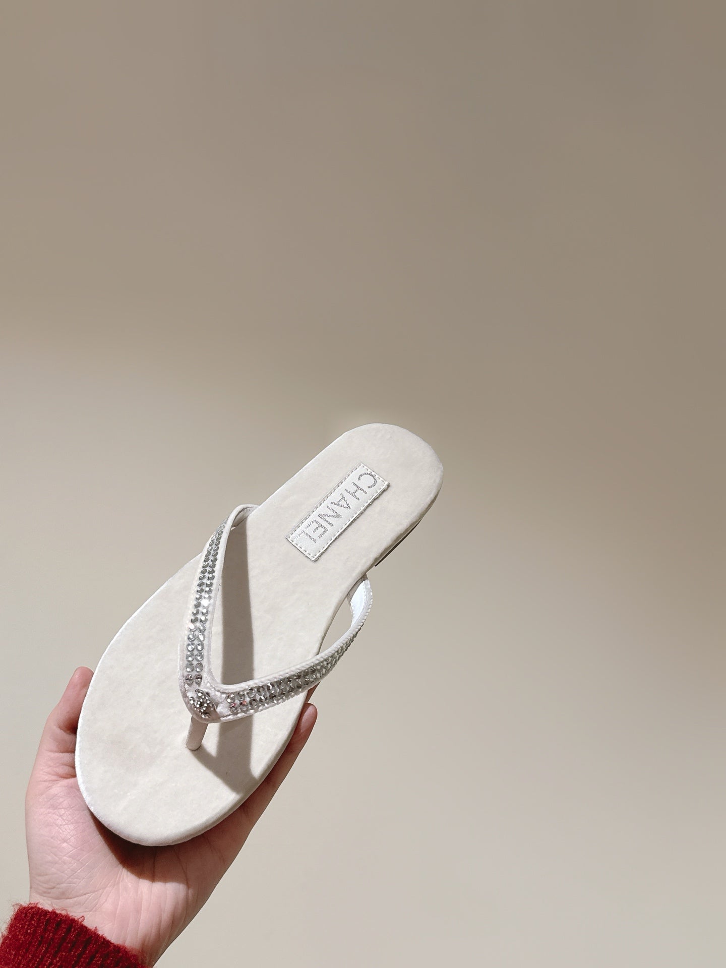 CC 25ss Rhinestone Thong Sandal Beige Velvet 461636