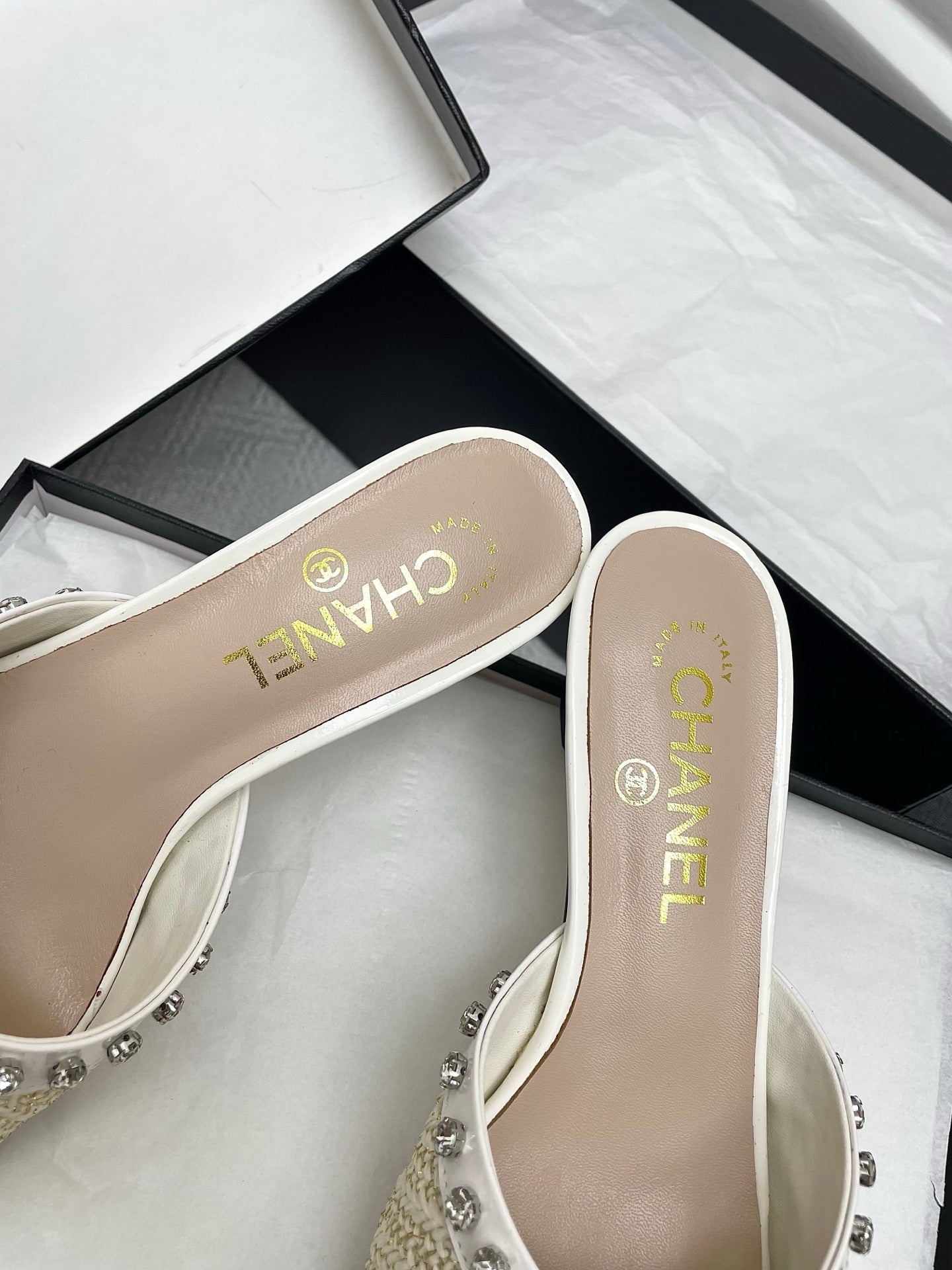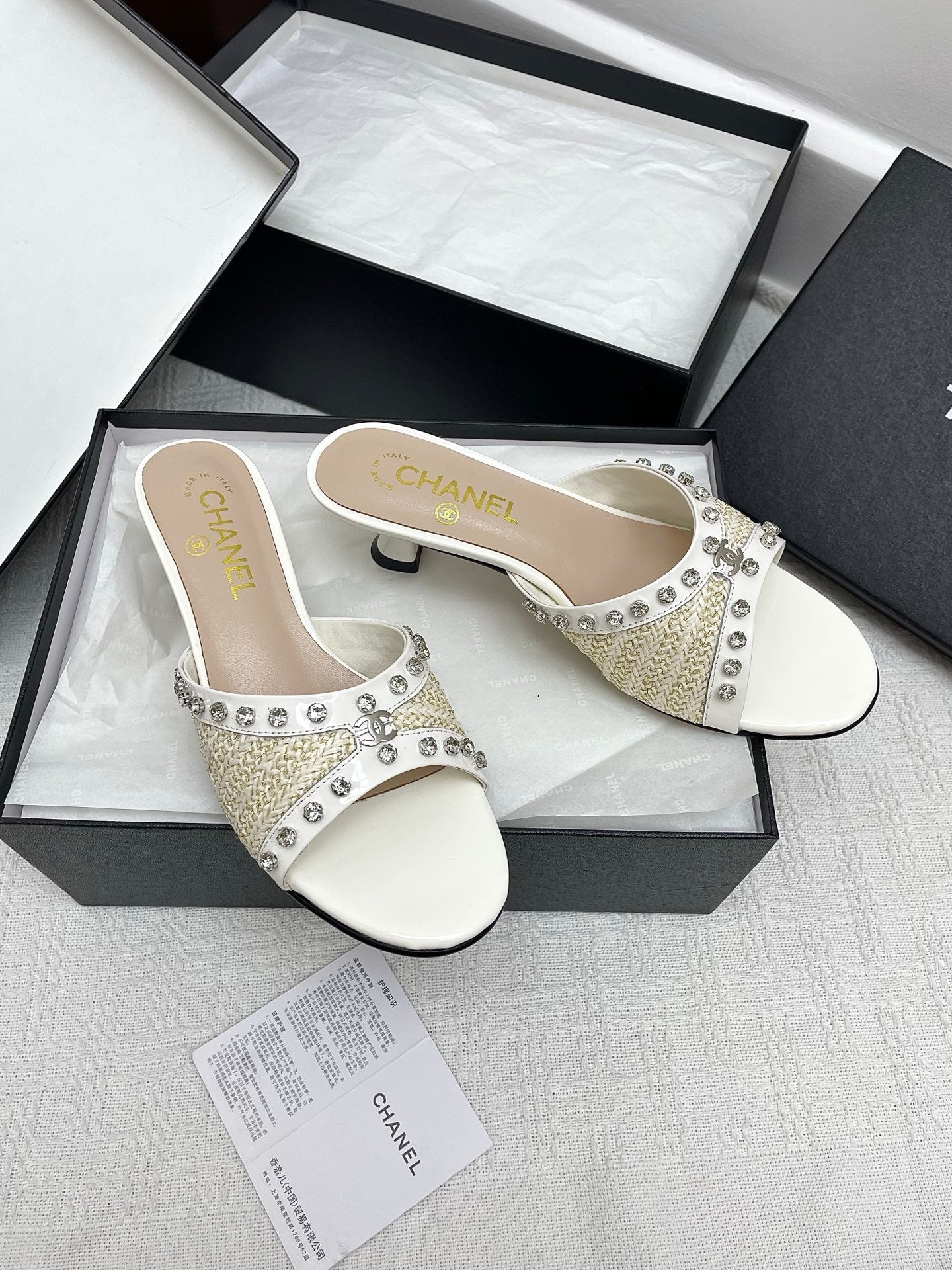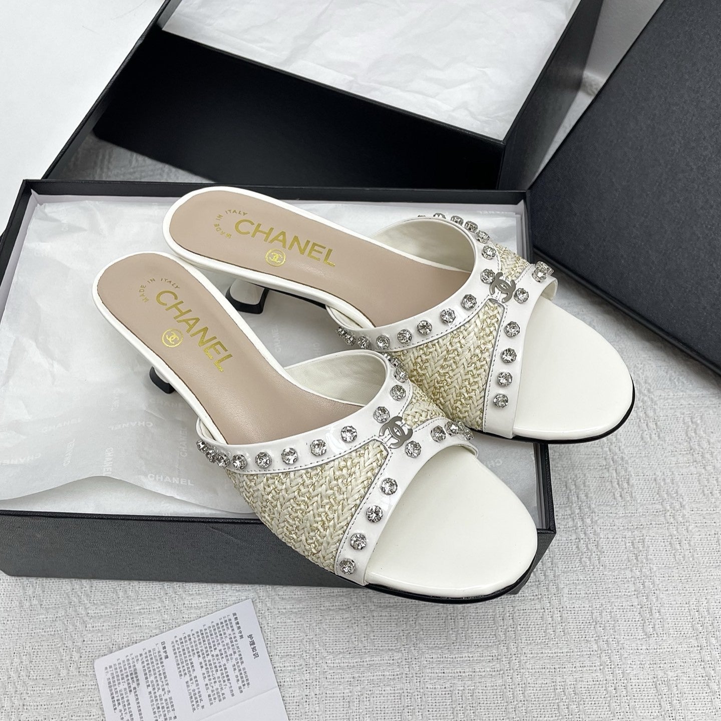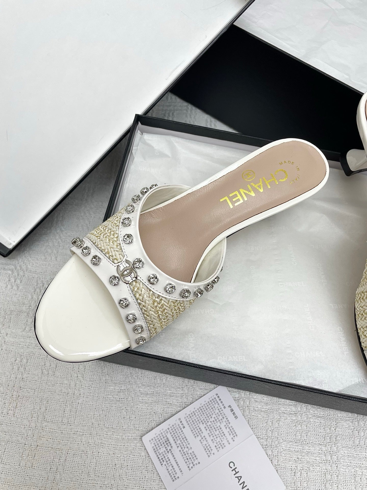 CC 25SS Slippers 5cm Light Yellow Raffia White Patent Calfskin 338301
