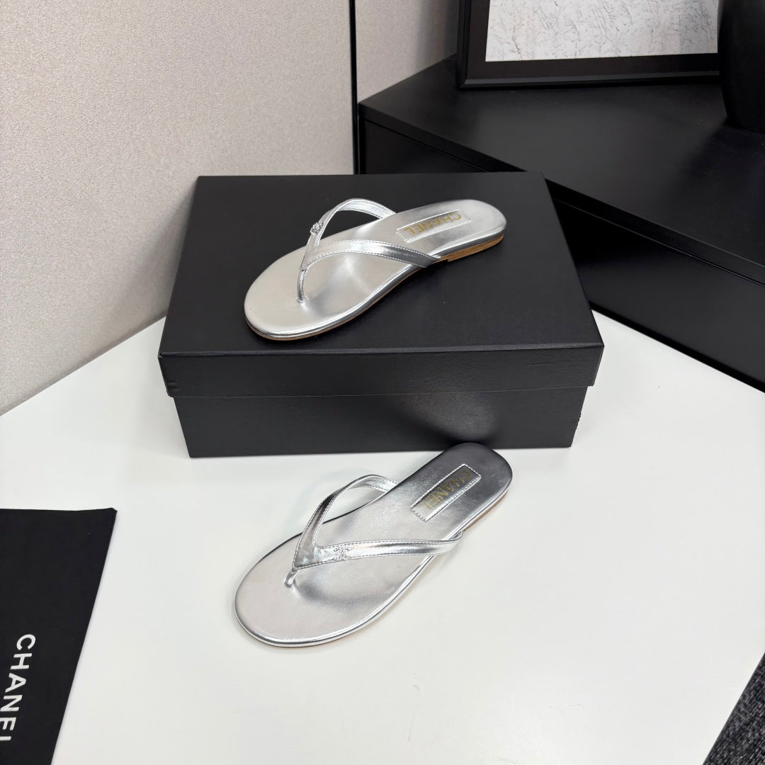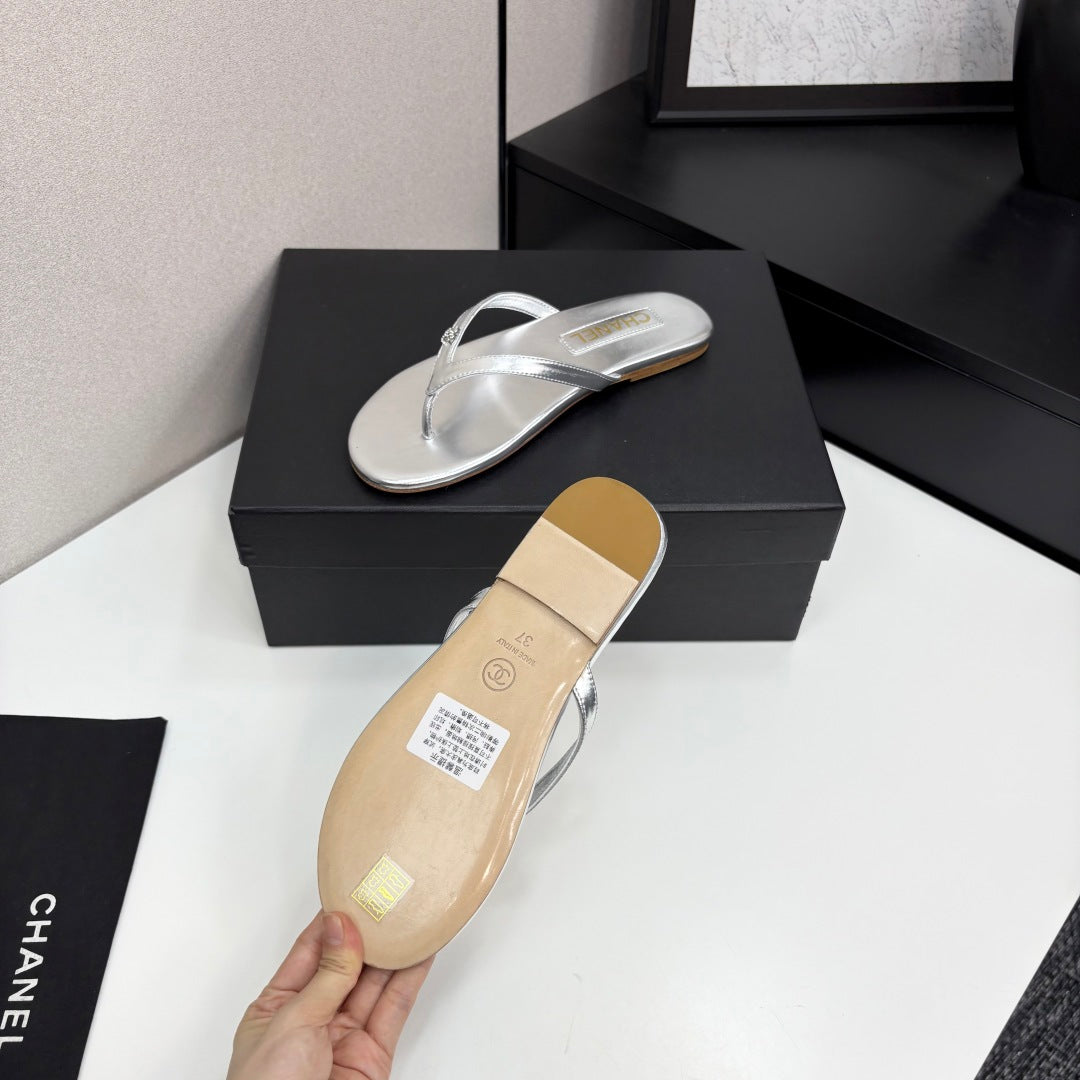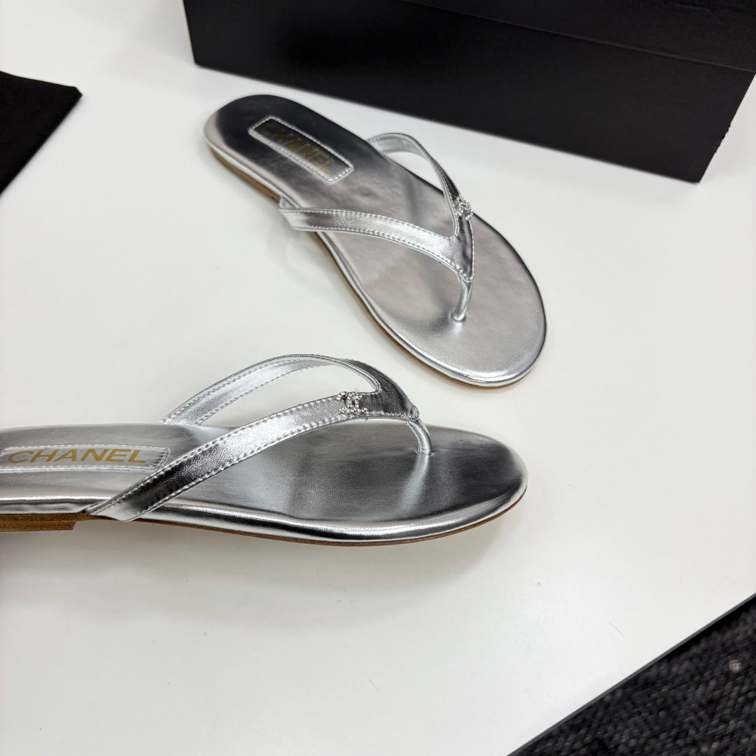CC Crystal Logo Thong Sandal Silver Metallic Sheepskin 352486