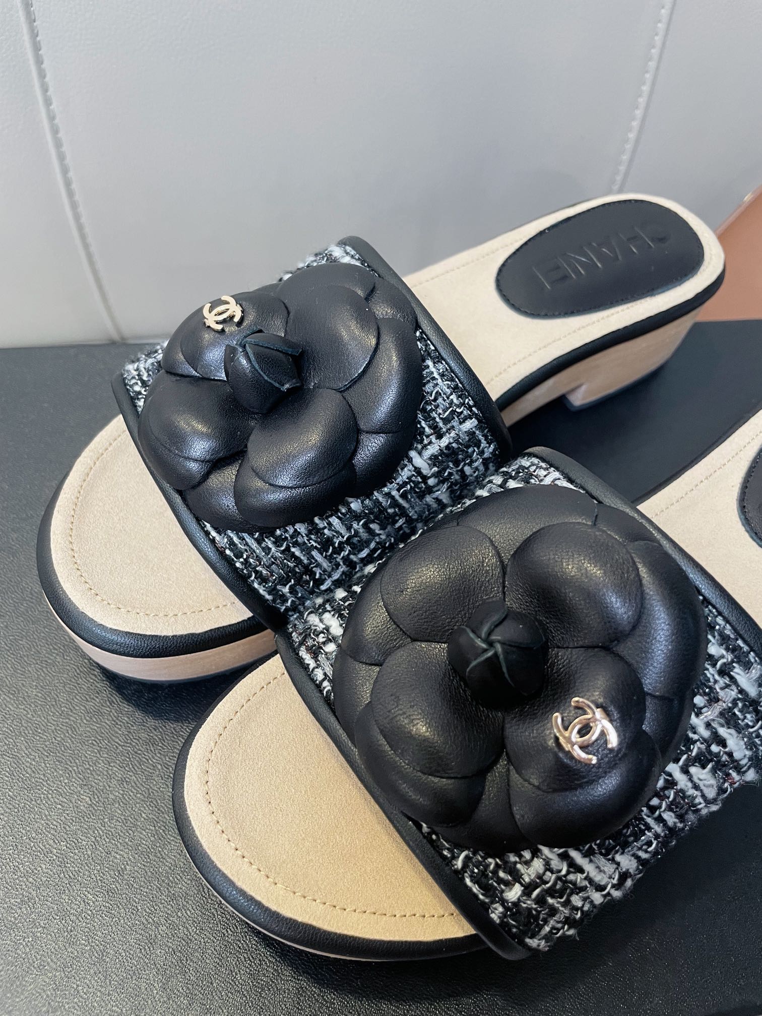 cc mule sandal 45 black white fabric beige calfskin