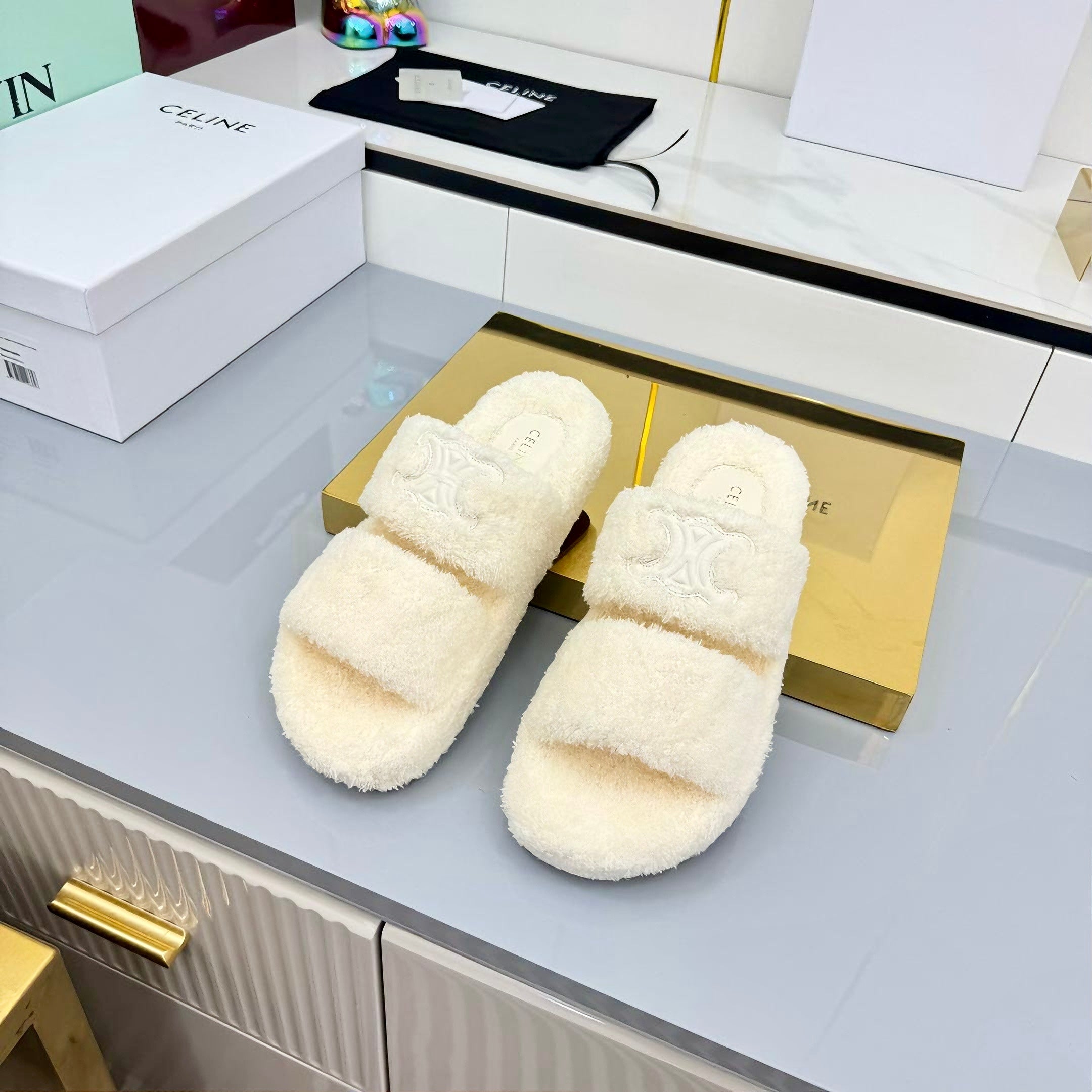 CL 25s Triomphe Slides 50mm White Wool & Rubber 434464