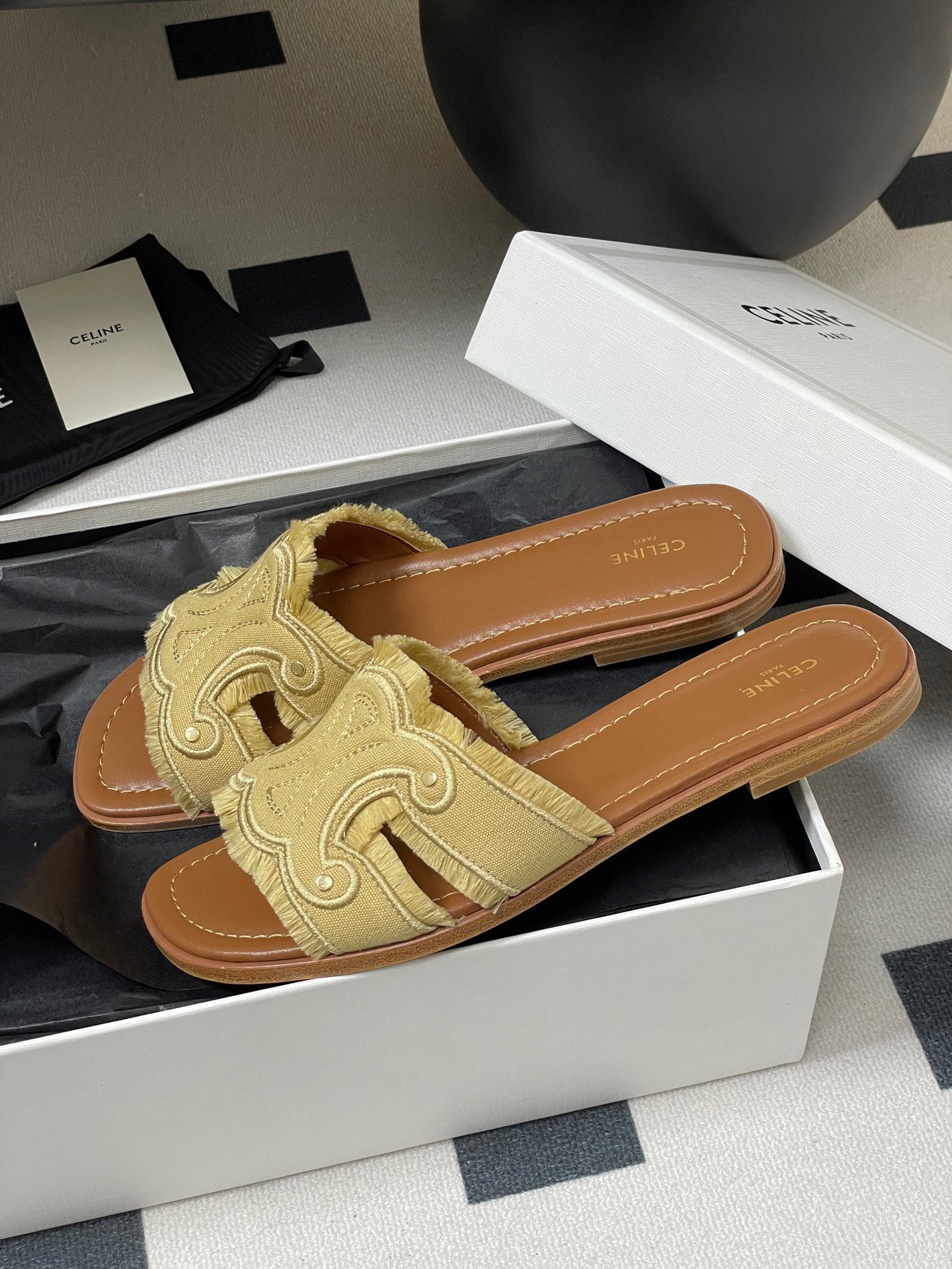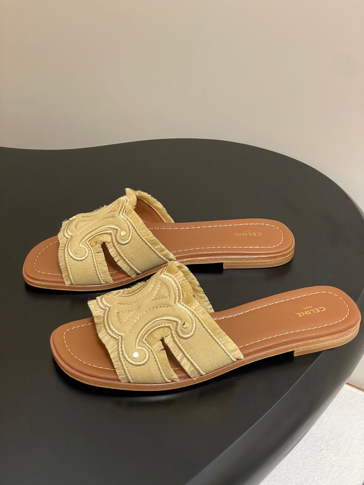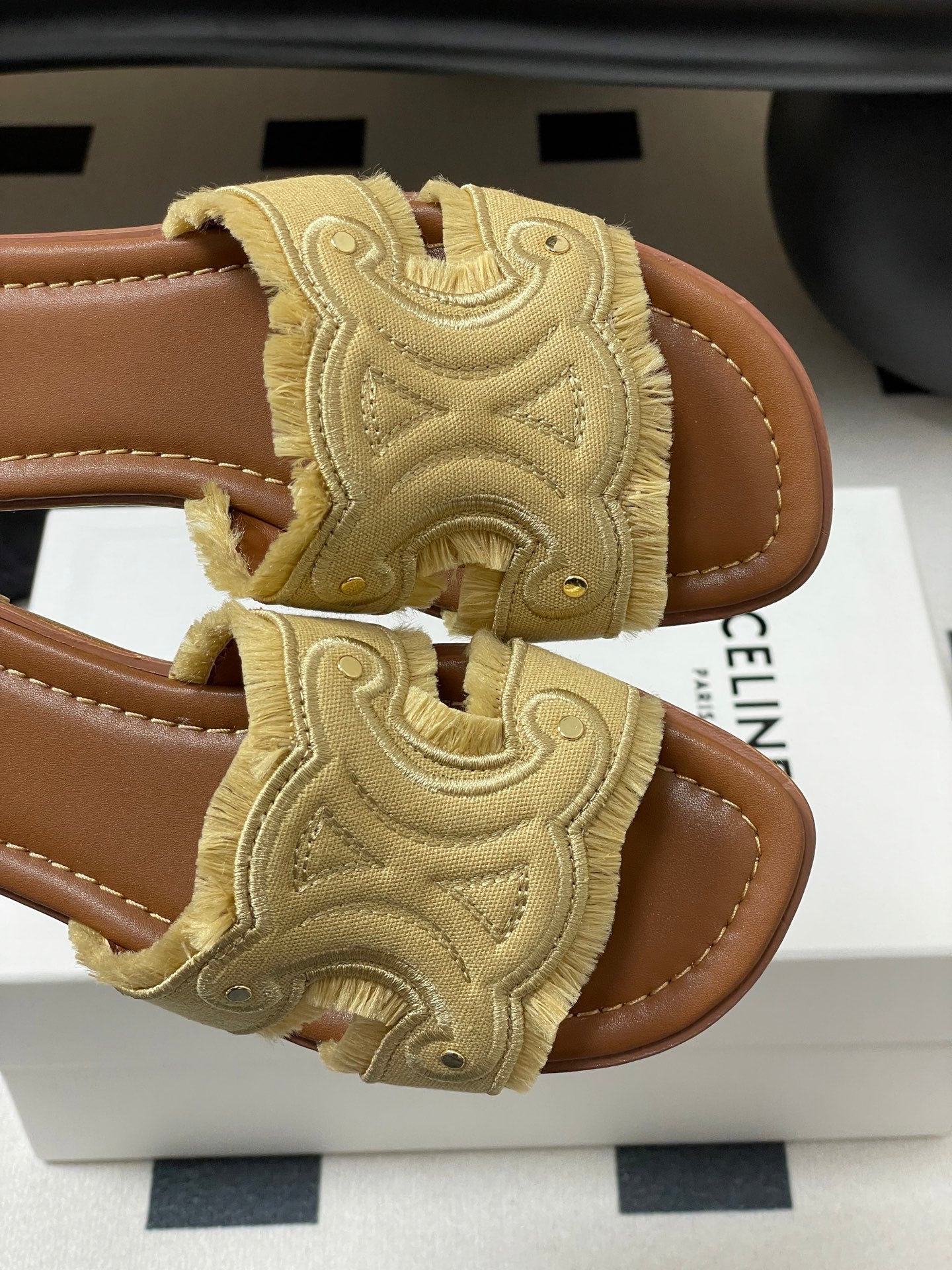 CL Marina Fringed Flat Mule In Caramel Denim 319735