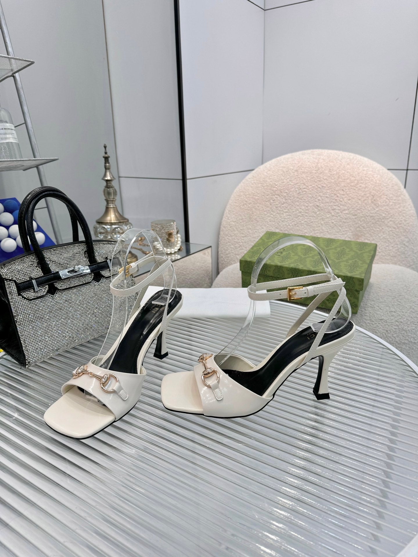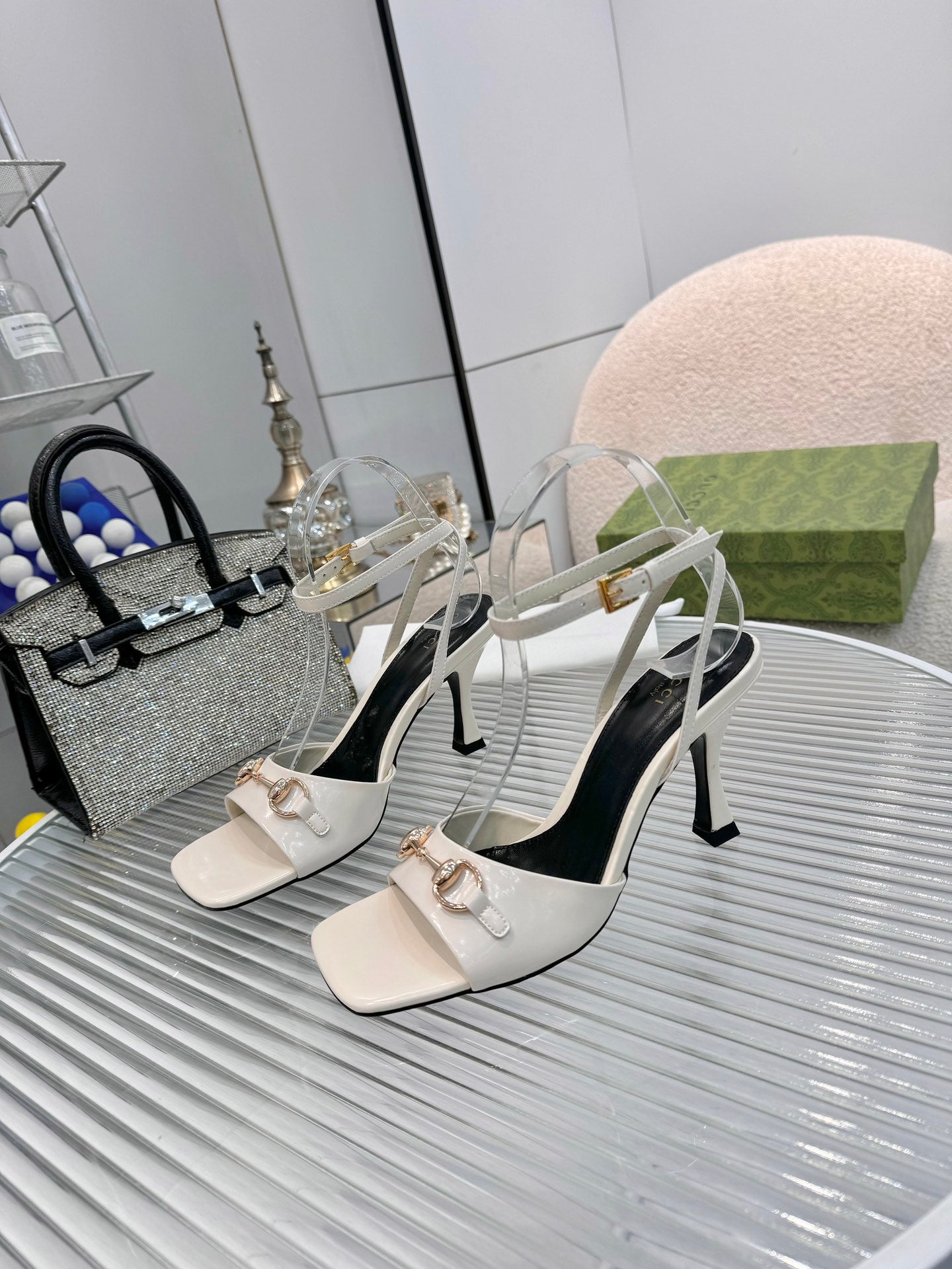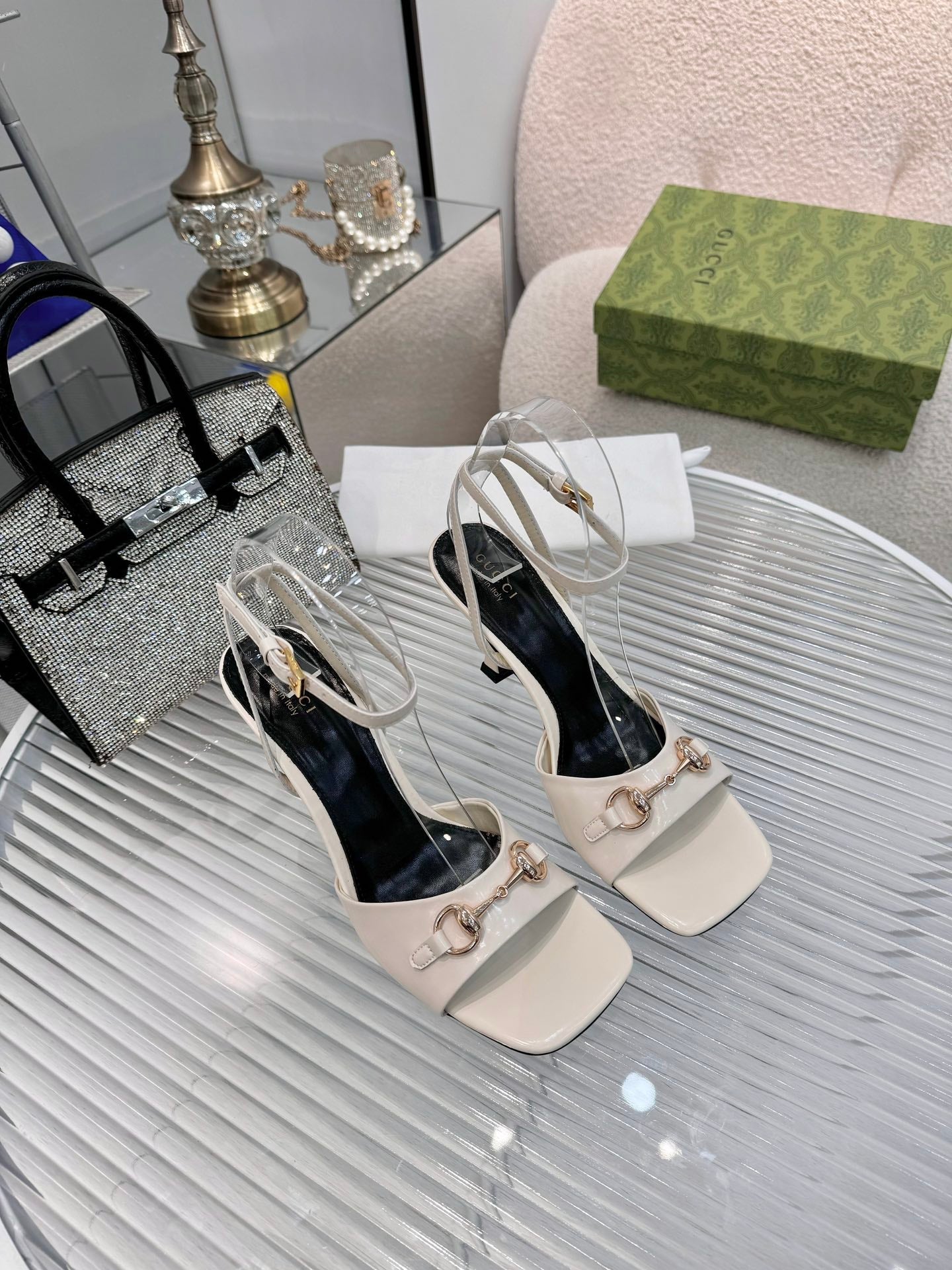 GG Gold Buckle Sandal 80mm Cream Patent Leather 457559