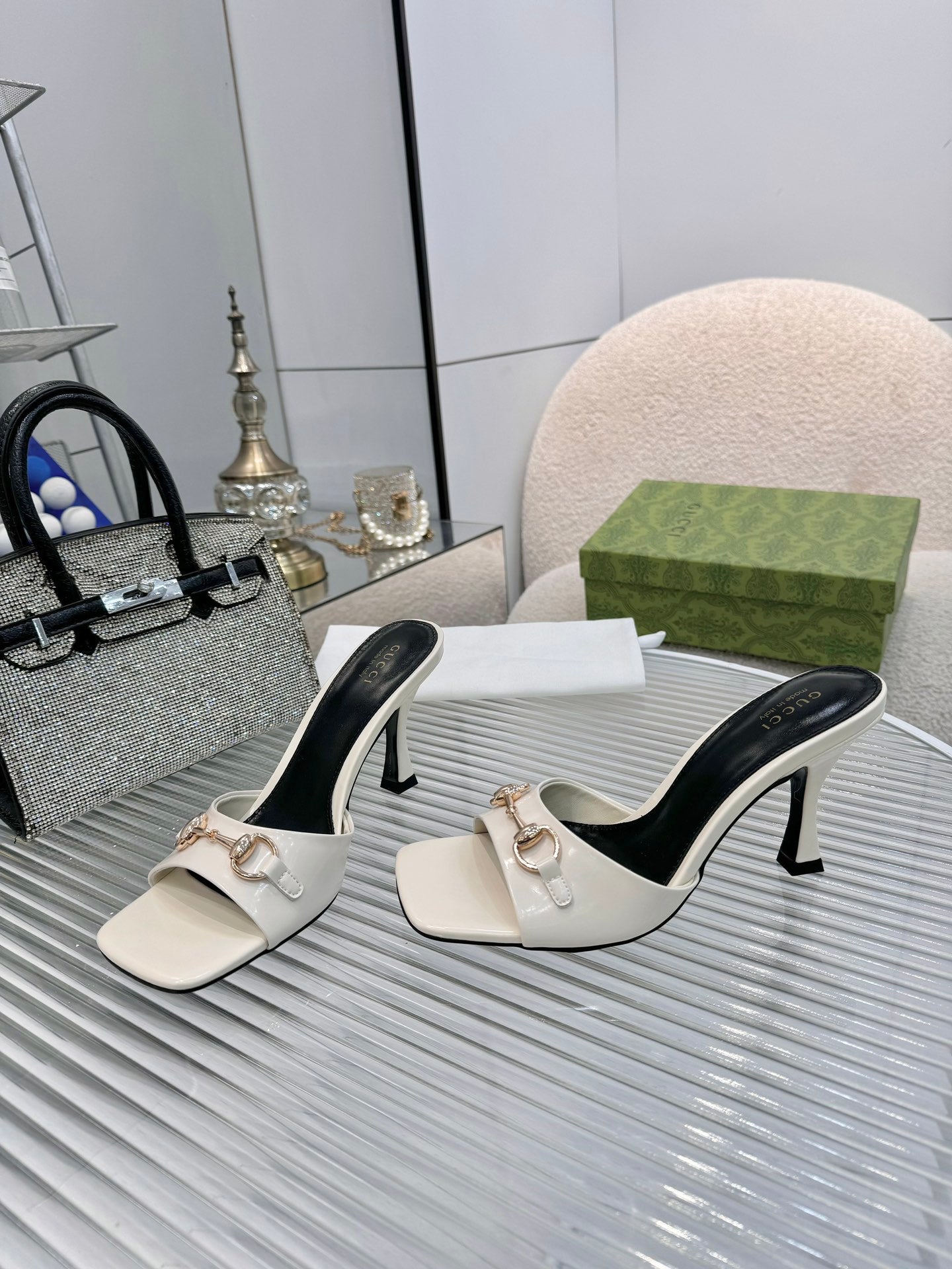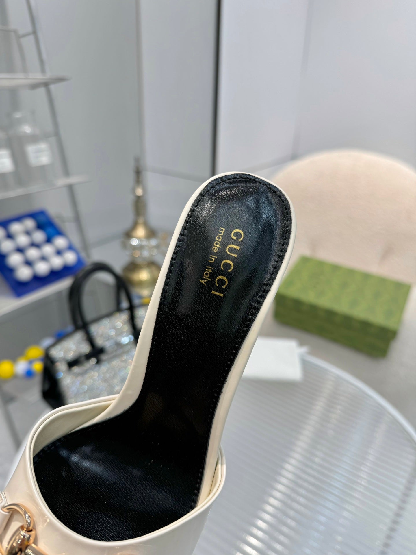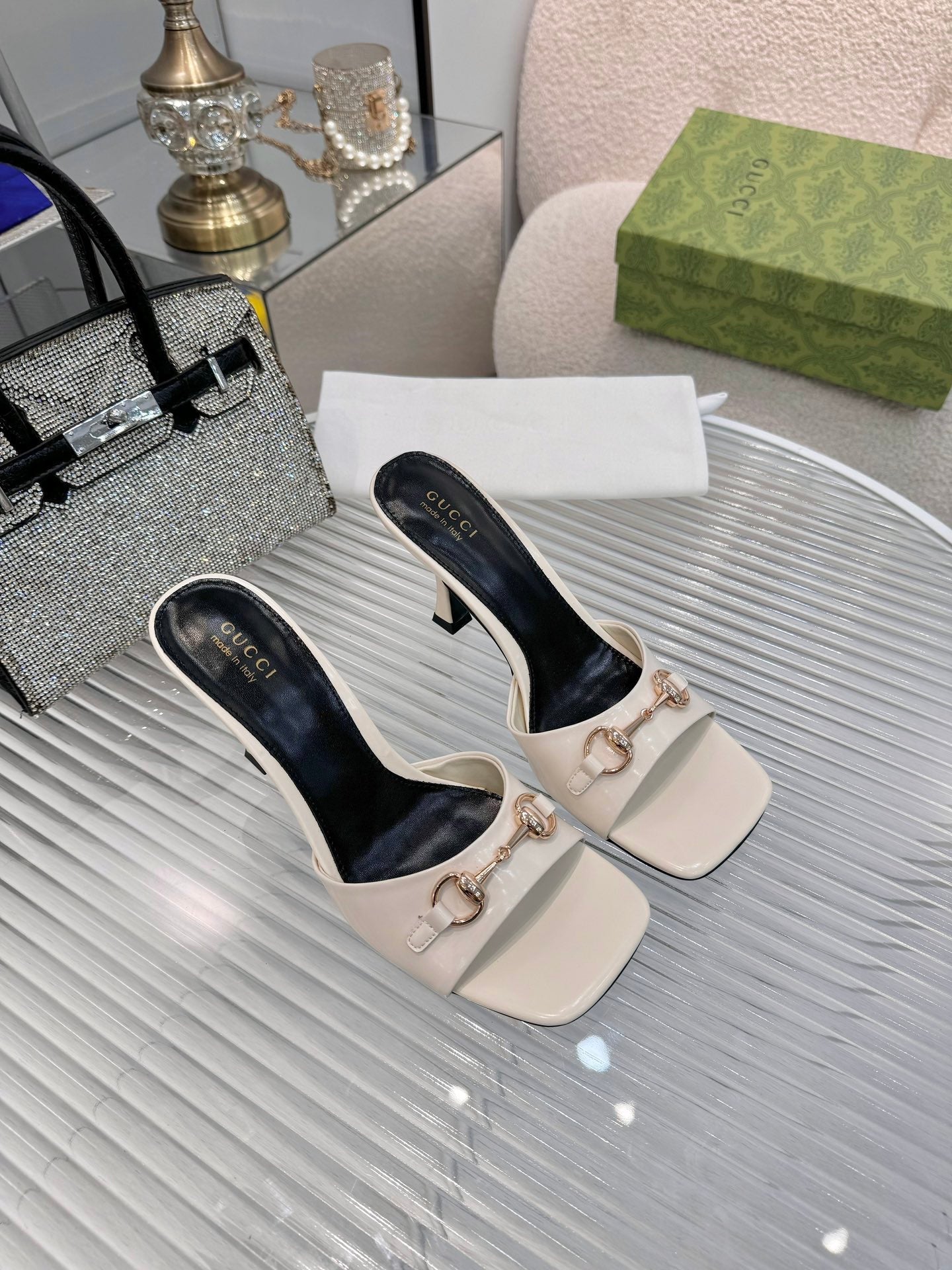 GG Gold Buckle Slide Sandal 80mm White Patent Leather 457562