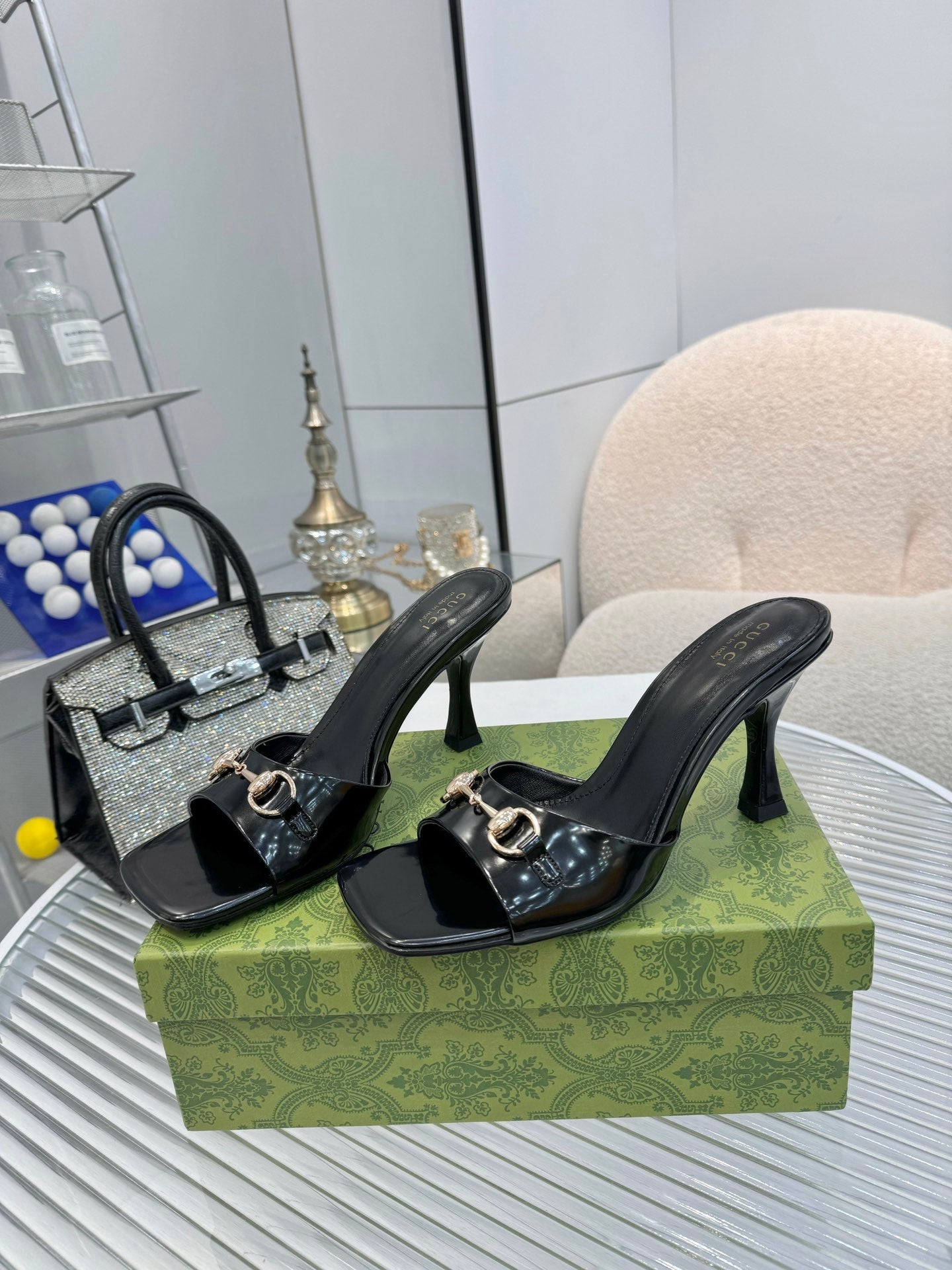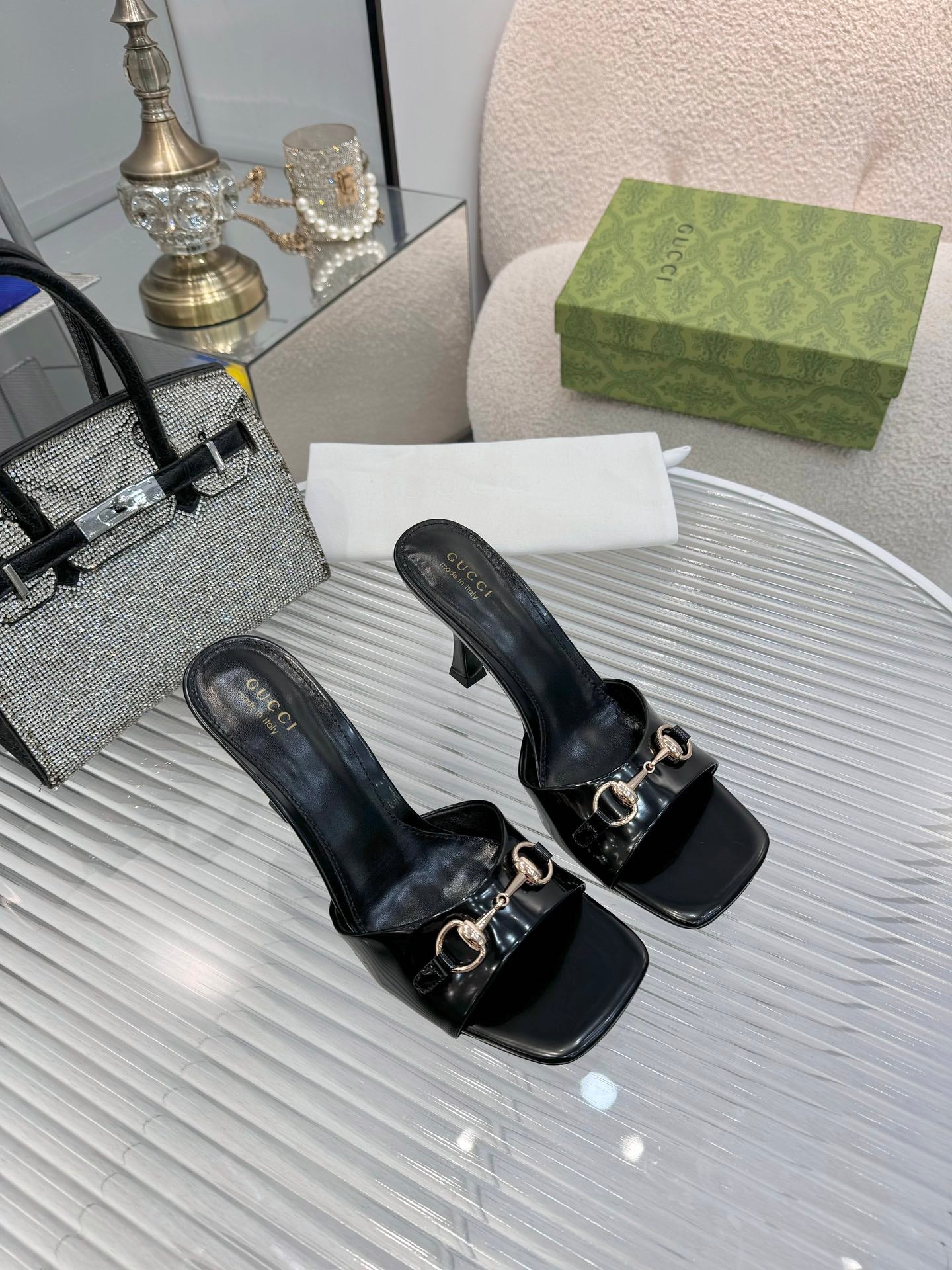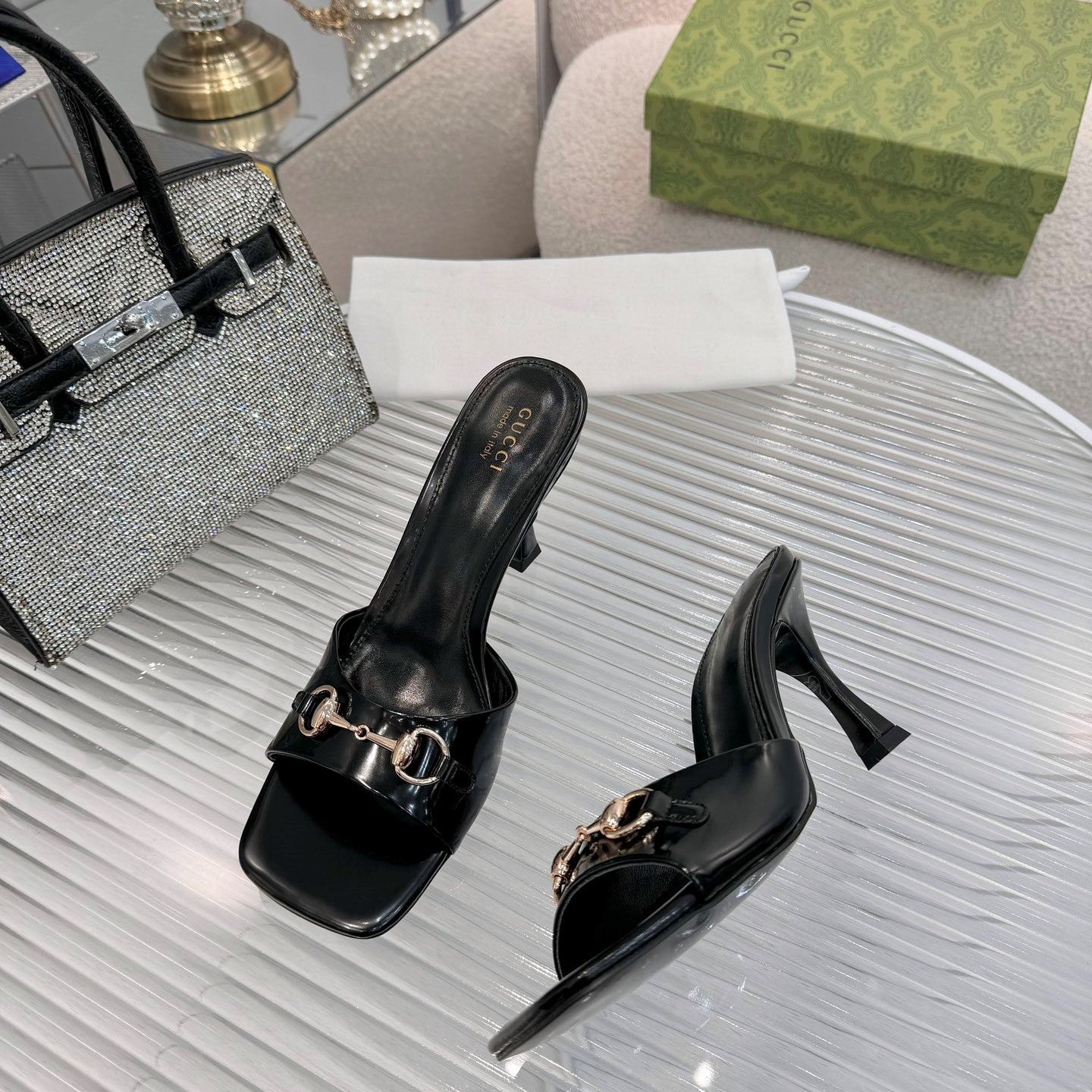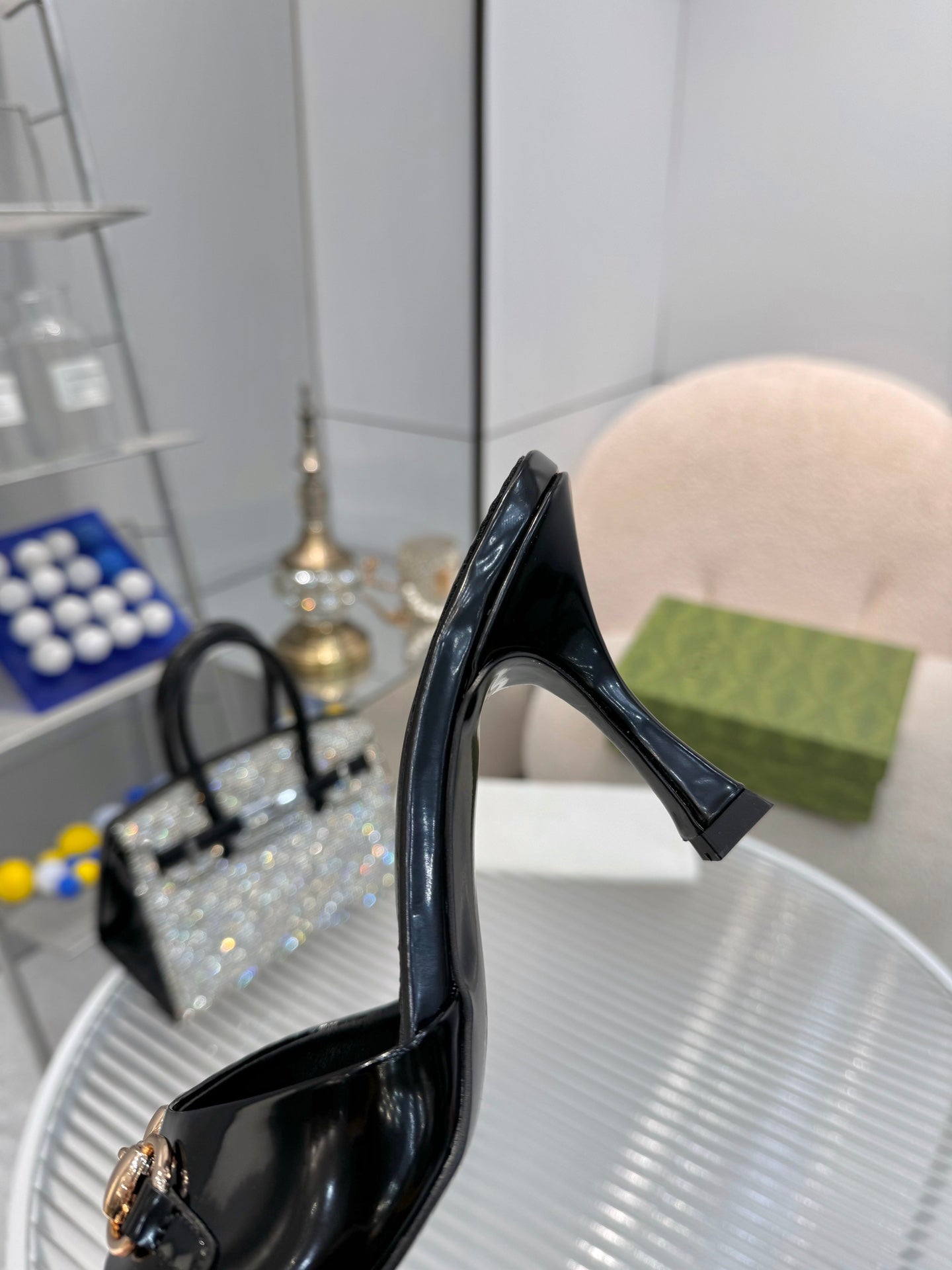 GG Gold Buckle Slide Sandal 80mm Black Patent Leather 457565