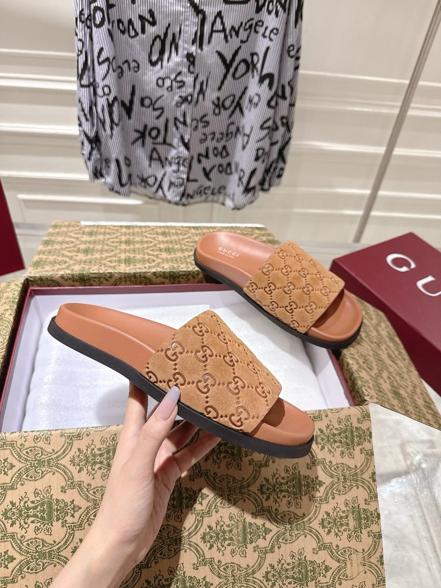 GG SLIDES IN BURNT ORANGE SUEDE WITH EMBOSSED LOGO STYLE 5