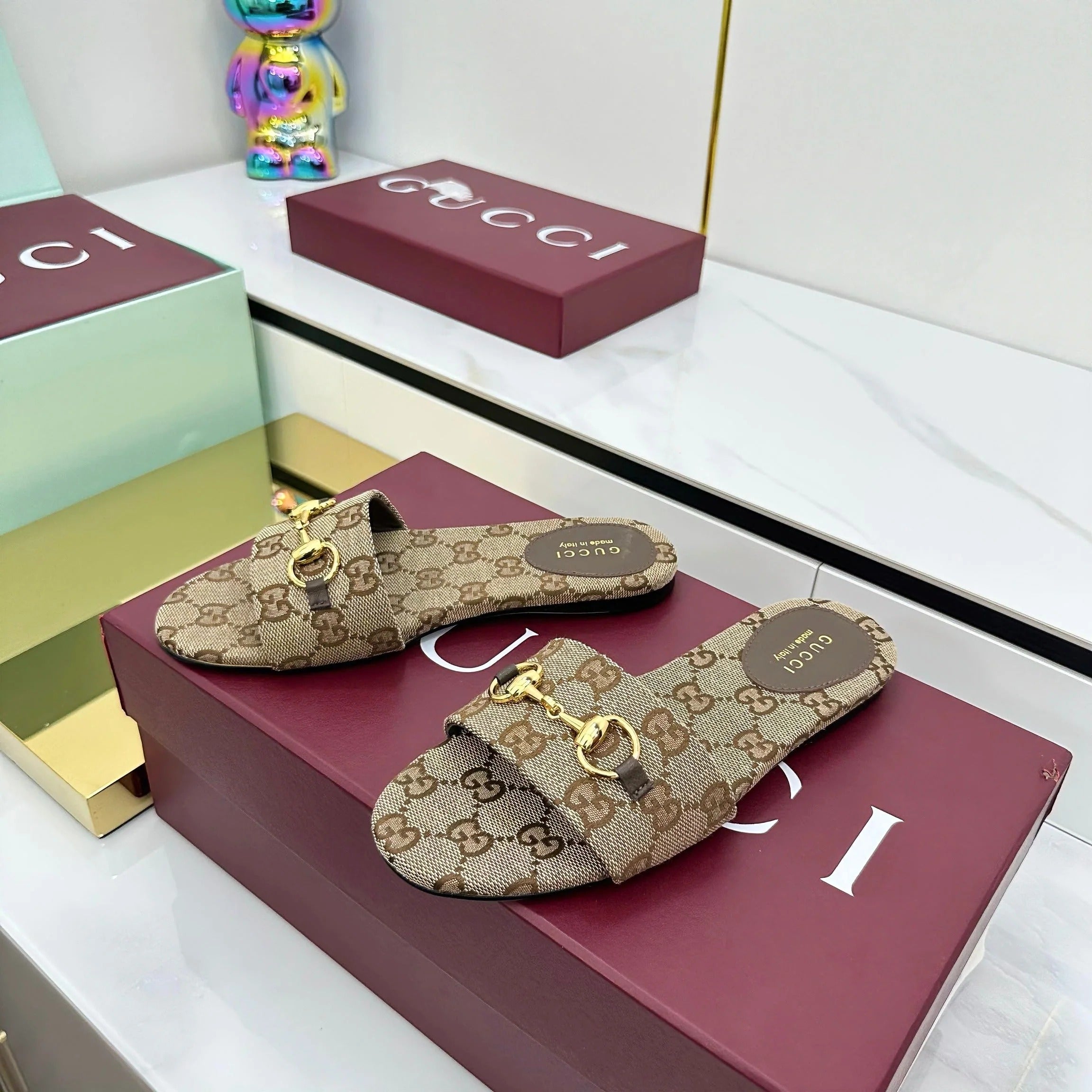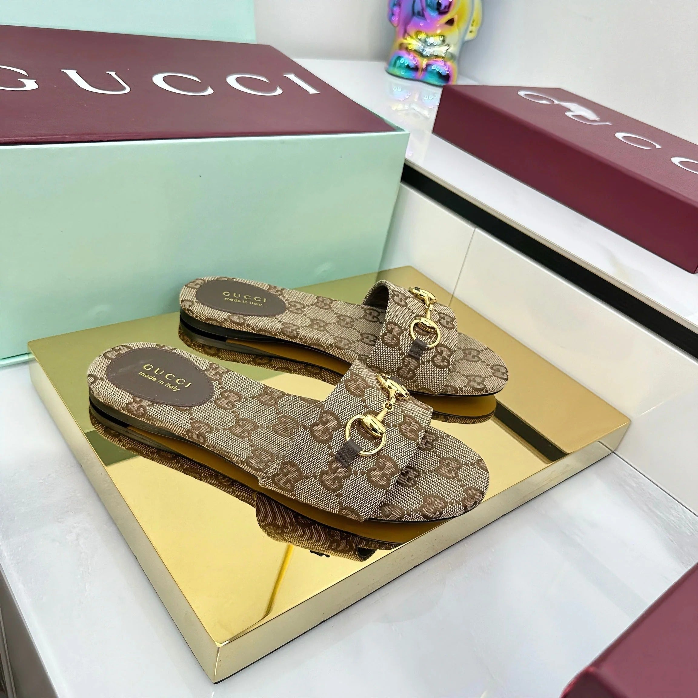 GG SLIDES IN DARK BEIGE WITH GOLD HARDWARE