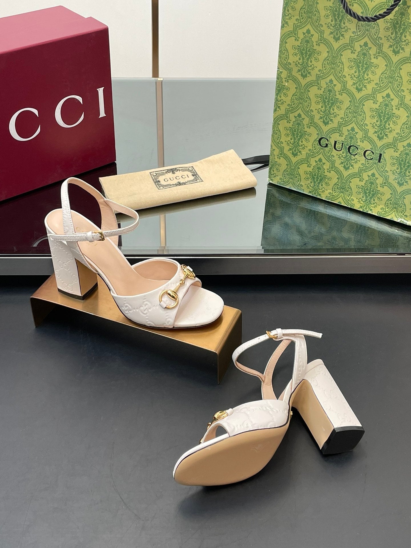 GG Women Horsebit Embossed High Heel Sandal Open Toe Cream Sheepskin 149223