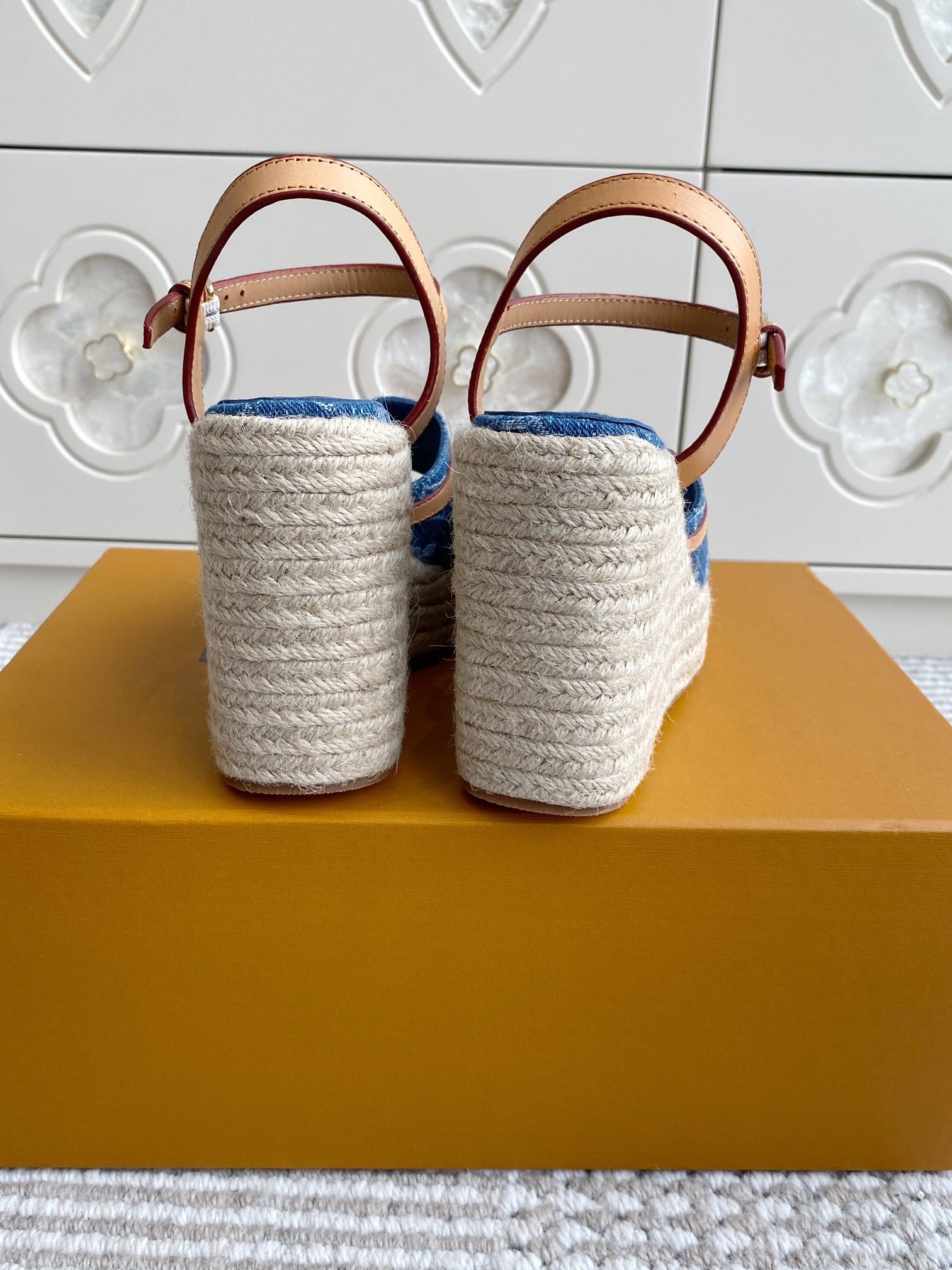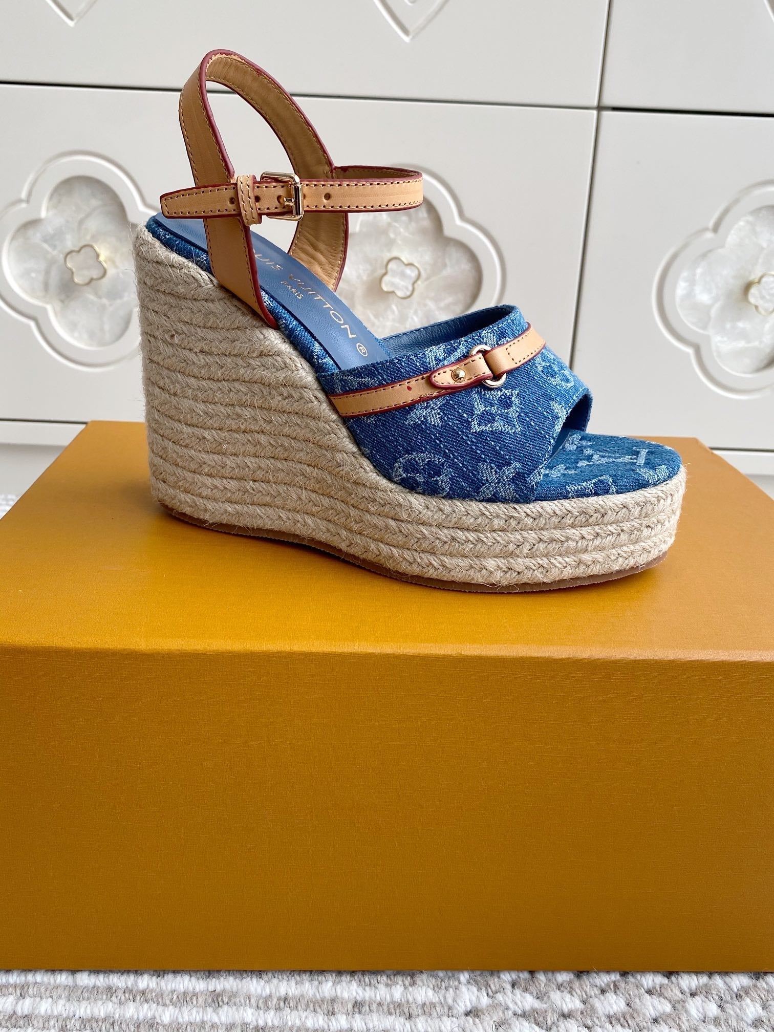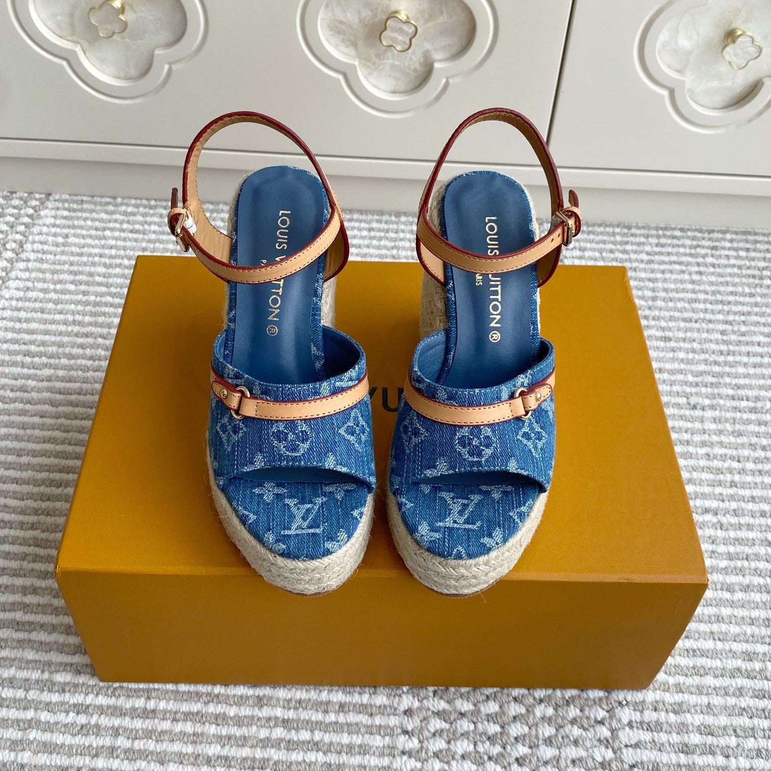 LV Blue Denim Monogram Wedge Sandals 11.5cm Blue Sheepskin Lining 291580