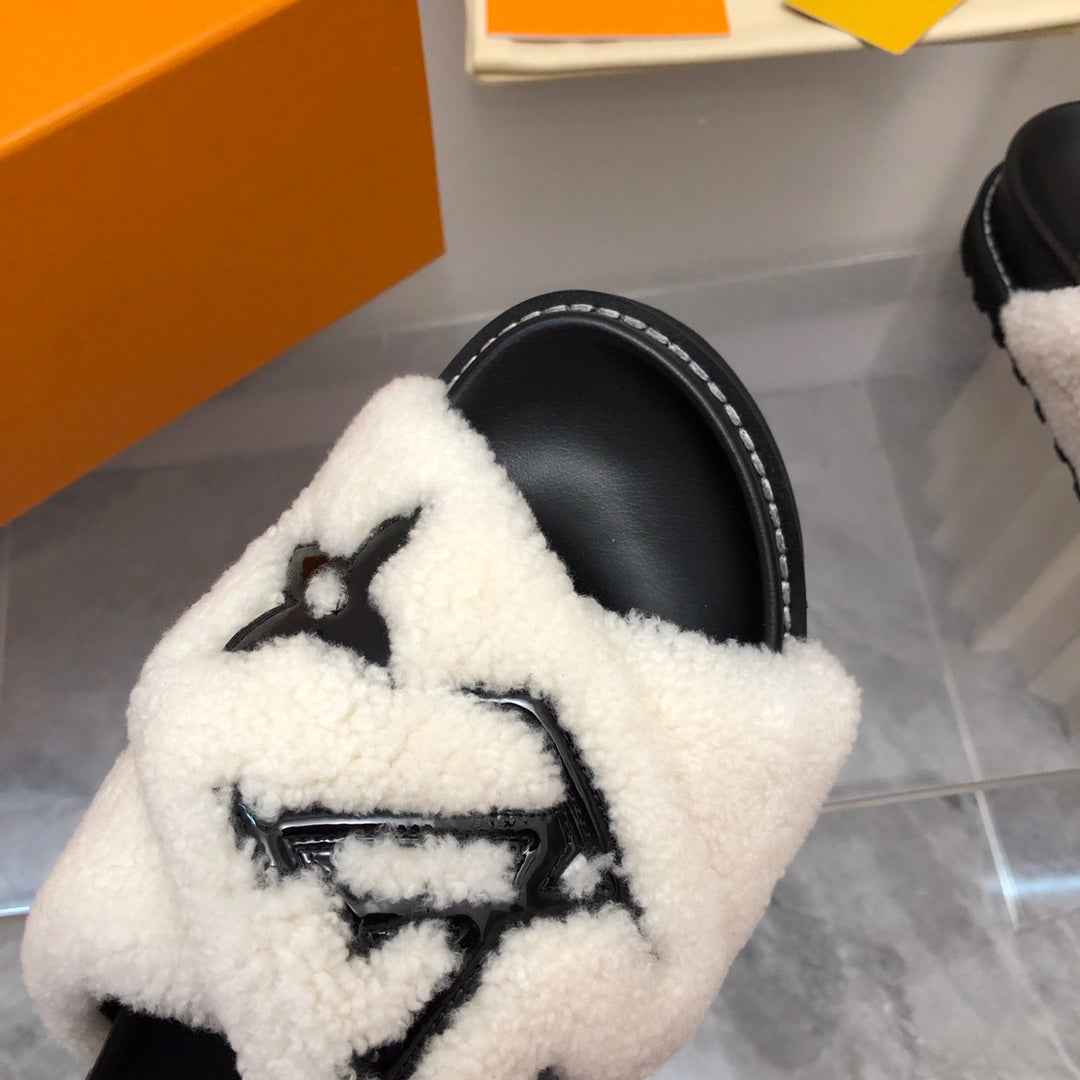 LV Paseo Flat Comfort Mule White Black Fleece