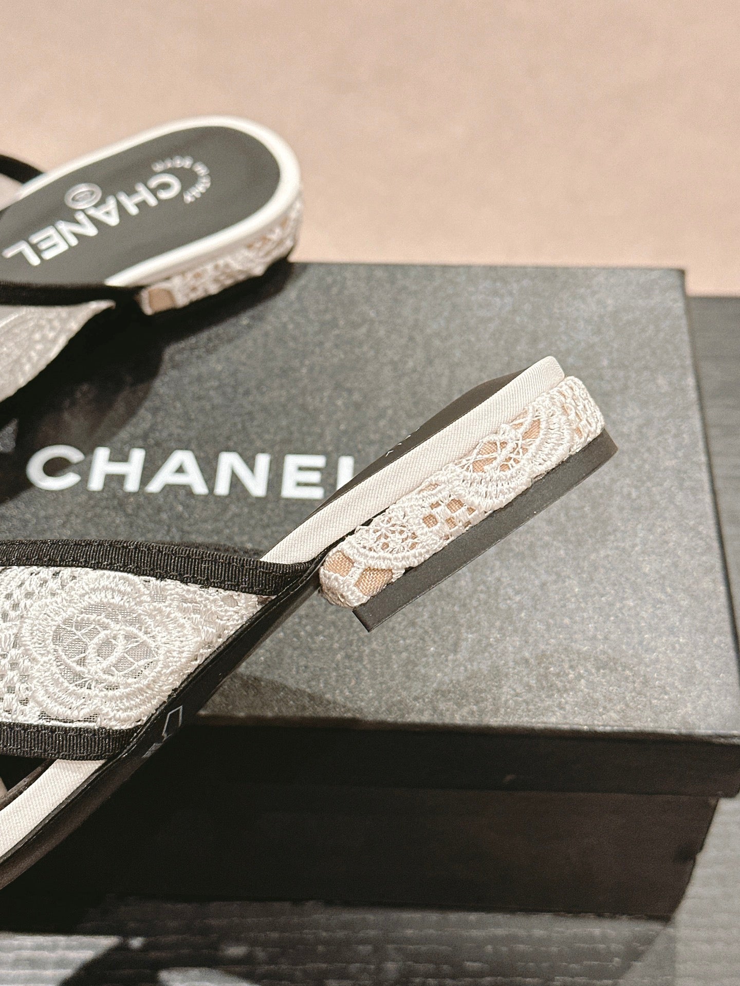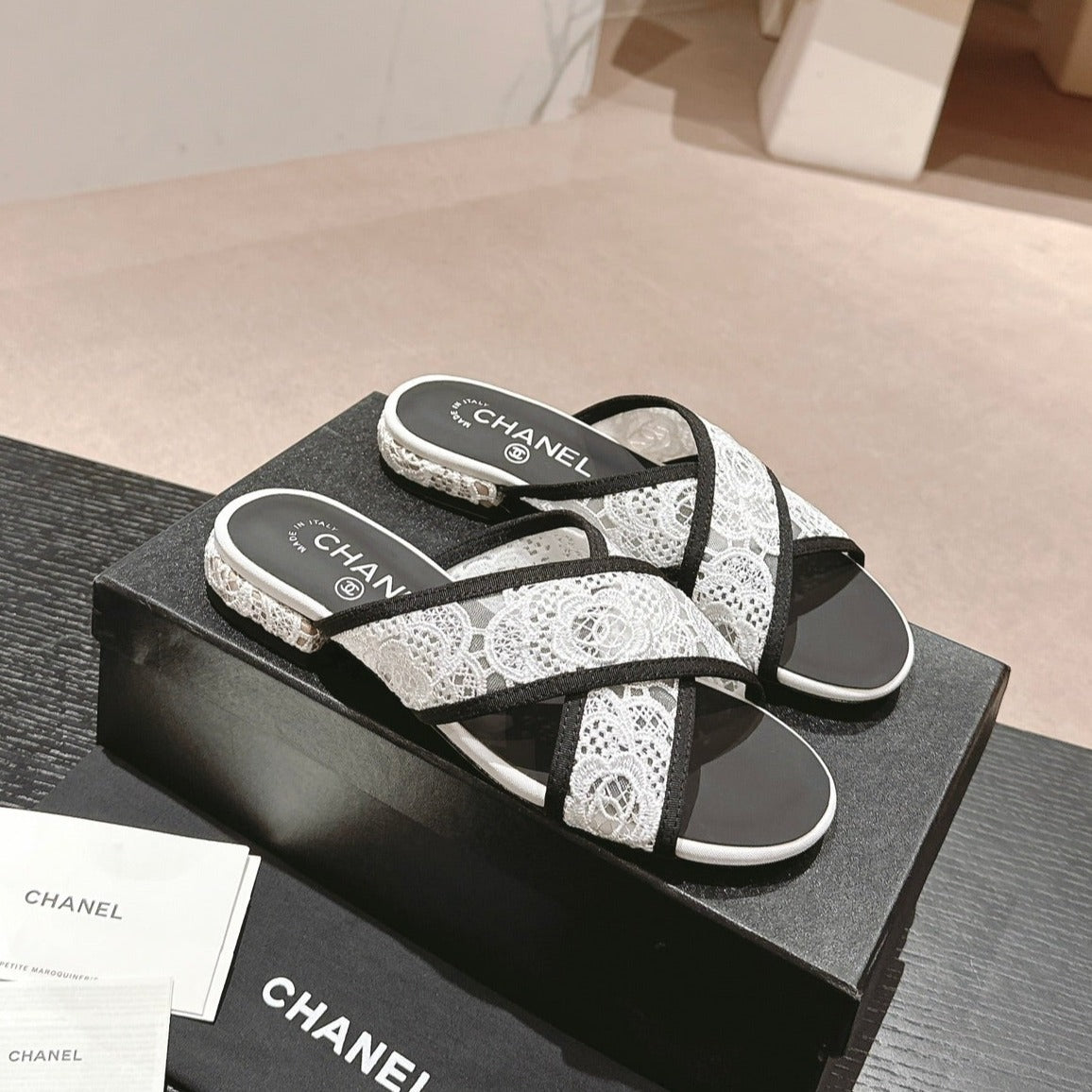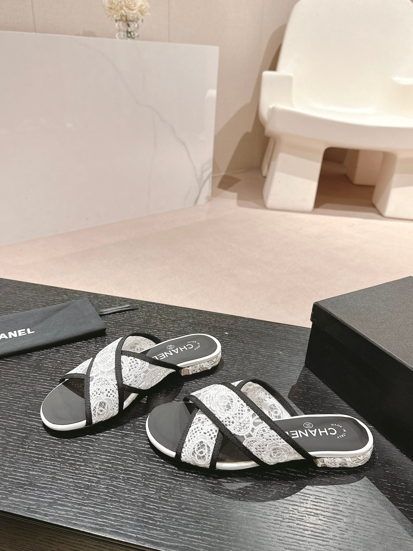 mule sandal cross white lace fabric