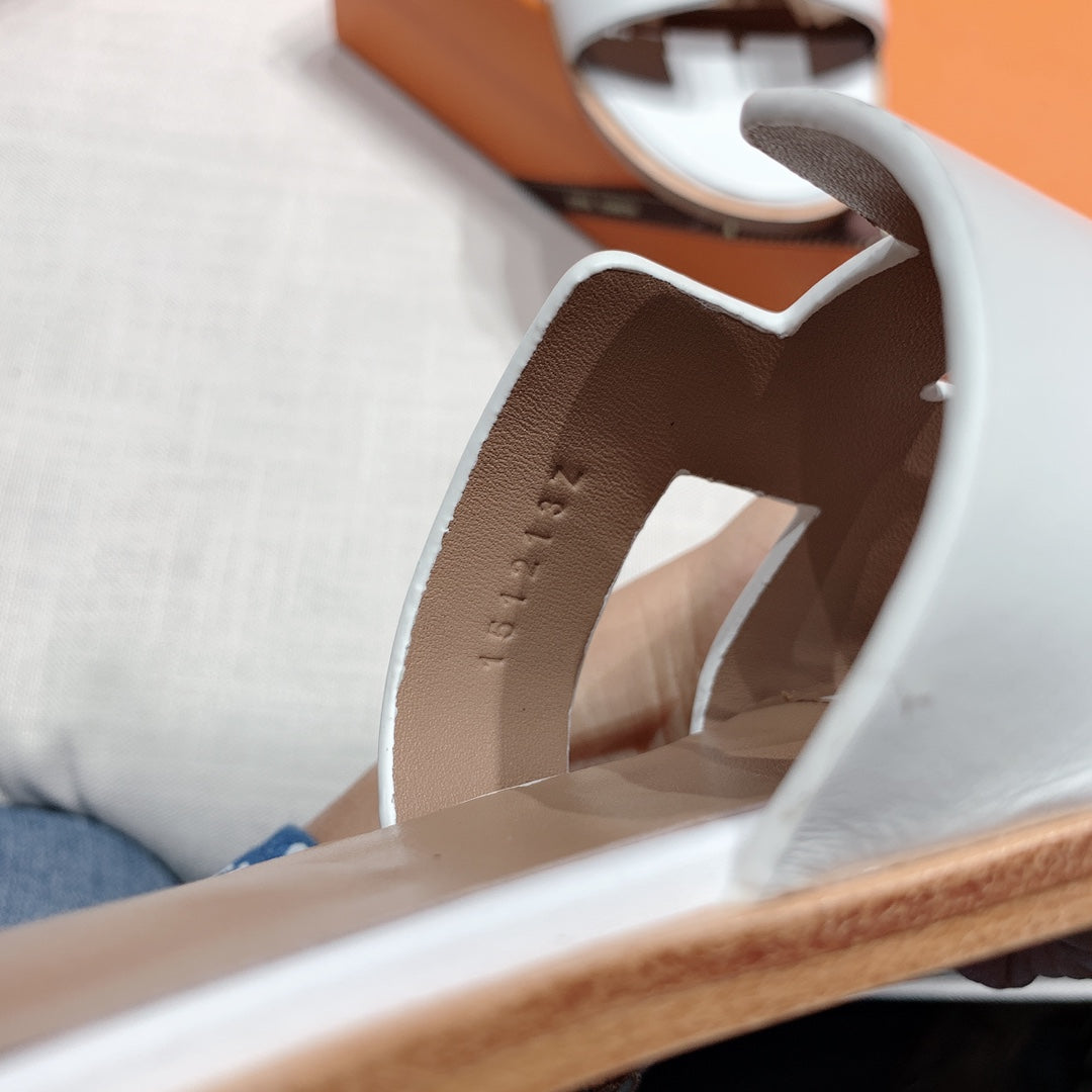 - Material: Sandal in Epsom leather with straight cut edges, "H" cut-out detail and thin ankle strap.