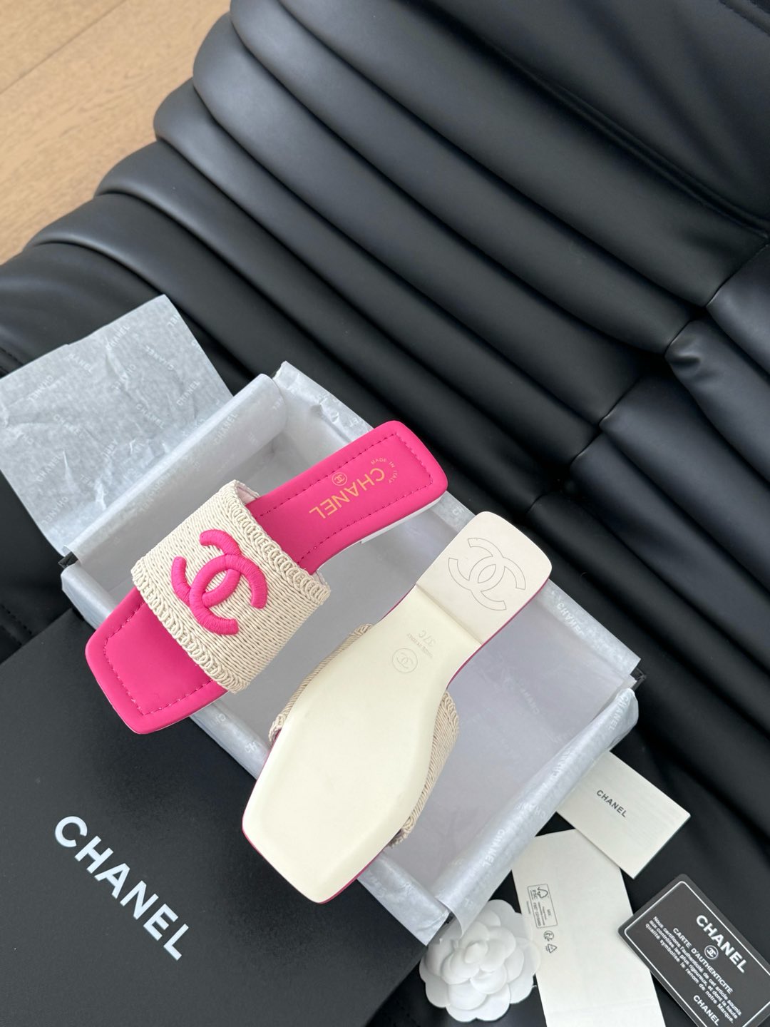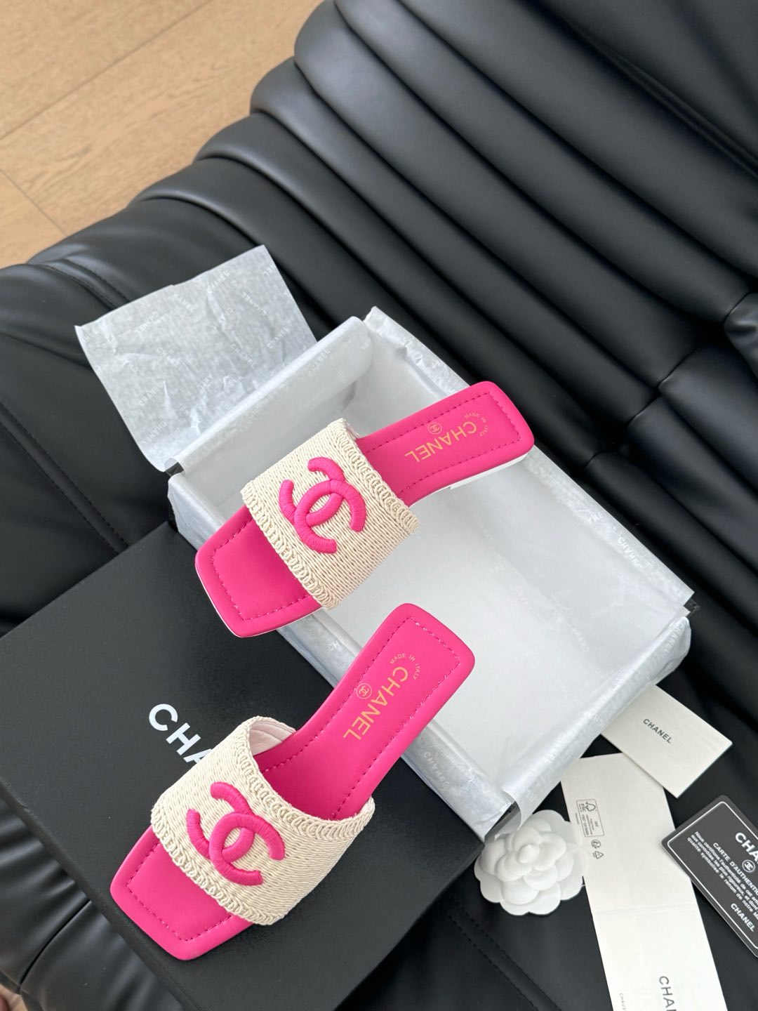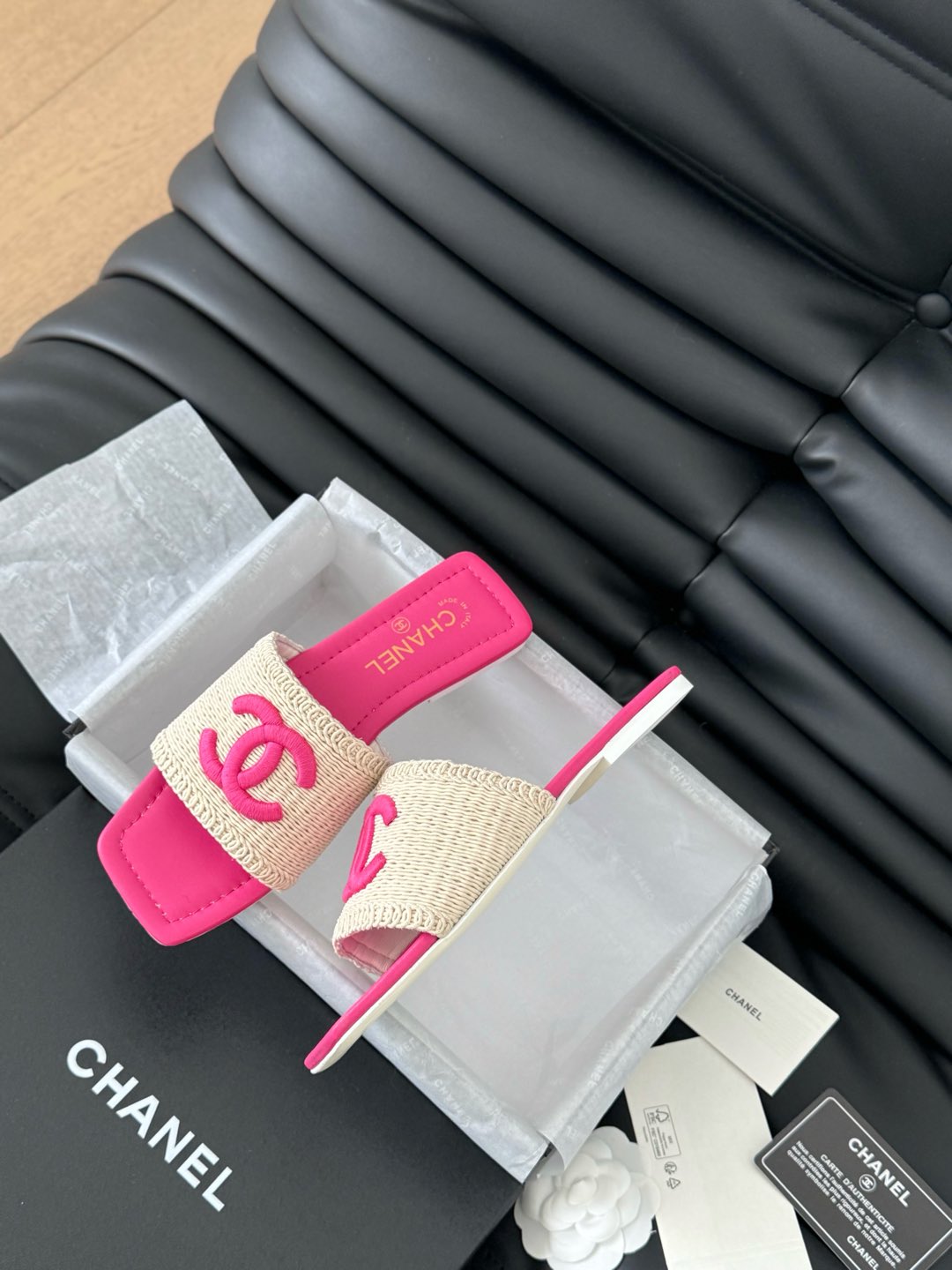 WOVEN SLIDE IN RAFFIA AND BRIGHT PINK LAMBSKIN
