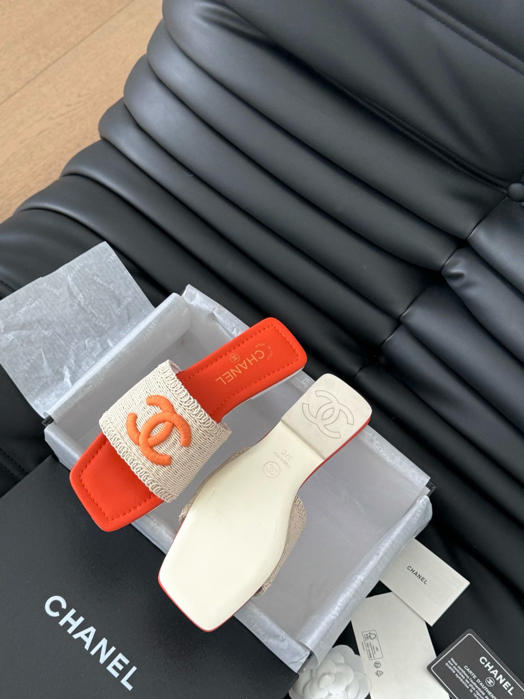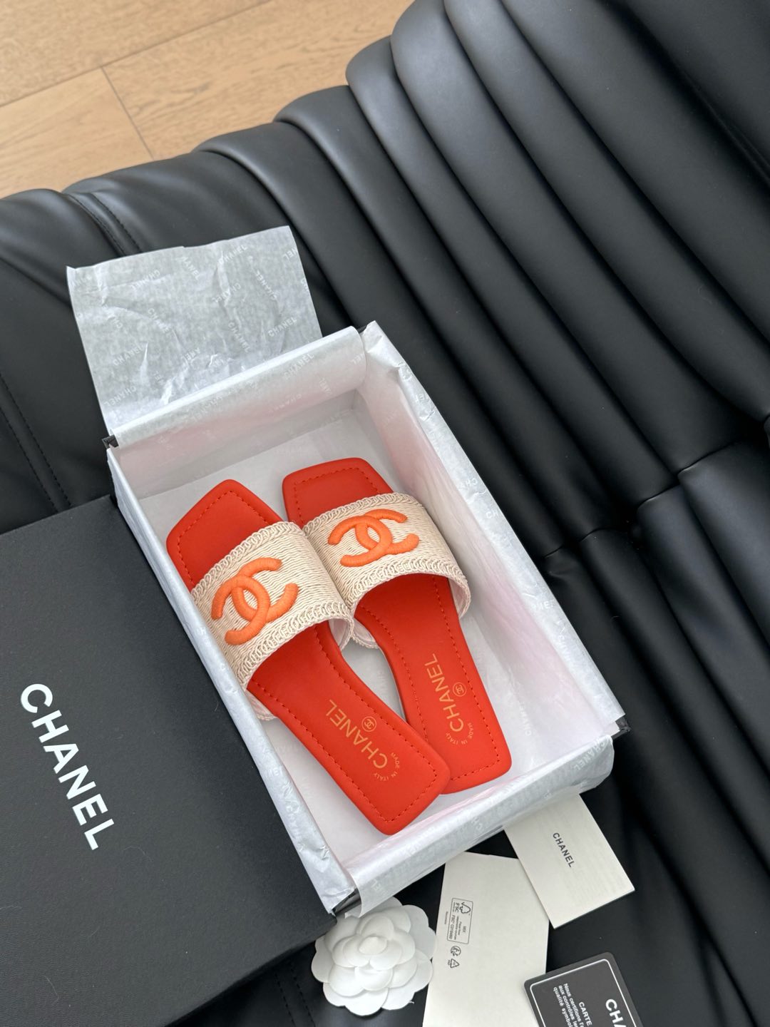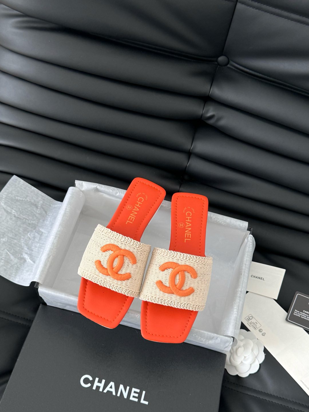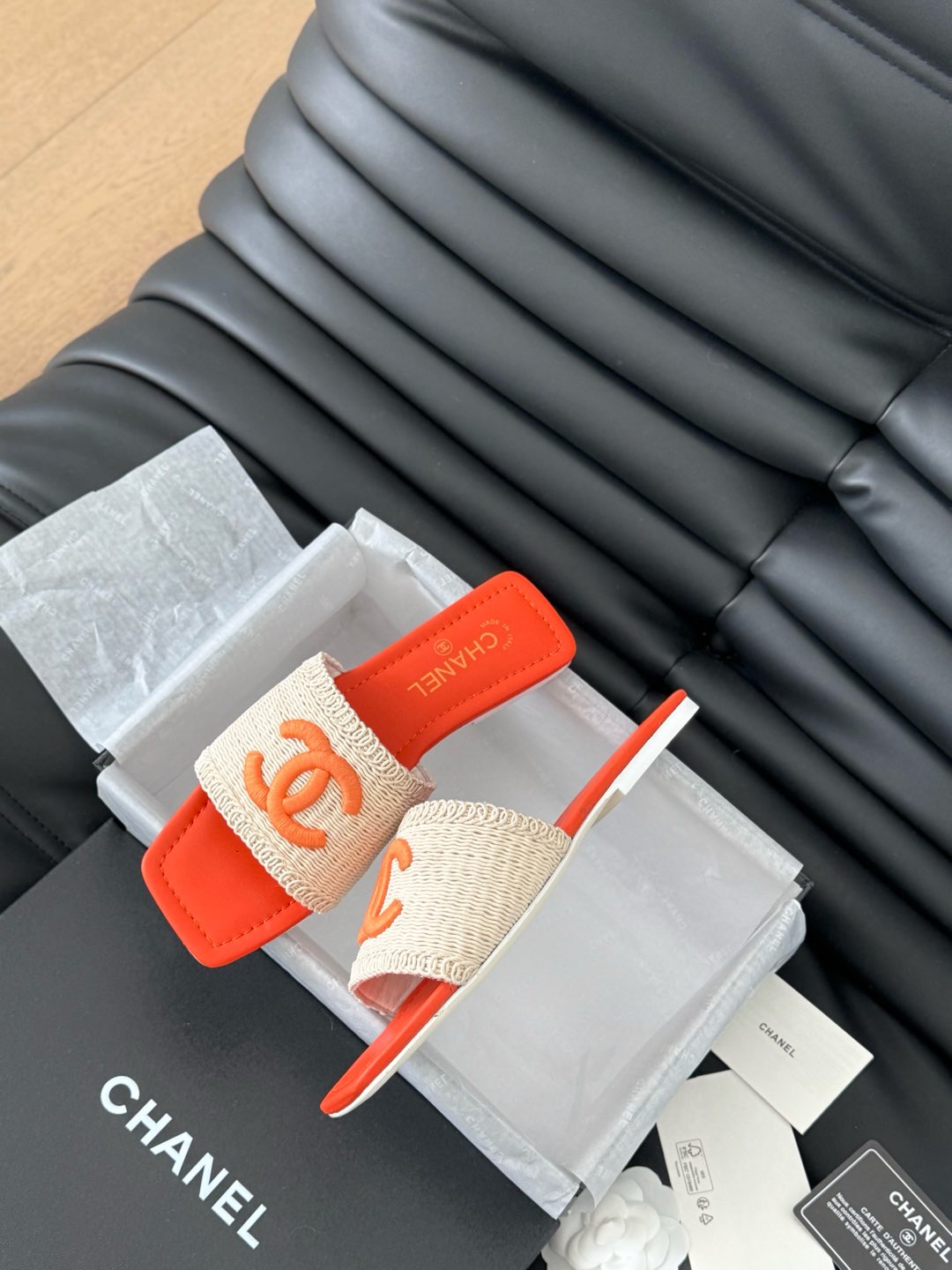 WOVEN SLIDE IN RAFFIA AND VIVID ORANGE LAMBSKIN