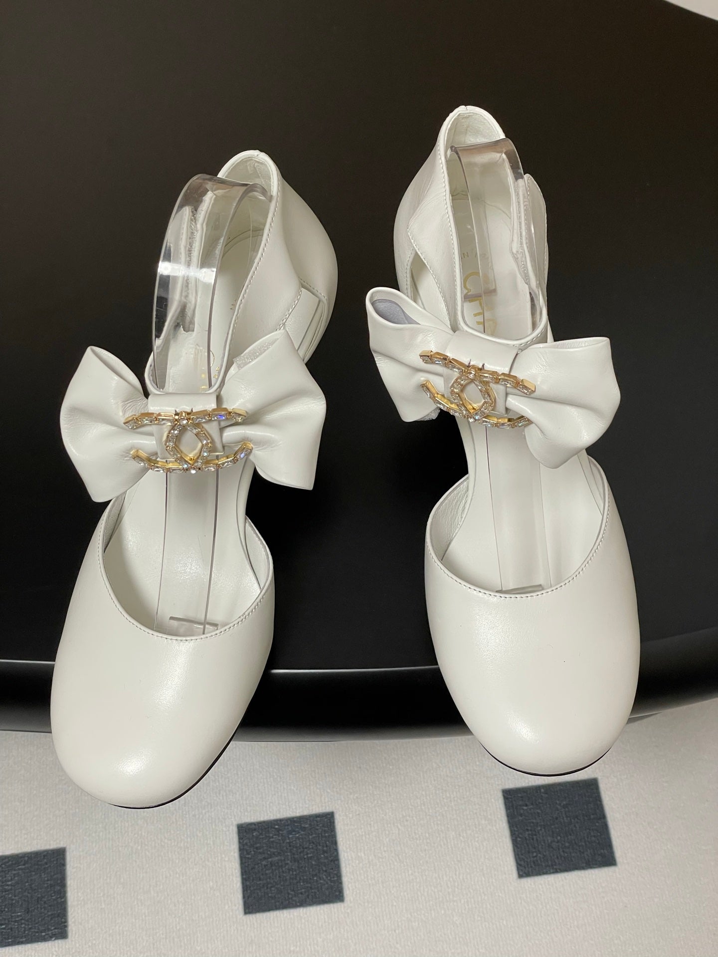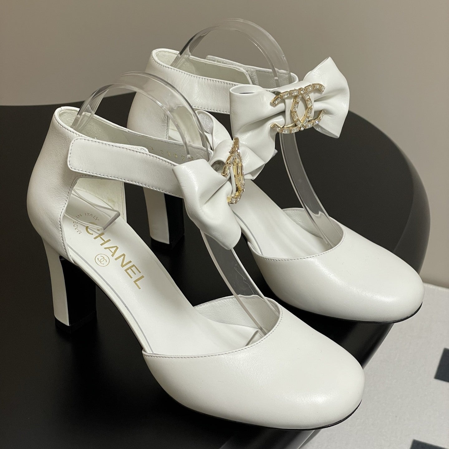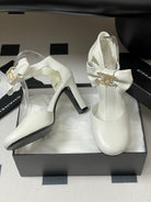 CC 25S Double C Rhinestone Buckle Bow High Heel Pump 85 White Sheepskin 247572