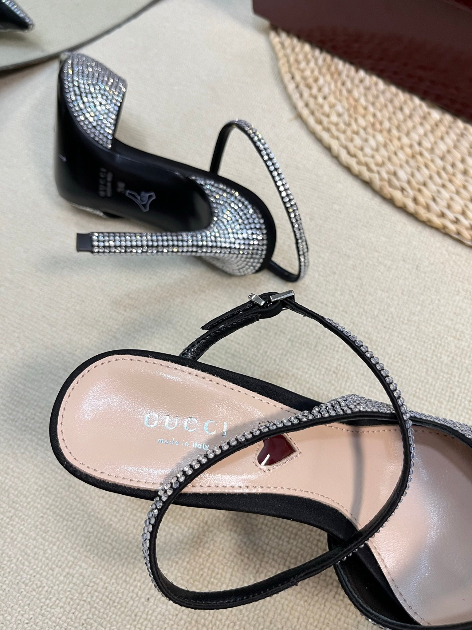 GC Crystal-Embellished Slingbacks Black Silk Sheepskin 294611