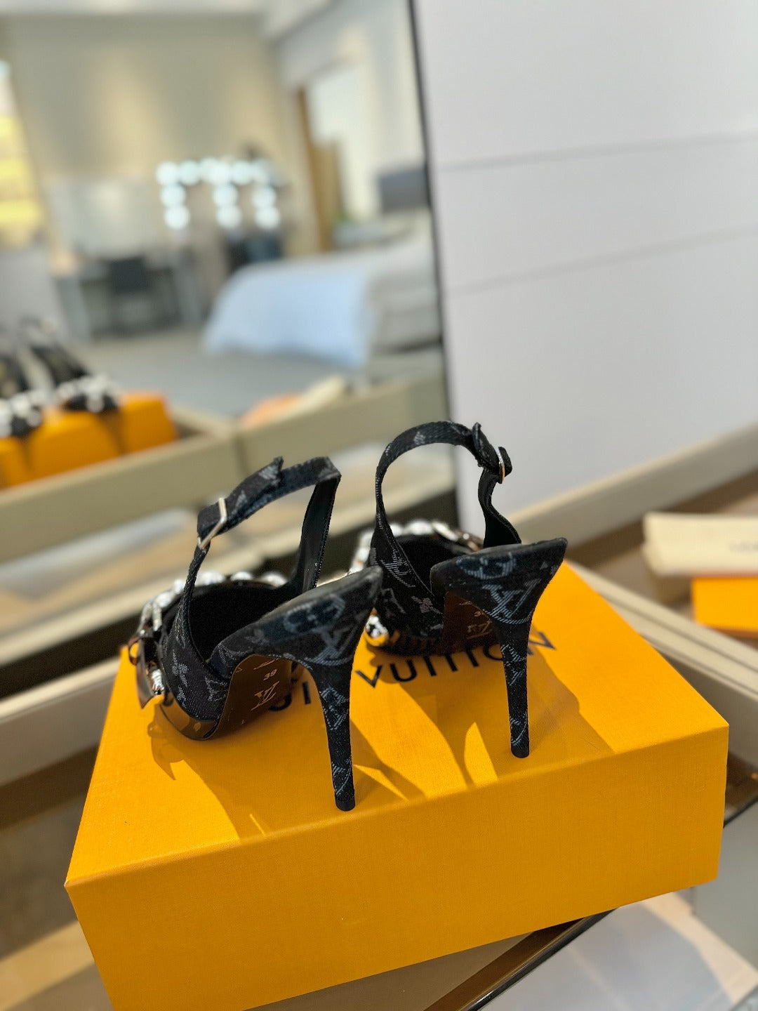 HIGH HEELS 95 MM IN BLACK MONOGRAM DENIM WITH CRYSTALS