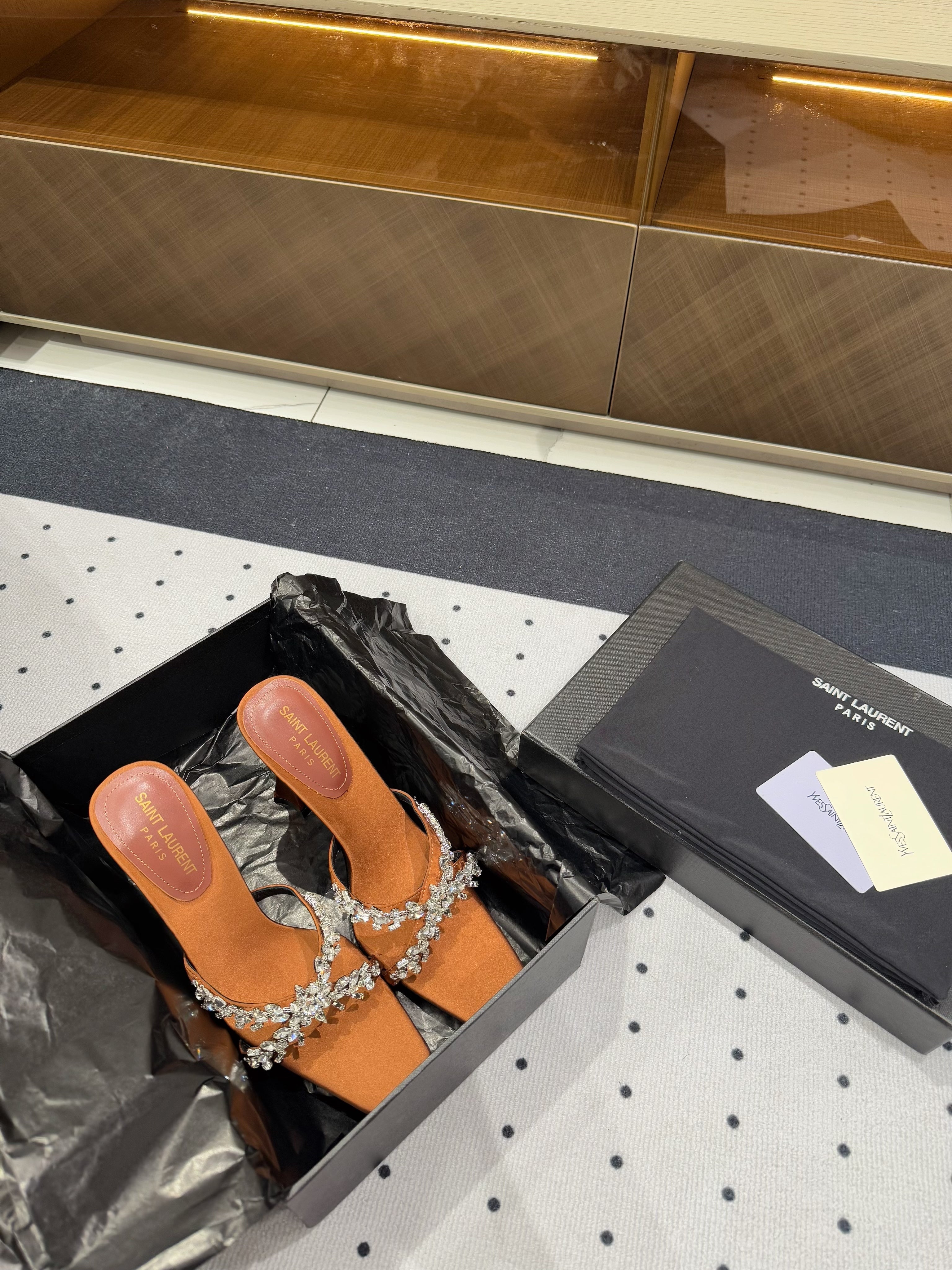 HIGH RHINESTONE CROSS STRAP MULES IN BRONZE BROWN SILK