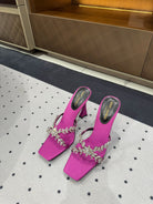HIGH RHINESTONE CROSS STRAP MULES IN MAGENTA PINK SILK