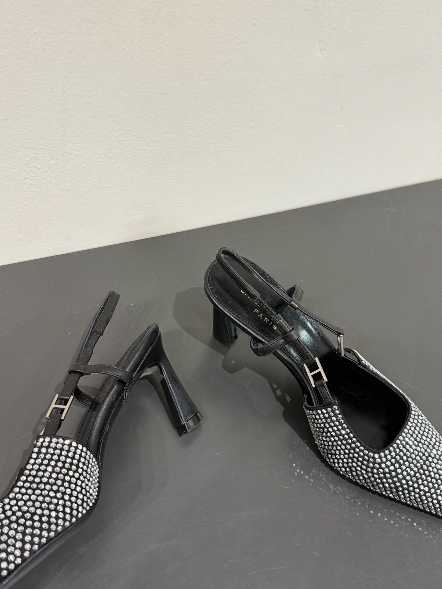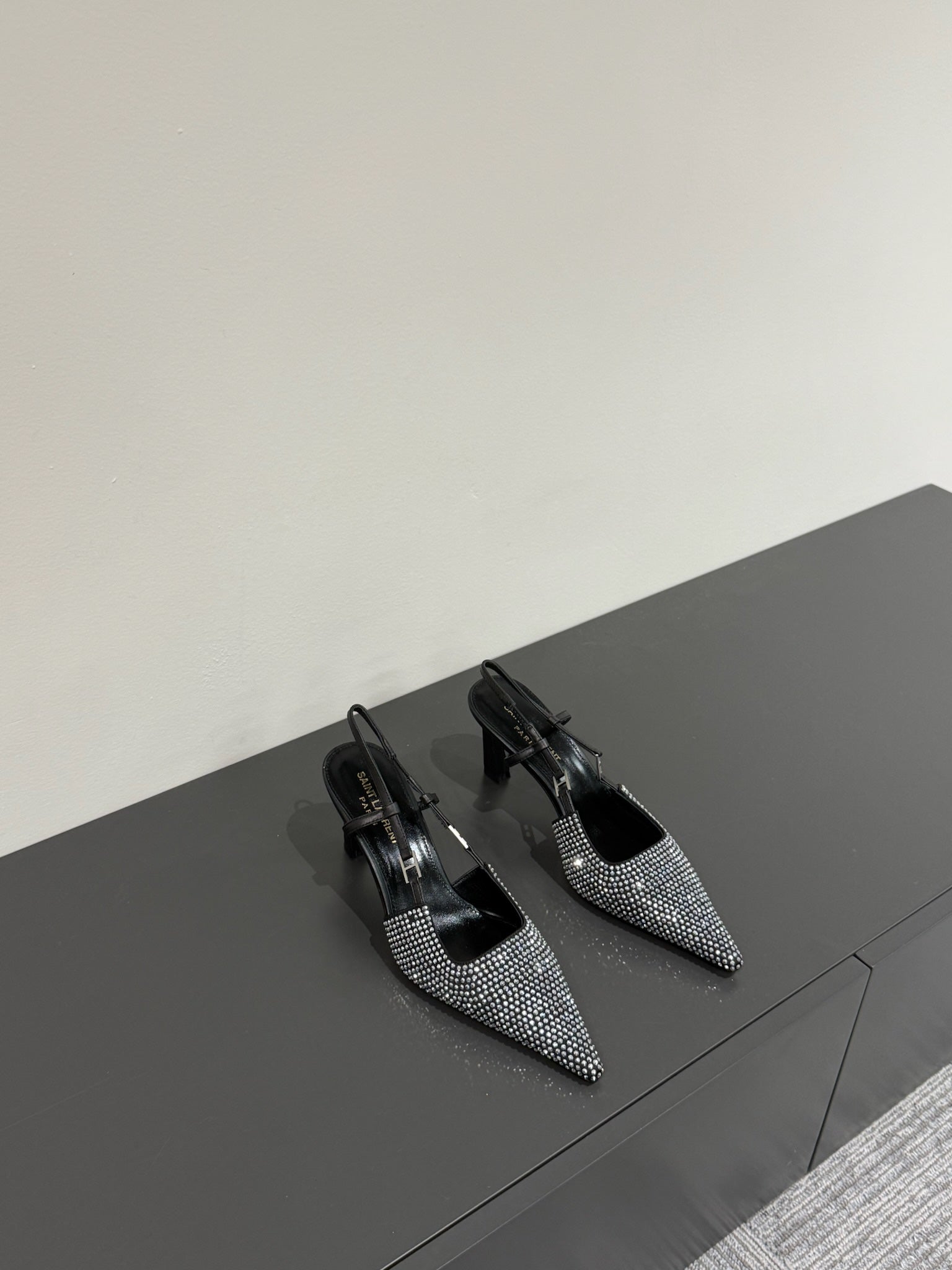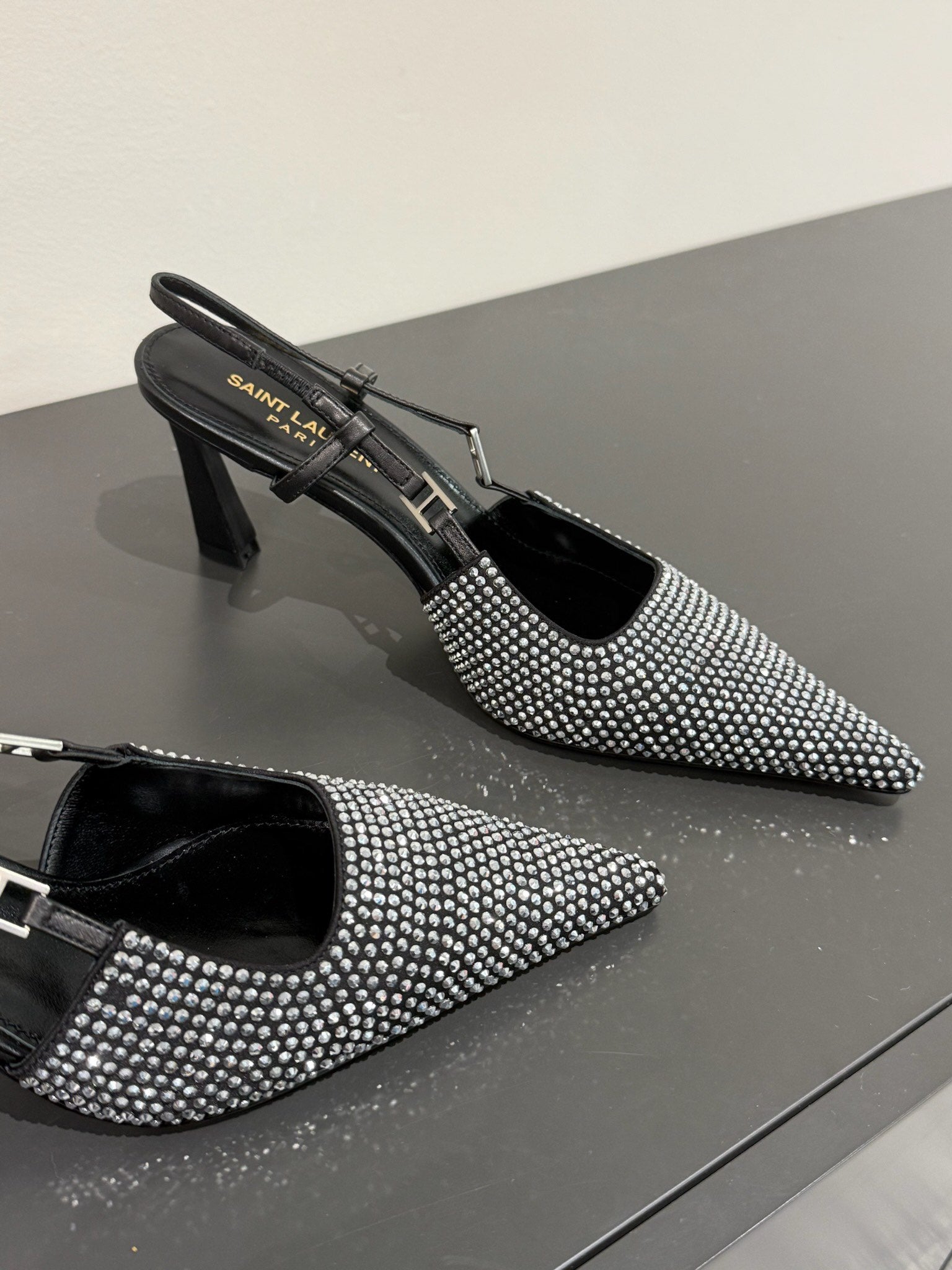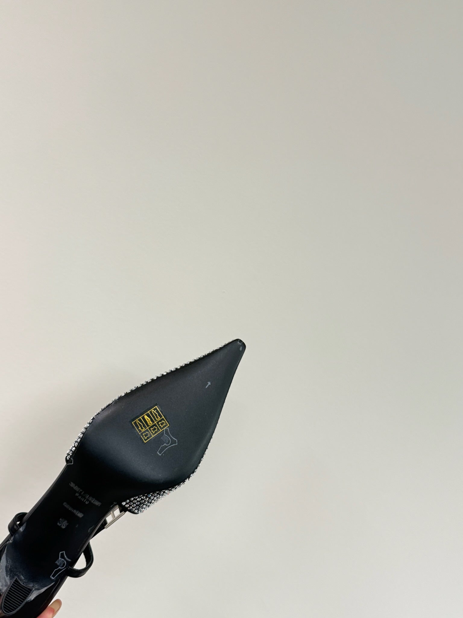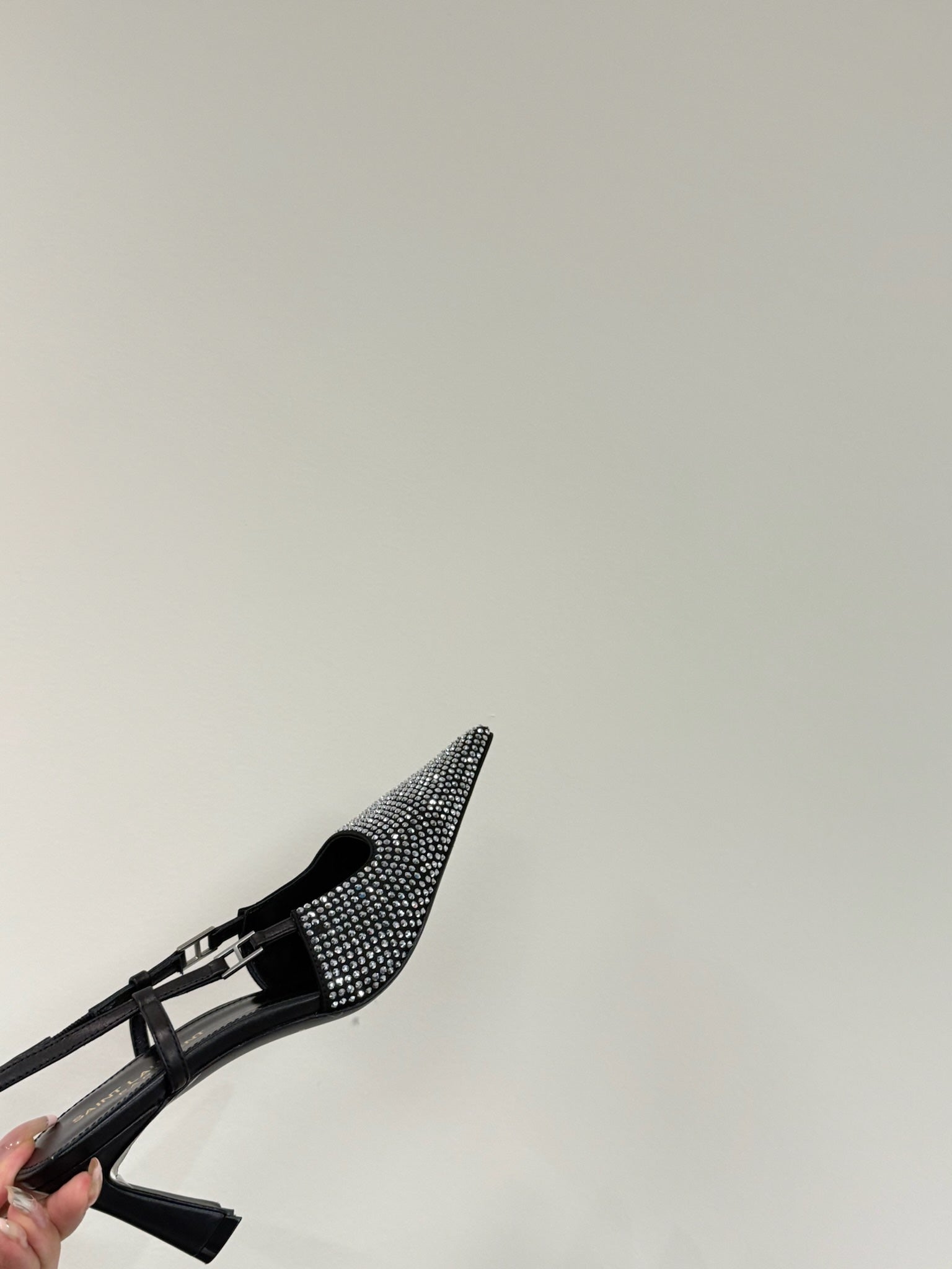 HIGH SLINGBACKS POINTED-TOE IN BLACK LAMBSKIN WITH SILVER CRYSTALS
