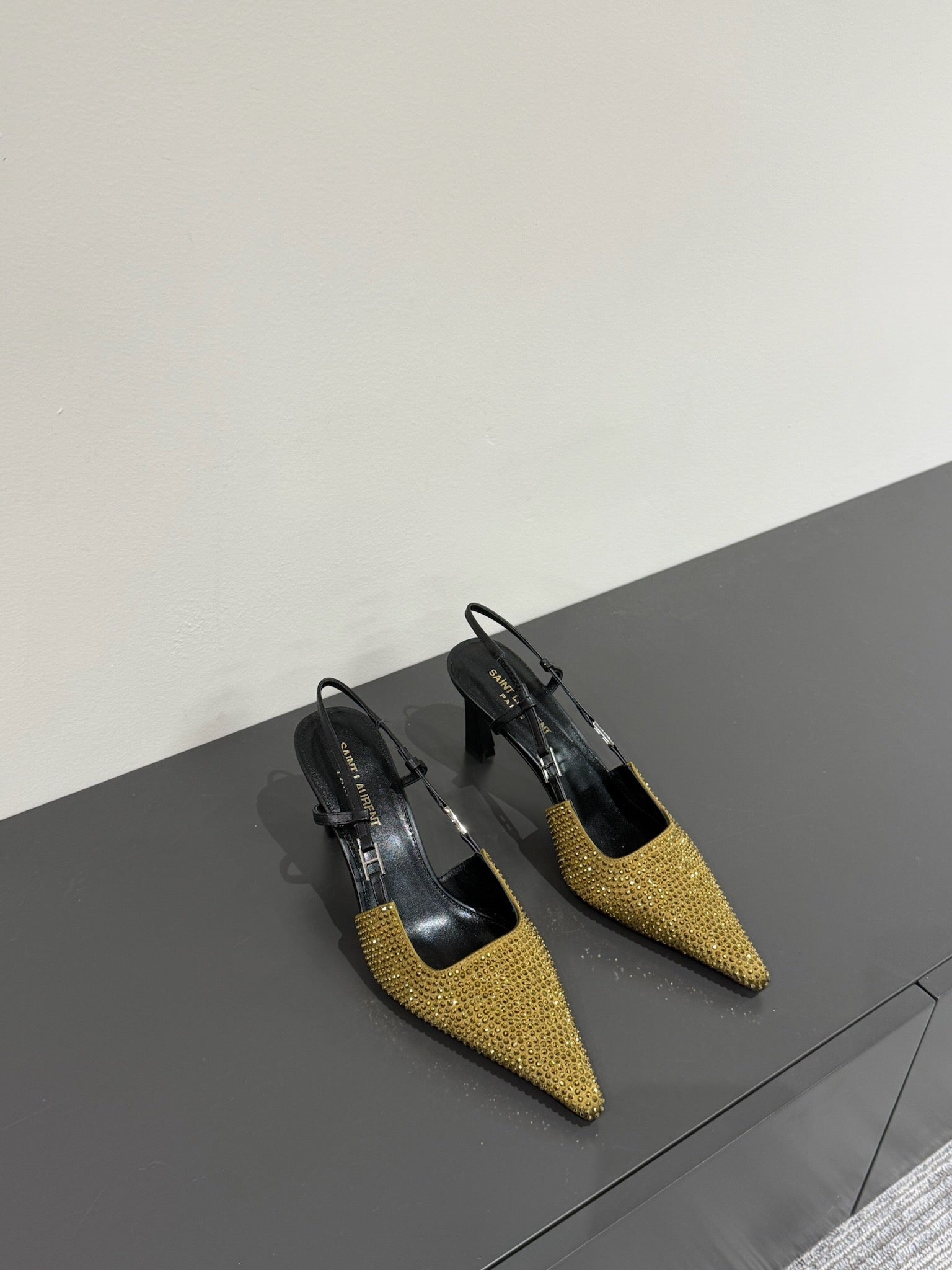 HIGH SLINGBACKS POINTED-TOE IN METALLIC GOLD LAMBSKIN WITH CRYSTALS