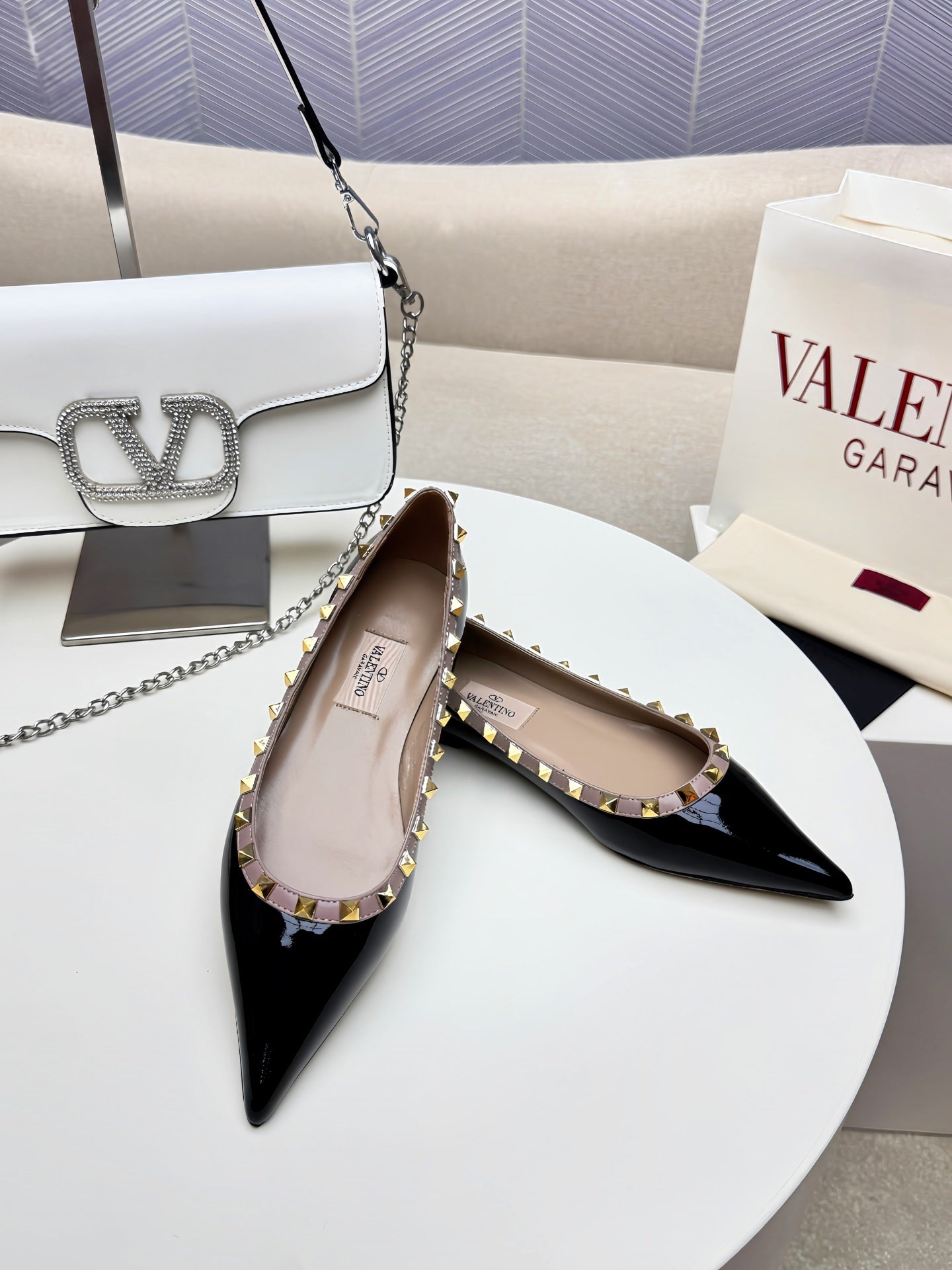 ROCKSTUD FLAT PUMP IN BLACK CALFSKIN