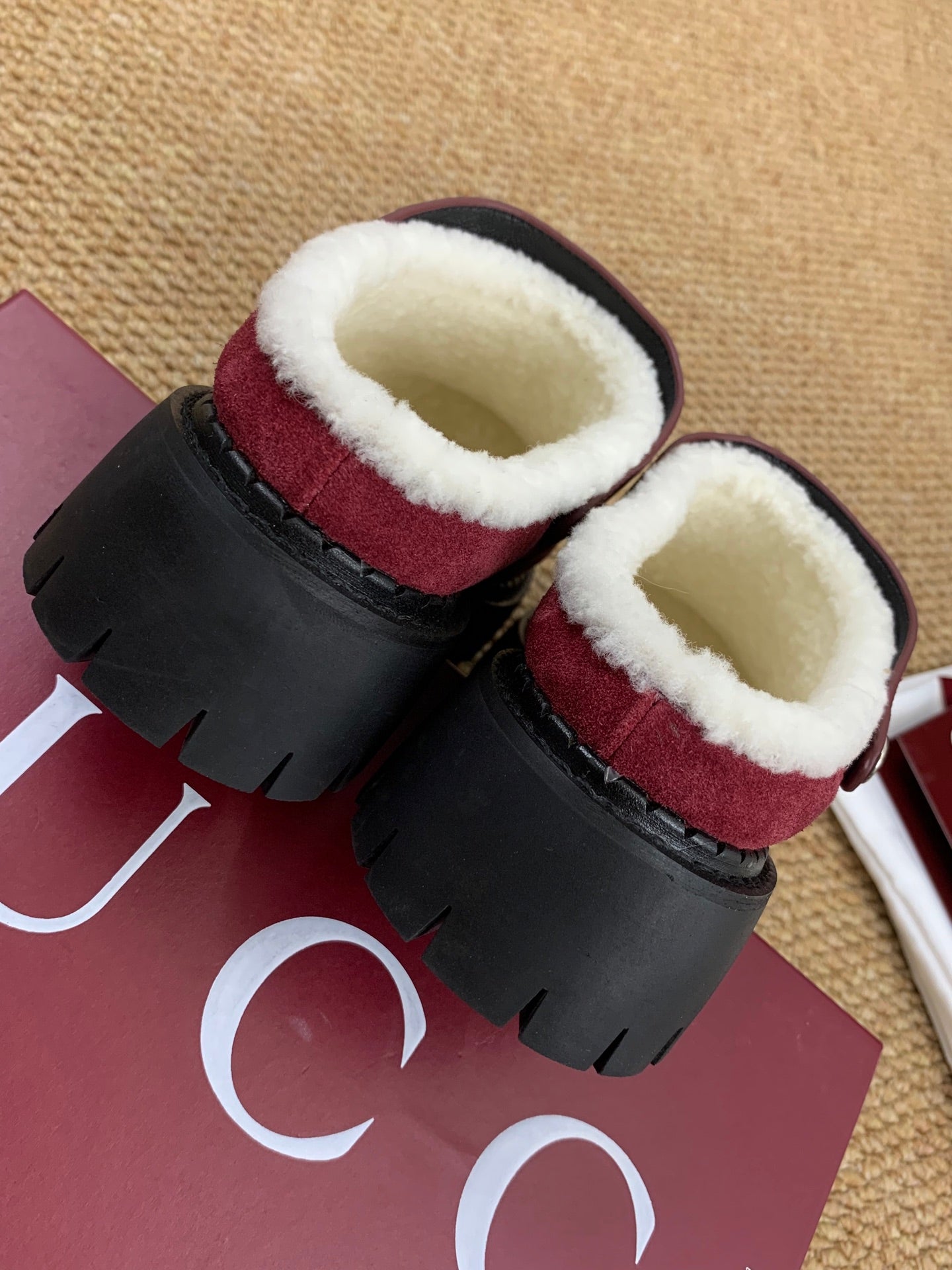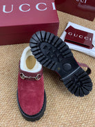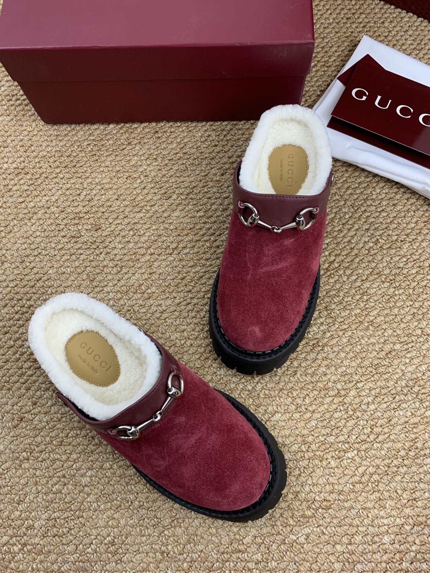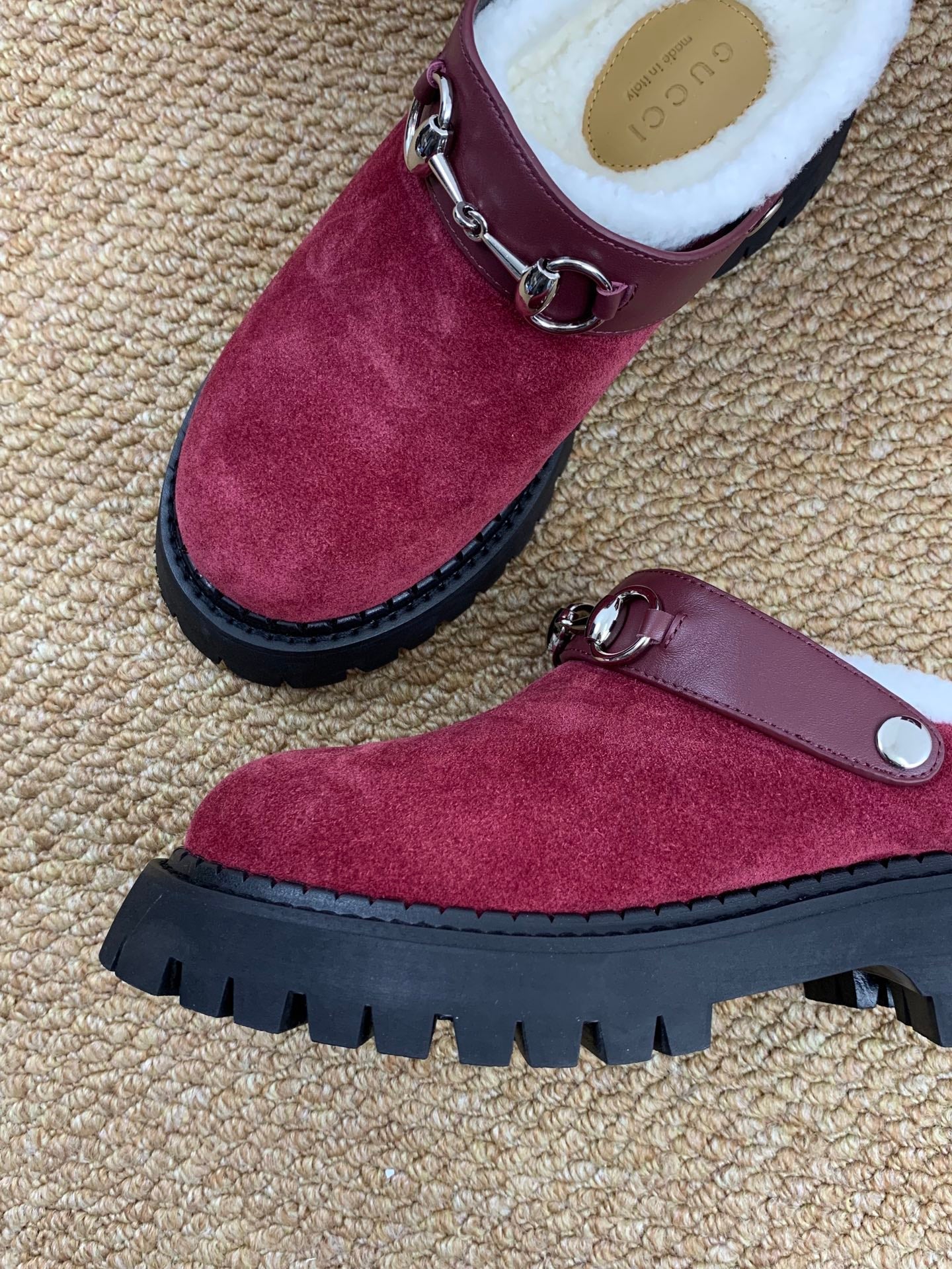 Gucci FW 25 Horsebit Suede Clog Red Suede with Shearling 506447