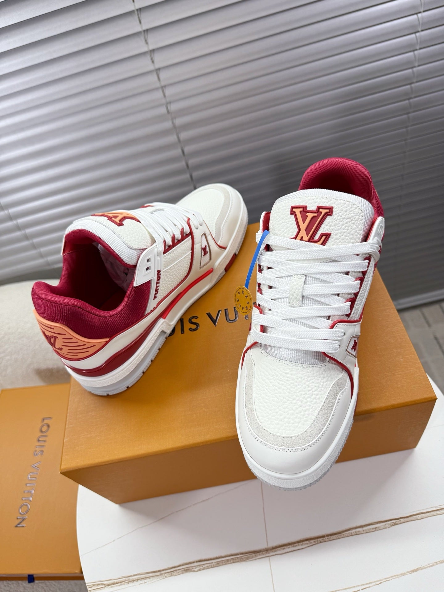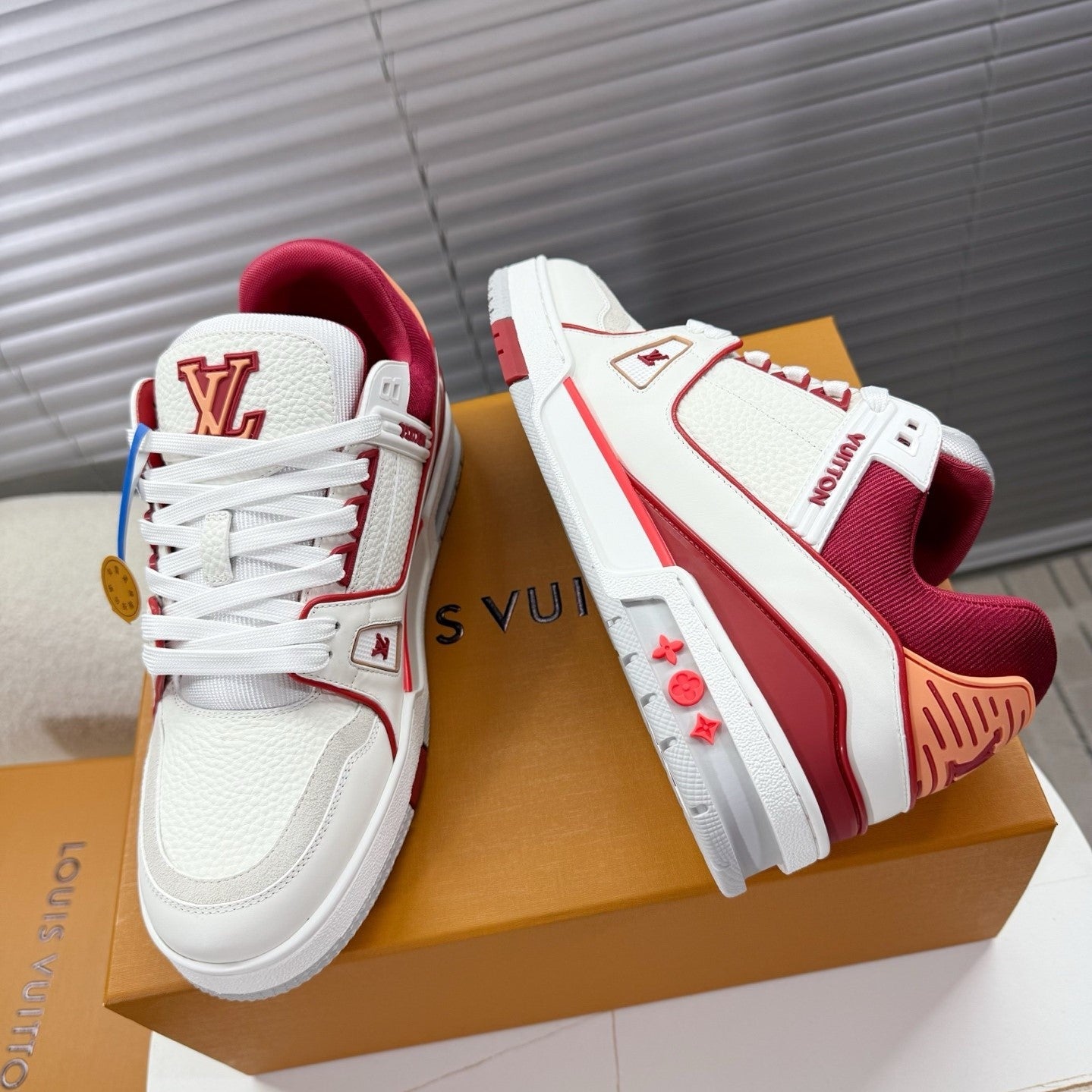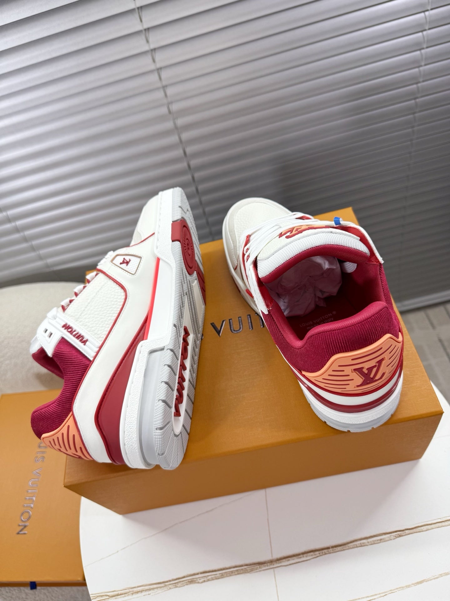 LV 1AIJ41 Trainer Sports Shoes White Red Grained Calfskin 511753